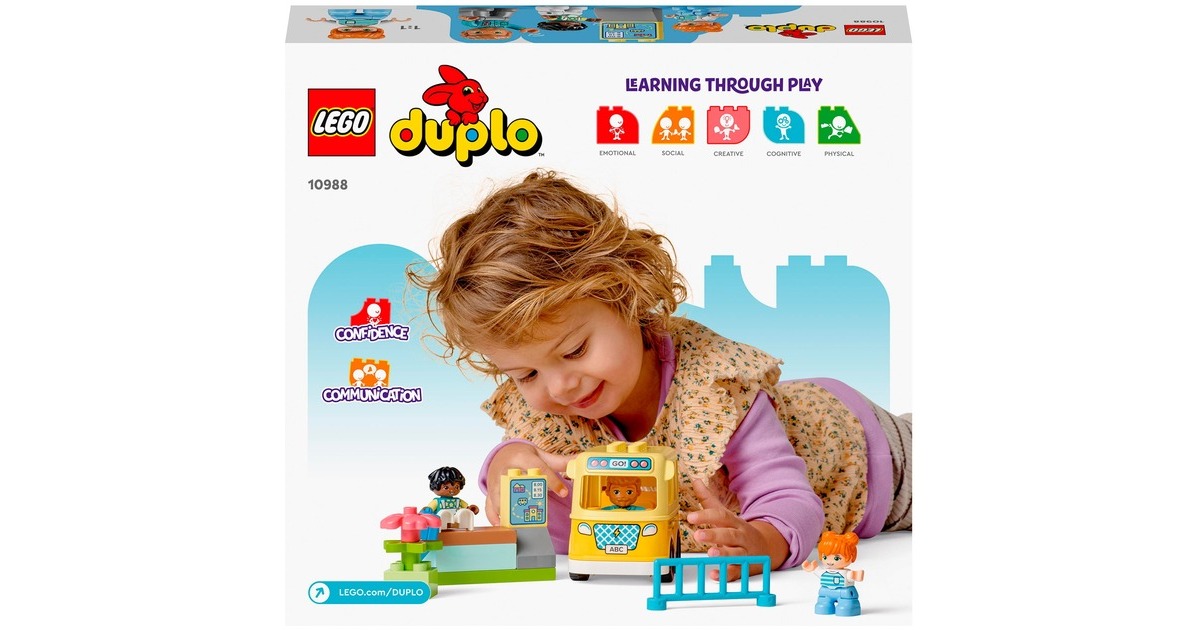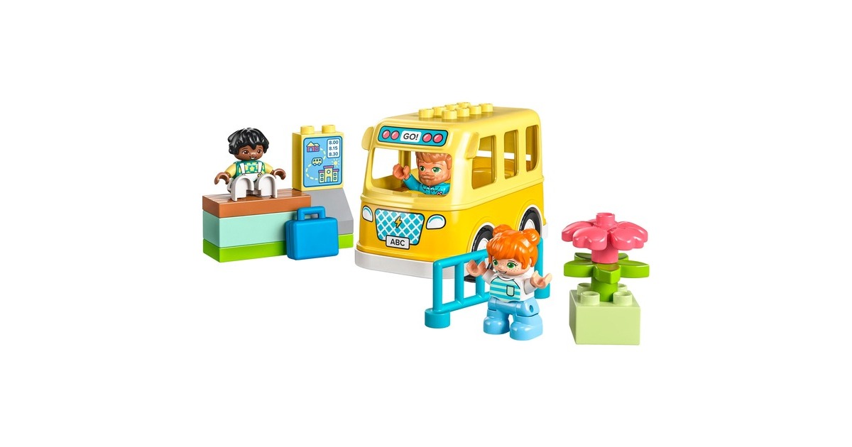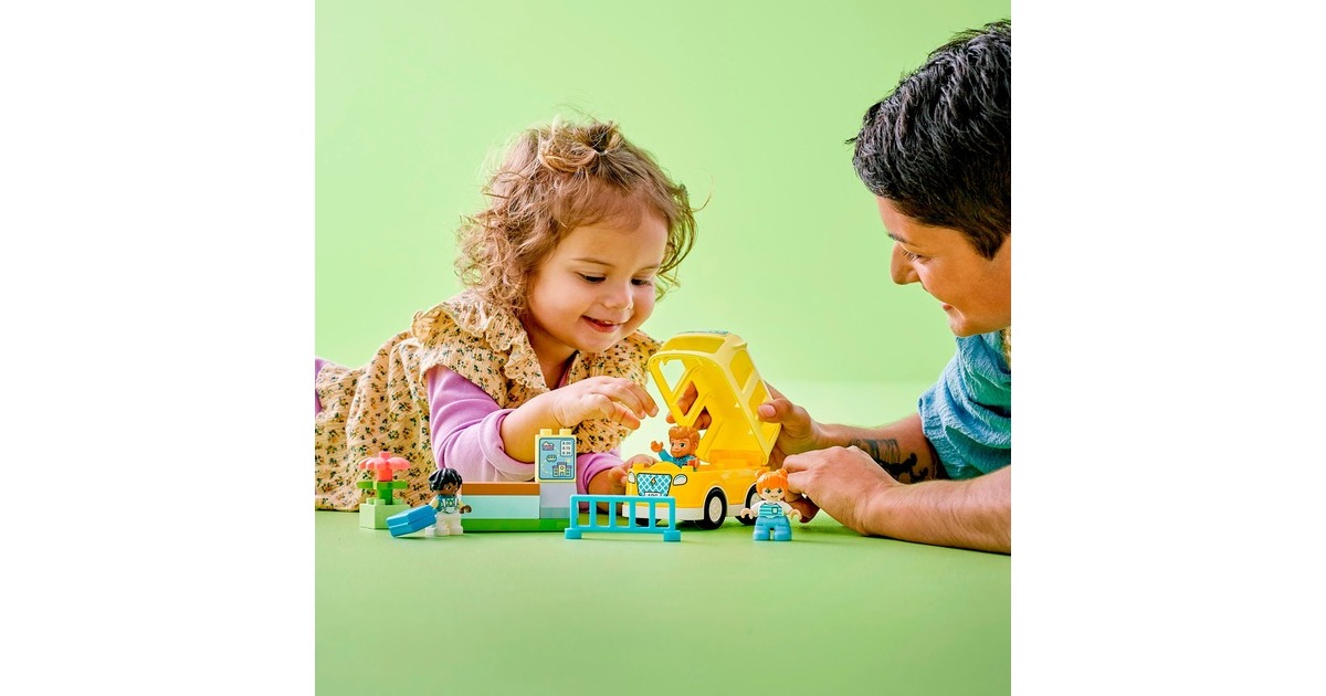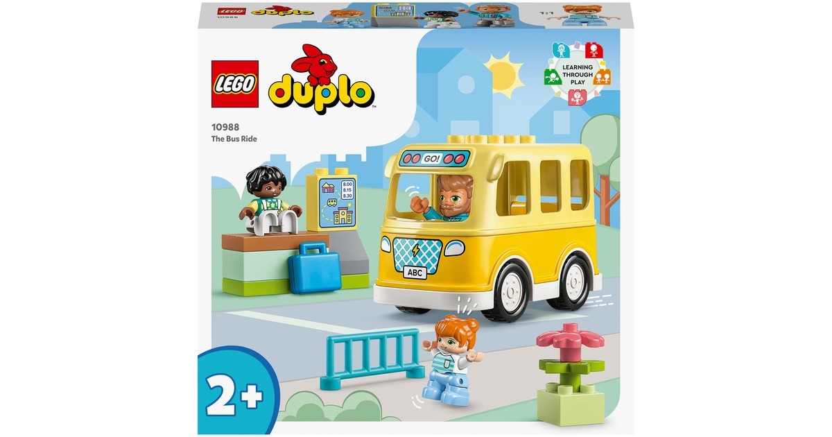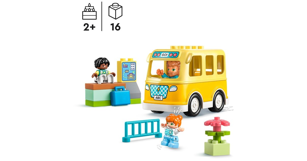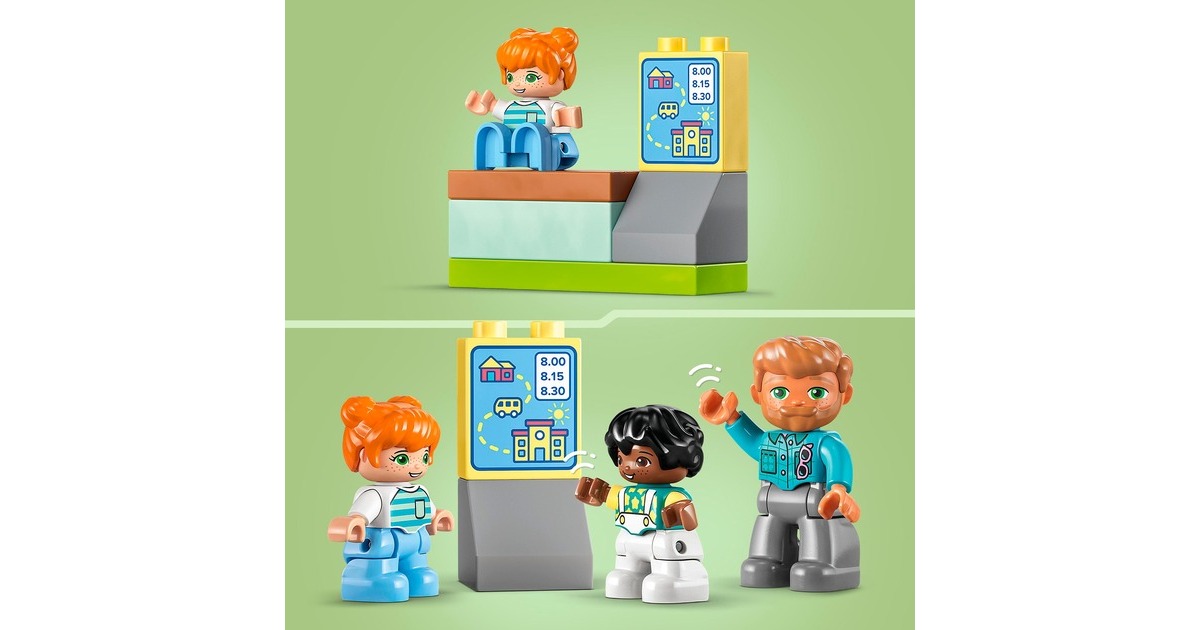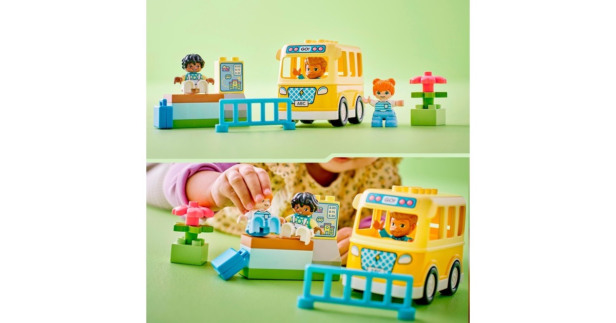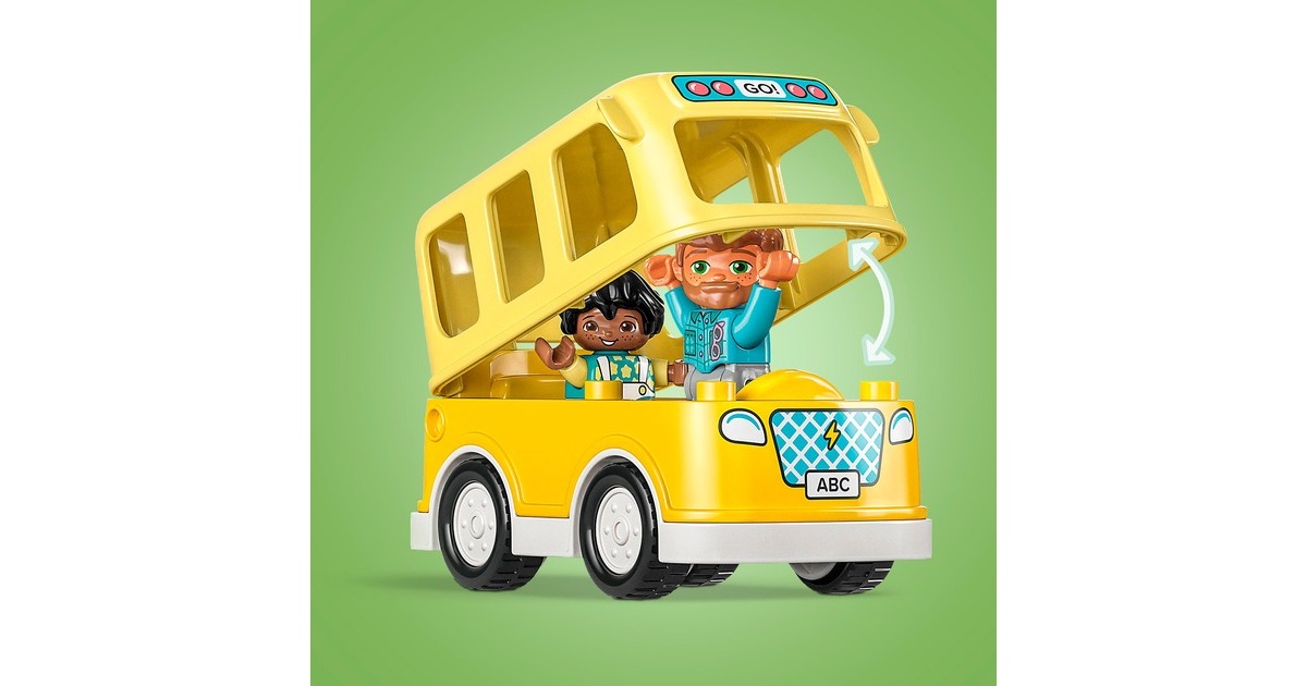 Mit dem DUPLO-Set Die Busfahrt kommt ein echtes Alltagsabenteuer ins Kinderzimmer. Auf der Bank an der Haltestelle warten die Kinder geduldig auf den Bus und inspizieren die leckeren Snacks in ihren Lunchboxen. Das Dach des Busses lässt sich abheben, so dass Figuren dort Platz nehmen können. Das Set beinhaltet drei Figuren - zwei Kinder und einen Fahrer. Art.-Nr.: 1900832