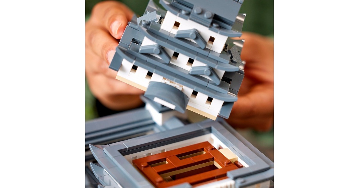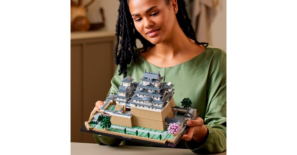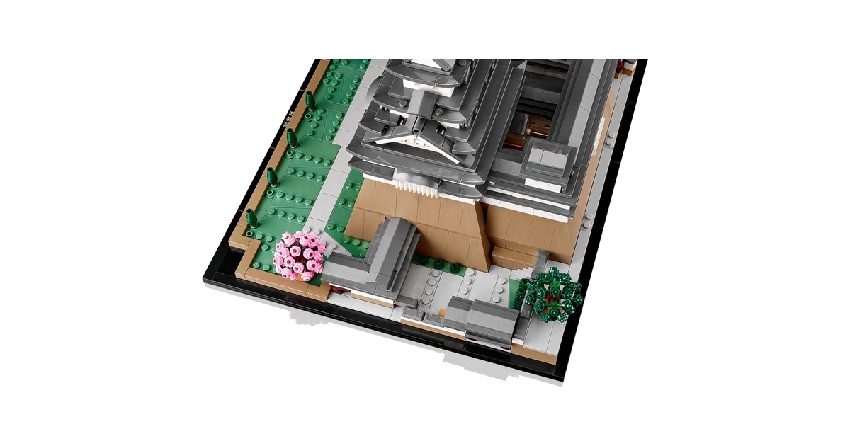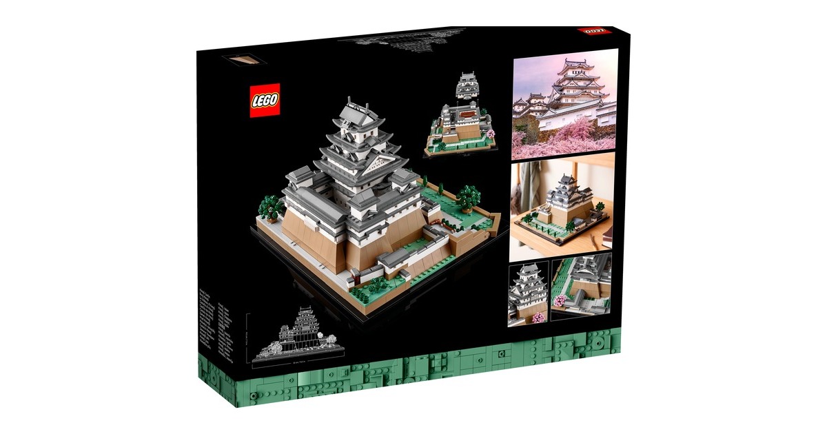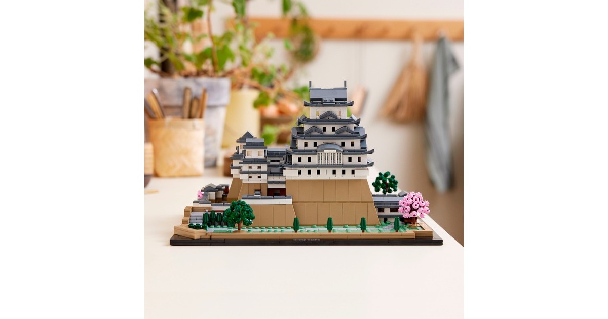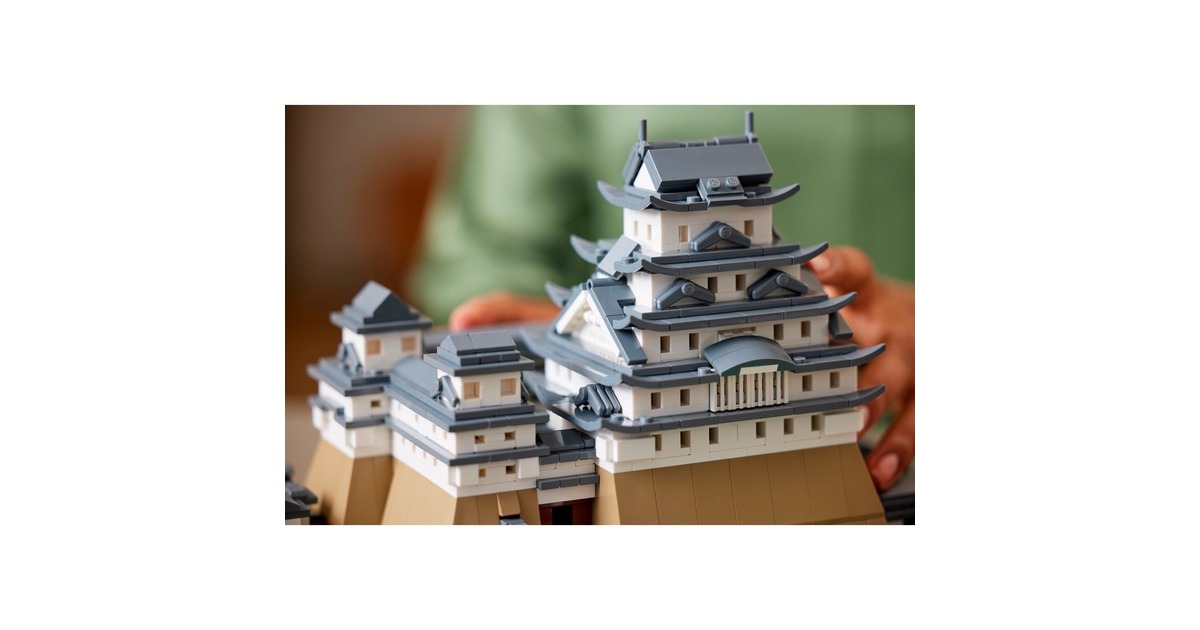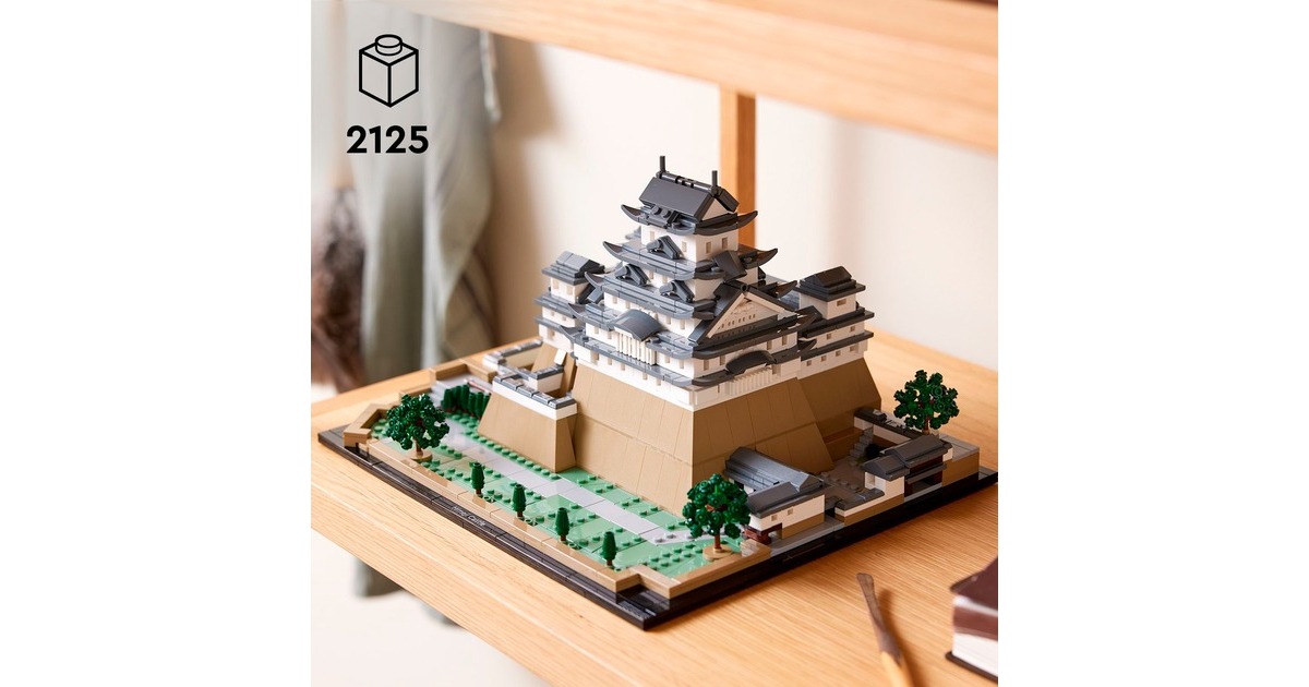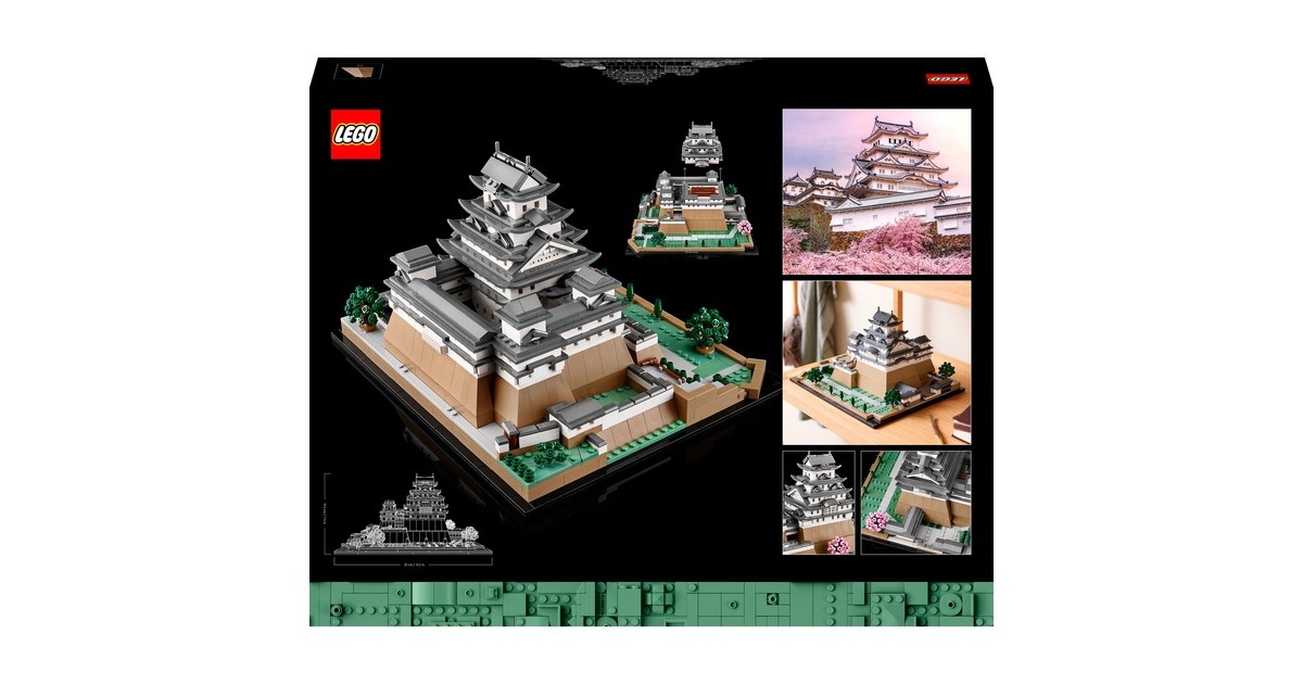 Aus 2125 Teile entsteht mit diesem LEGO-Set aus der Serie Architecture die kleine Version eines erhabenen, japanischen Bauwerks: Das Modell der Burg Himeji begeistert mit authentischen Details wie originalgetreuen Türmen, Gängen und asymmetrischen Mauern. Das Dach lässt sich abnehmen, womit eine vereinfachte Darstellung des Grundrisses sichtbar wird. Auf dem Burggelände befinden sich vier baubare Kirschbäume - zwei mit grünen Blättern und 2 mit rosafarbenen Blüten. Das fertige Modell ist 32 cm breit.Art.-Nr.: 1904753