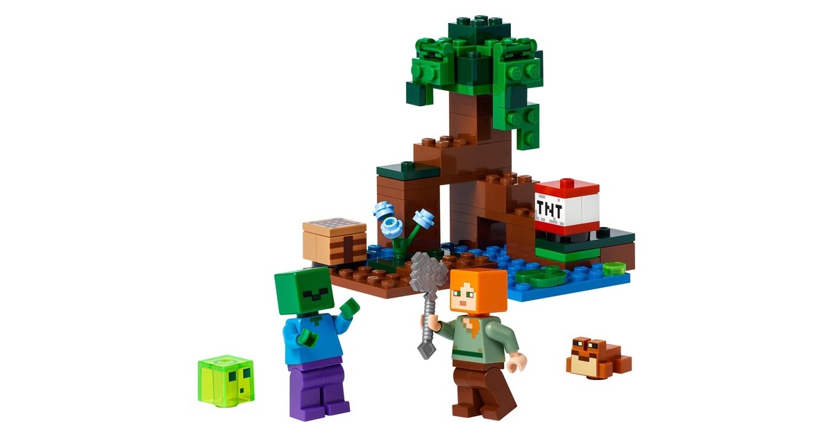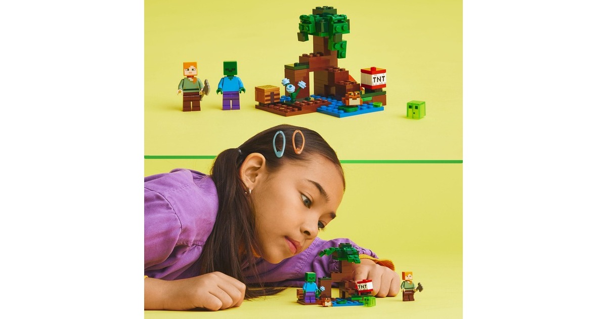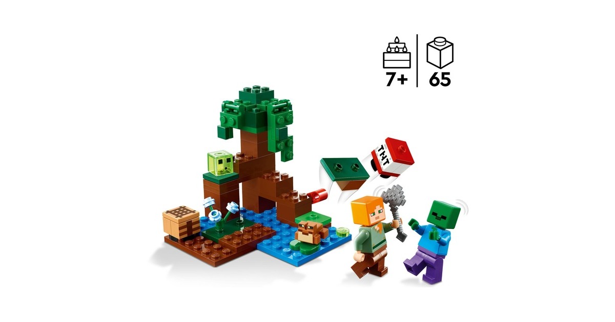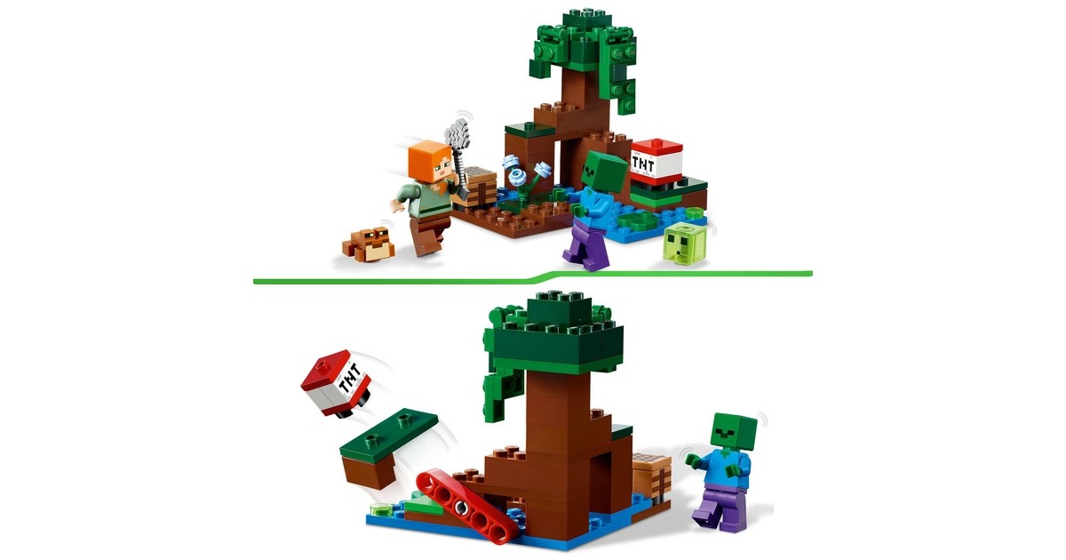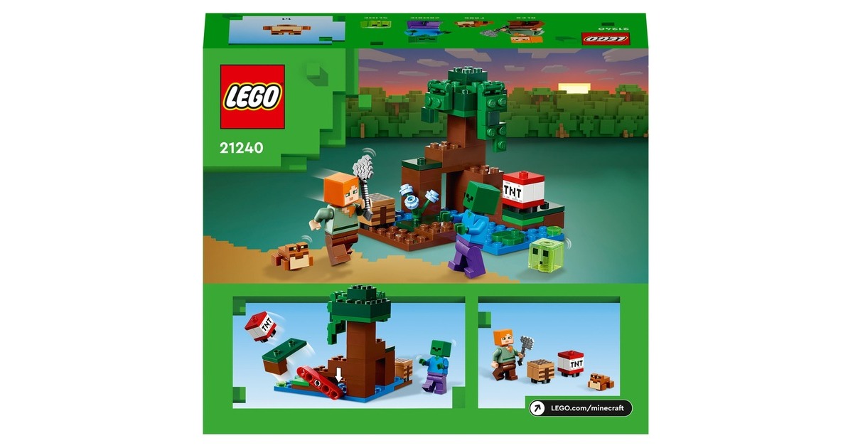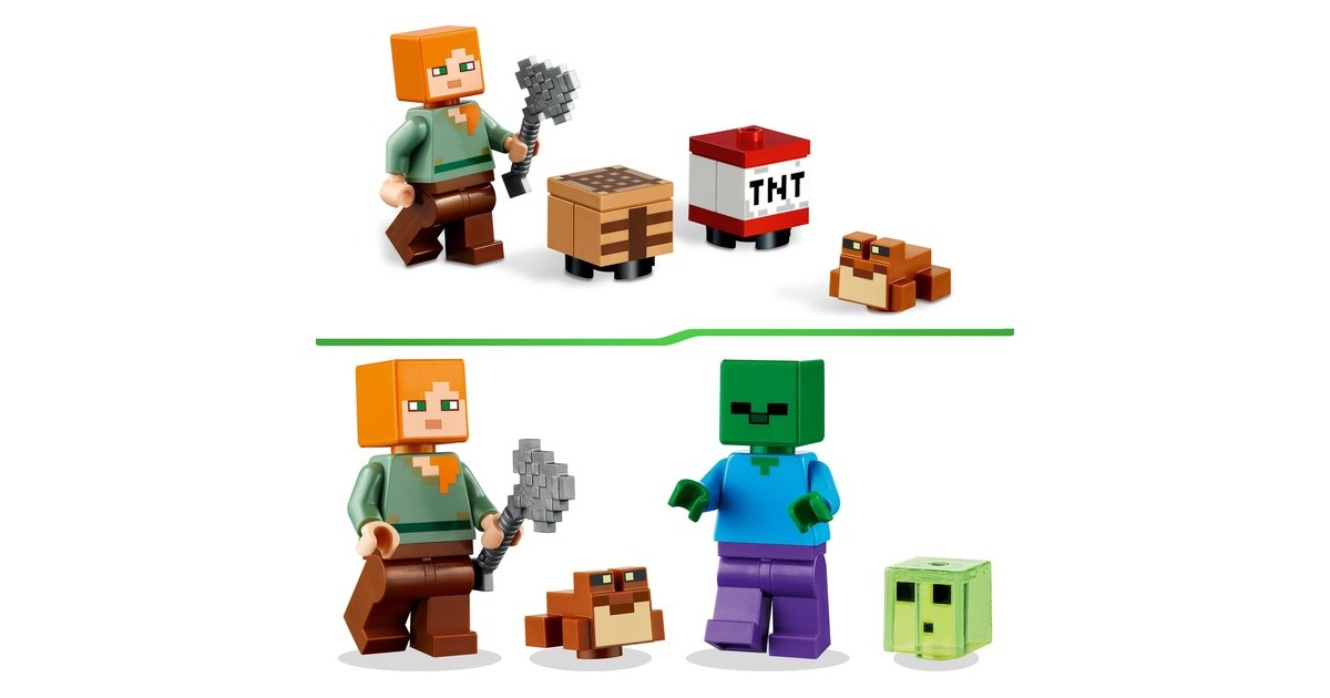 Das LEGO-Set "Das Sumpfabenteuer" ist eine bau- und greifbare Version des gefährlichen Sumpf-Bioms aus Minecraft. Das Set beinhaltet die Minecraft-Figur Alex. Sie streift bei diesem spannenden Abenteuer durch Morast und Mangroven. Neben all den kreativen Baumöglichkeiten sorgen auch zwei feindselige Monster – ein Minecraft Zombie und ein Schleim – für reichlich Nervenkitzel. Ein freundlicher Frosch sitzt auf einem Seerosenblatt und beobachtet die spannenden Duelle. Alex kann ihre Axt schwingen. Per Hebel kann das Minecraft-TNT zum Explodieren gebracht werden, um jeden Angriff abzuwehren. Art.-Nr.: 1871386