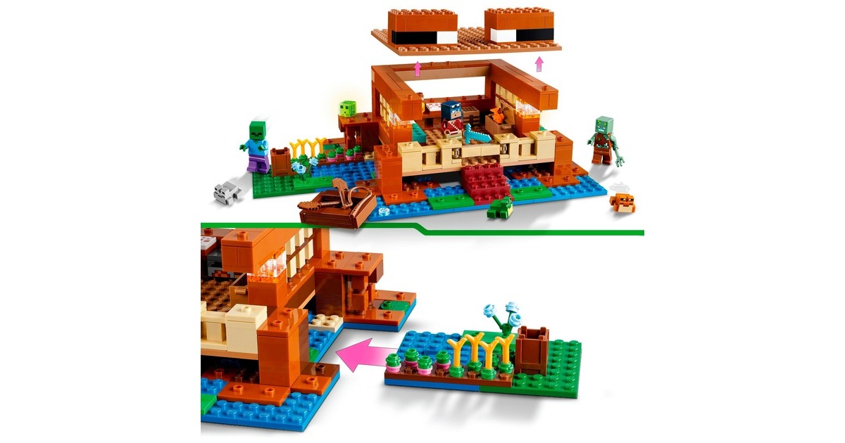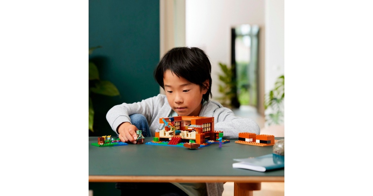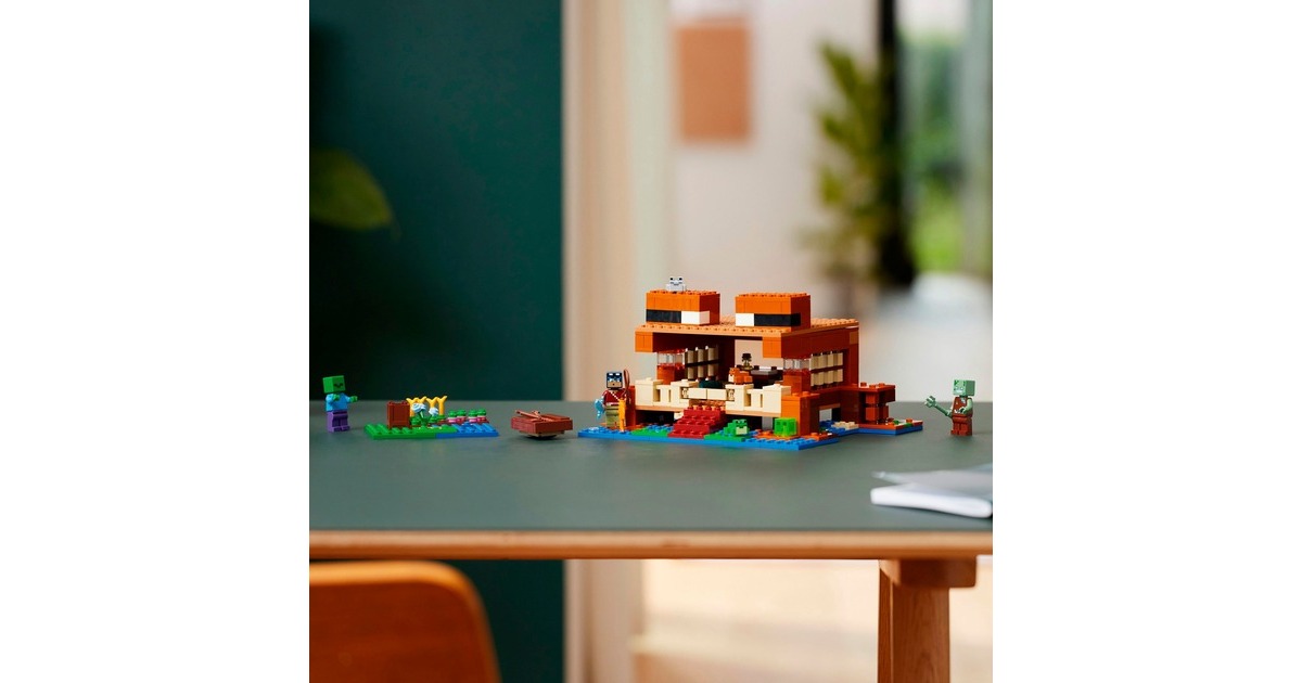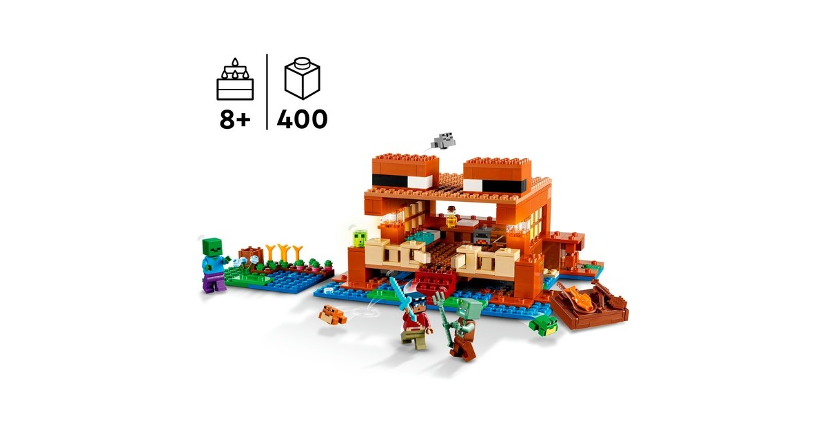 Mit diesem LEGO-Set aus der Serie Minecraft kommt eine Herausforderung für Kinder, die Minecraft lieben. Aus LEGO-Teilen entsteht ein Spielzeug-Haus in Form eine Frosches mit vielen, aus dem Videospiel bekannten Details. Das Dach ist abnehmbar, so dass Bett, Tisch, Werkbank, Ofen, Truhe, Kuchen und Honig gut zugänglich sind. Im Außenbereich können Rote Beete, Weizen und Blumen geerntet werden. Mit dem Boot und der Angelrute mit Fisch geht es zum Angeln auf den See. Dieses Set wird von mehreren Minecraft-Figuren und -Tieren bevölkert: Neben einem Sumpfforscher, einem Minecraft-Zombie und einem Ertrunkenen mit Dreizack sind drei Frosch-Figuren in grün, grau und braun enthalten. Hinzu kommt ein Minecraft-Schleim. Ein Set mit 400 Teilen für Minecraft-Fans ab 8 Jahren. So wird Minecraft in der echten Welt lebendig - und nach dem Spielen kann das Set einfach im Kinderzimmer ausgestellt werden.Art.-Nr.: 100012599