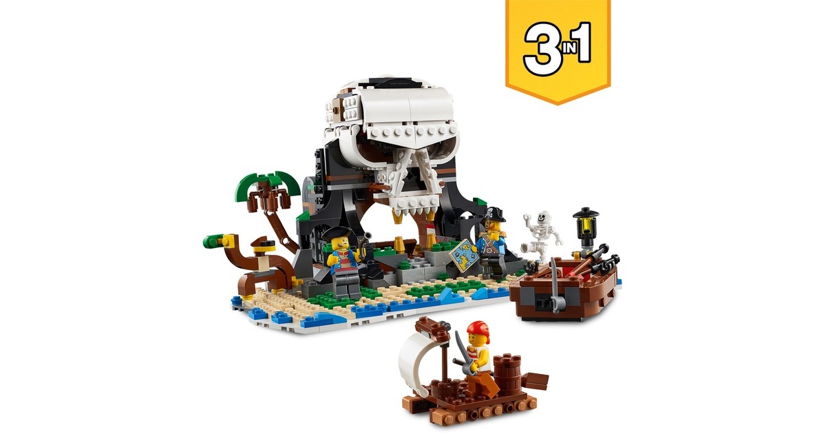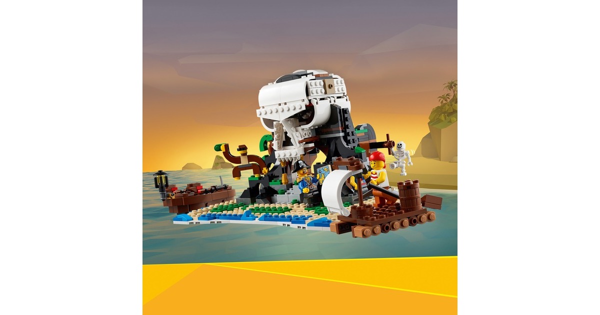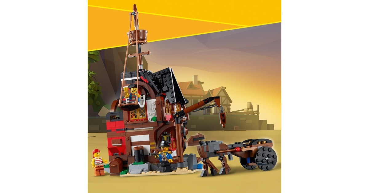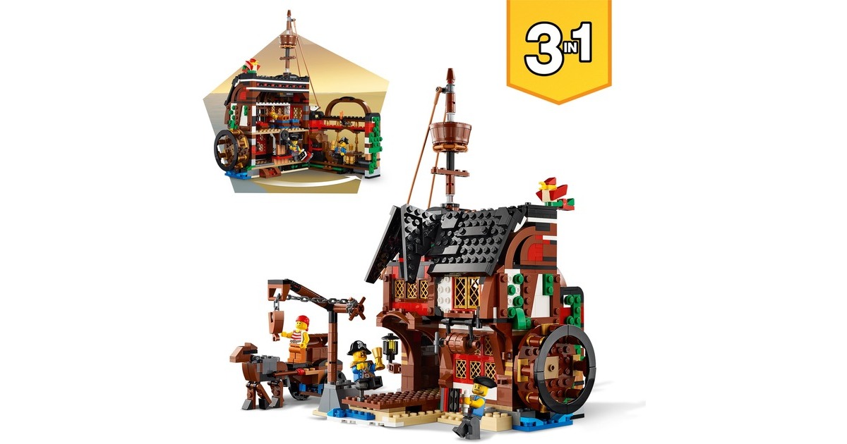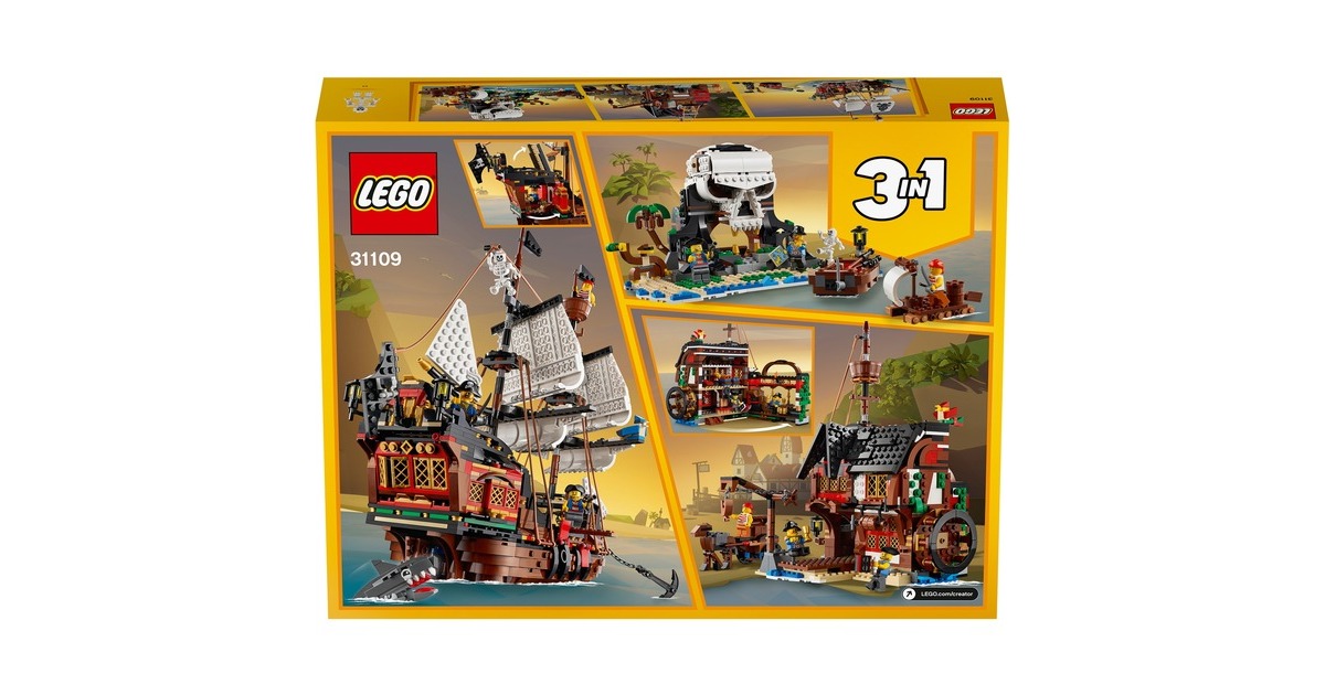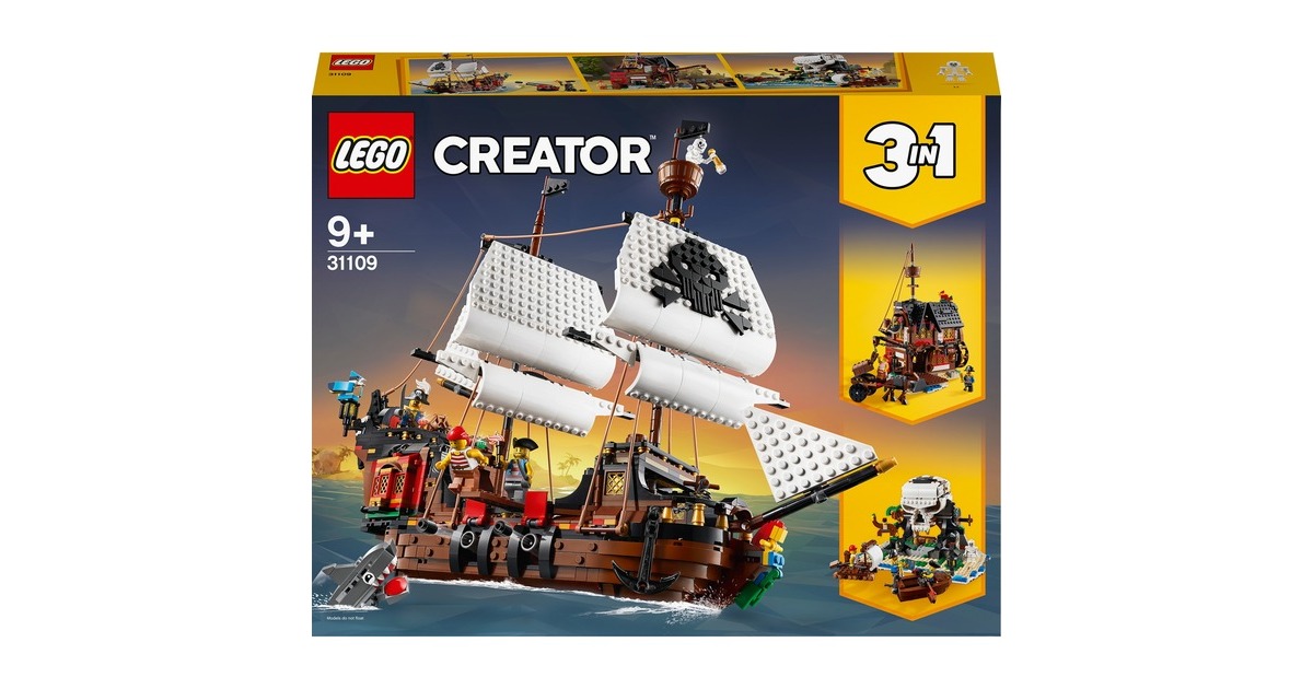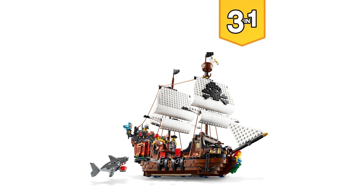 Die See ruft! Mit dem LEGO Creator 3-in-1-Spielzeug „Piratenschiff“ (31109) erwarten Piratenfans spannende Seeräuberabenteuer. Dieses detailreiche Set enthält ein tolles Piratenschiff mit beweglichen Segeln, Kanonen und eine Kajüte mit aufklappbarem Dach, 3 Minifiguren, einen Hai und einen Papagei als Baufiguren sowie jede Menge weitere Details aus LEGO Steinen und cooles Zubehör, um zum Spielen zu inspirieren. Dieses LEGO Creator 3-in-1-Spielzeugset ermöglicht mindestens 3 verschiedene Bau- und Spielerlebnisse. Kinder können ein Piratenschiff bauen, es dann in die Piratentaverne umbauen und diese schließlich in eine schaurige Pirateninsel verwandeln. Sie können aber auch ihrer Kreativität freien Lauf lassen und etwas Neues erschaffen. LEGO Creator 3-in-1 Sets enthalten verschiedene realistische Modelle, die Kinder zu fantasievollem Spielspaß inspirieren. Die Modelle bieten unzählige Bau- und Spieloptionen und sprechen die kreative Seite von Kindern jeden Alters an. Die fantastischen Spielzeugsets sind auch tolle Weihnachts- oder Geburtstagsgeschenke für Kinder.Art.-Nr.: 1635025