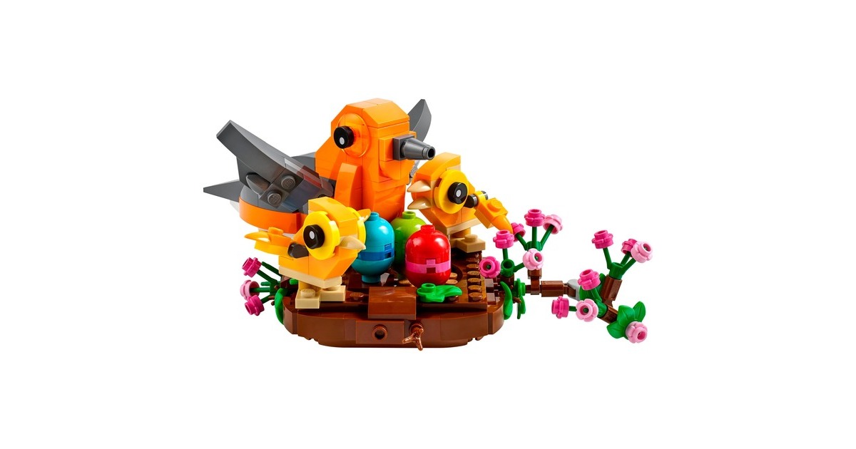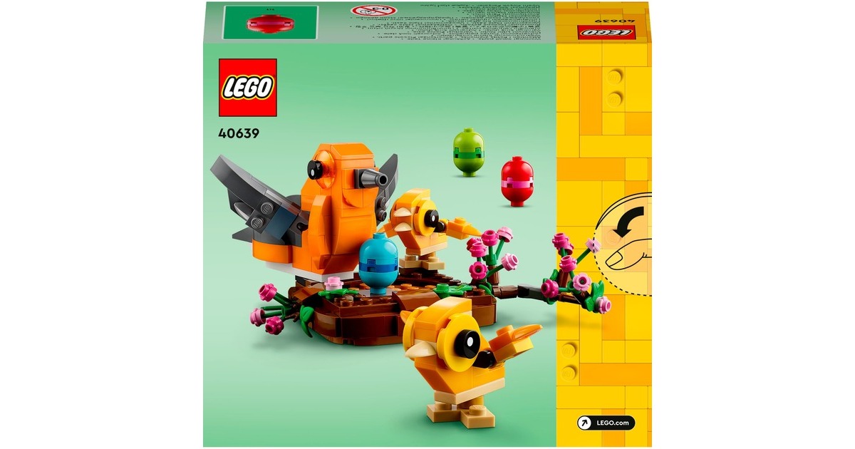 Mit diesem süßen Vogelnest aus LEGO-Steinen beginnt der Frühling: Aus 232 Teilen entsteht ein Nest auf einem Blütenzweig, in dem eine Vogelmutter und zwei Küken mit 3 Ostereiern sitzen. Vögel und Eier können herausgenommen werden. Die Vögel haben bewegliche Flügel. Eier, Blumen und Zweig lassen sich vielseitig anordnen.Art.-Nr.: 1918930