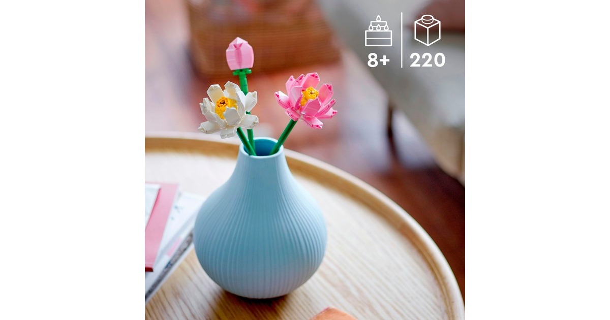 Mit diesem Set aus der LEGO-Serie Iconic lässt sich die Schönheit der Natur nachbilden. Aus 220 Teilen entstehen zwei Lotusblumen in voller Blüte und eine mit einem knospenden Blütenkopf. Die Blumen in zarten Rosa- und Weißtönen können mit ihren langen grünen Stängeln in eine Vase gestellt werden. Ob zum Ausstellen oder Verschenken - ein zarter Farbtupfer in jeder Umgebung. Art.-Nr.: 100012124