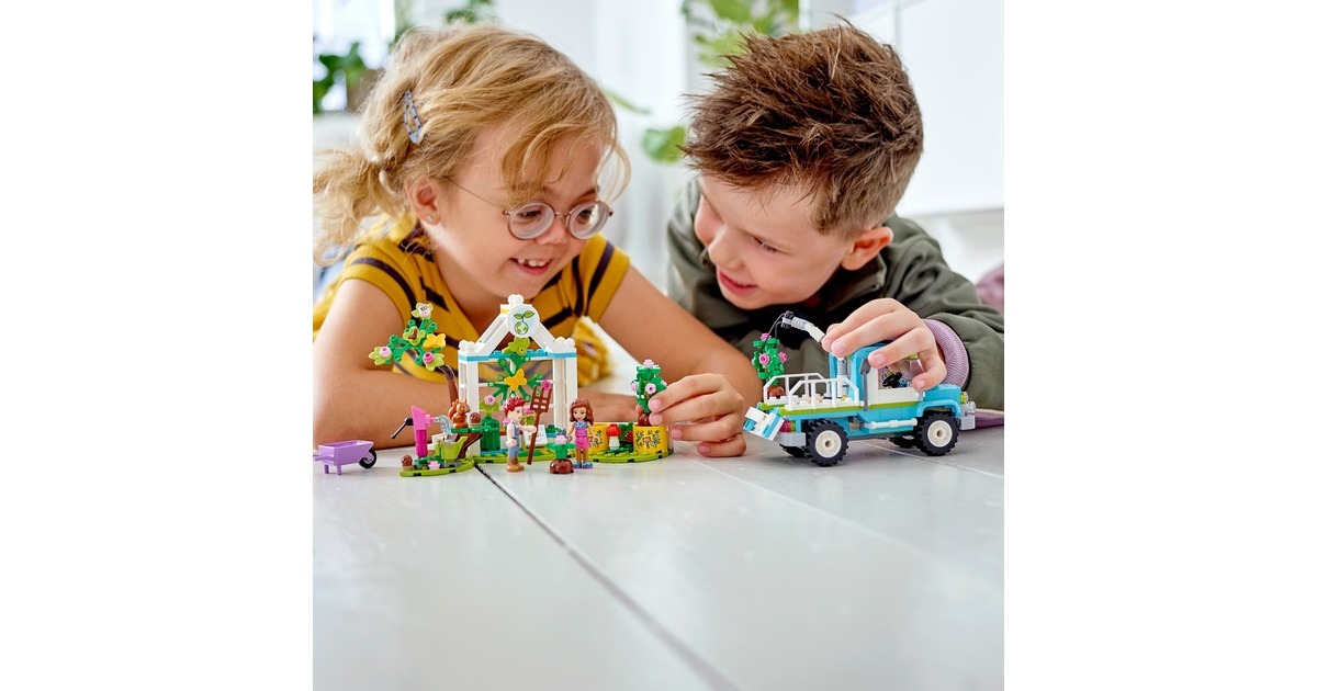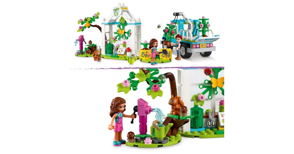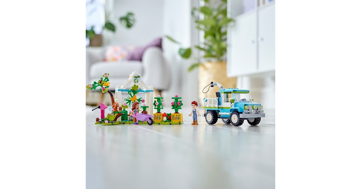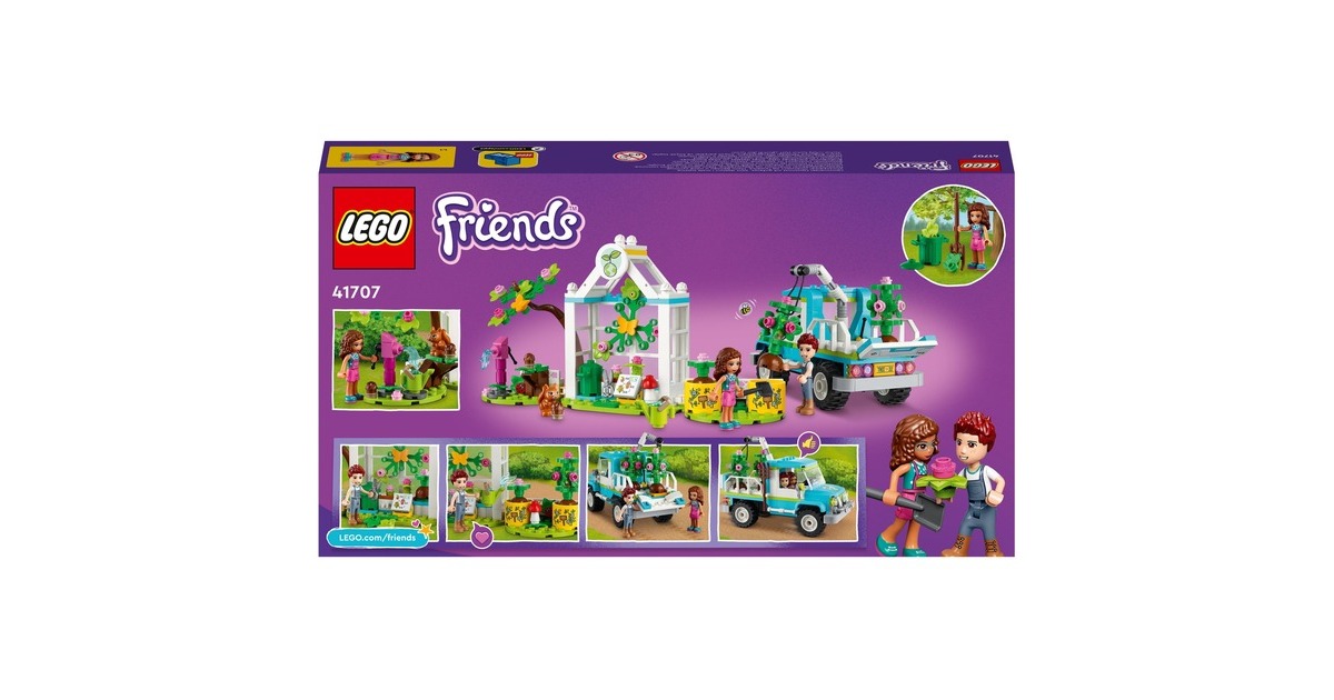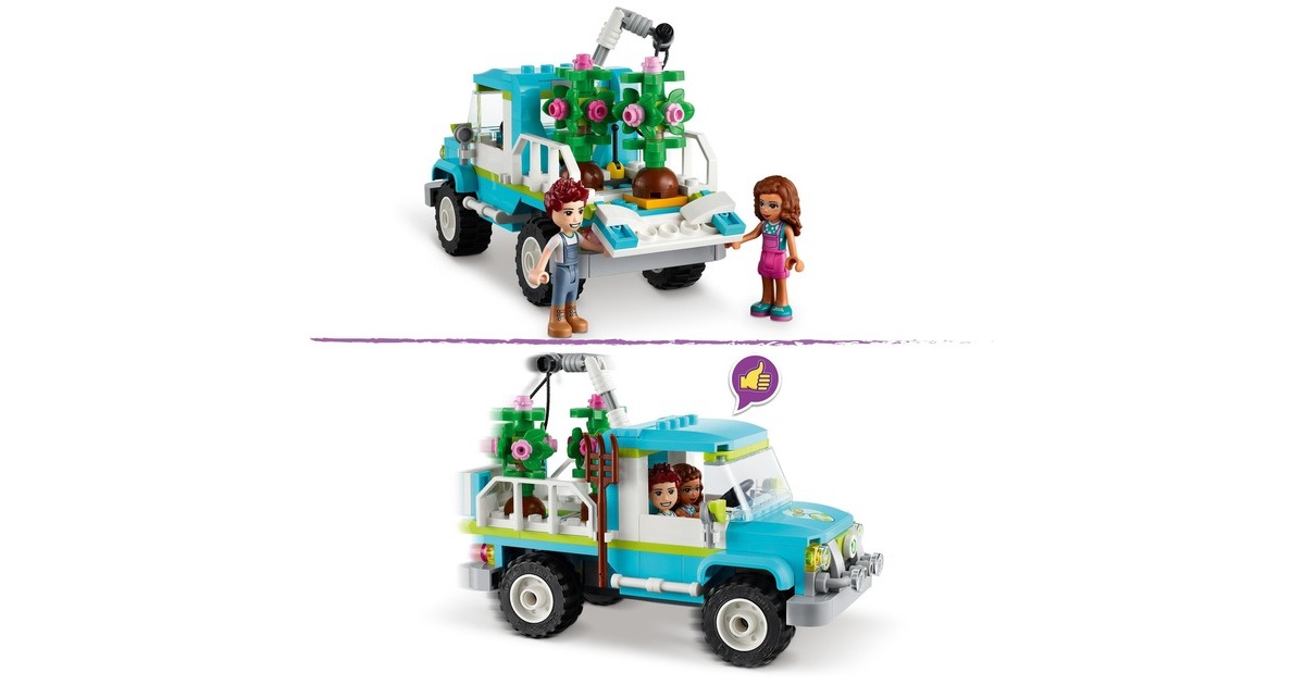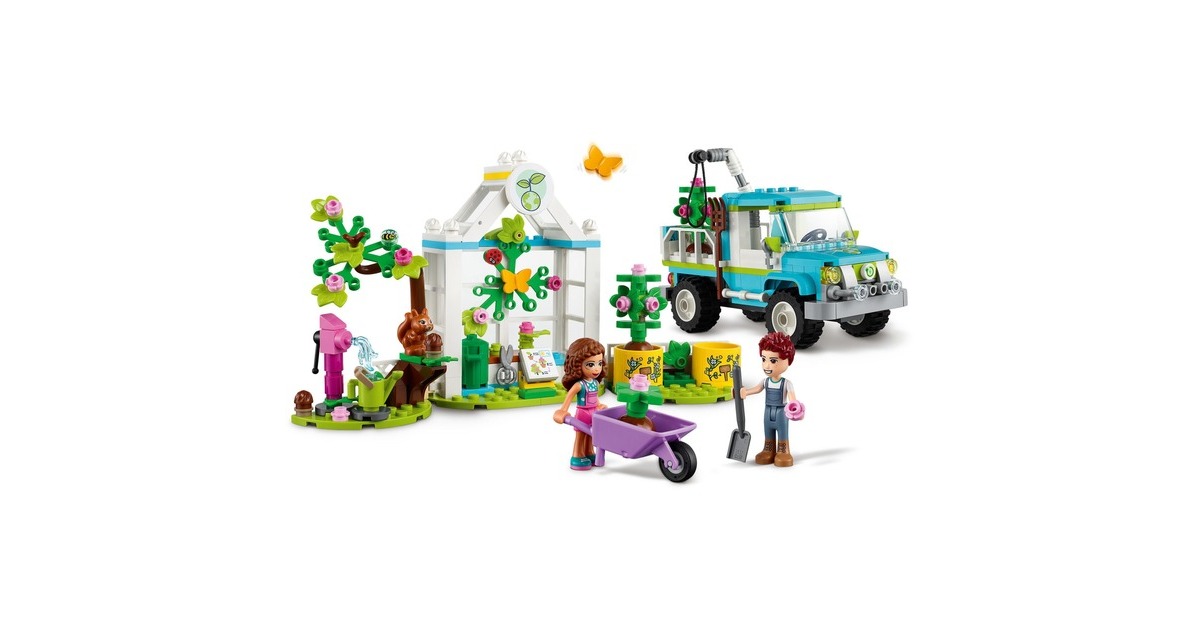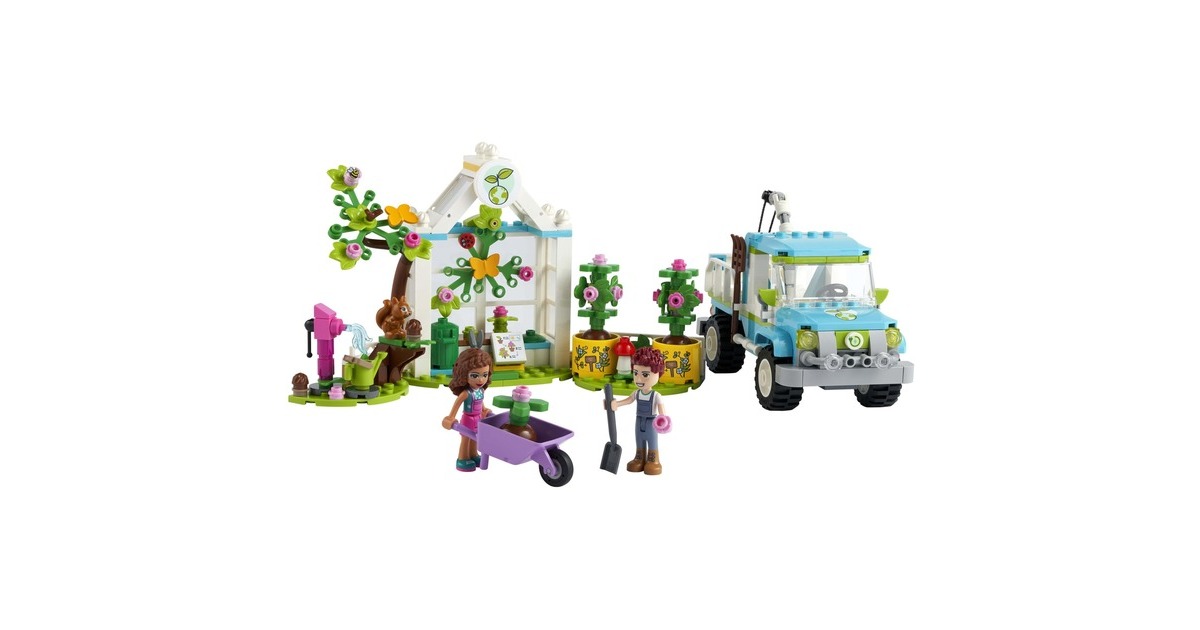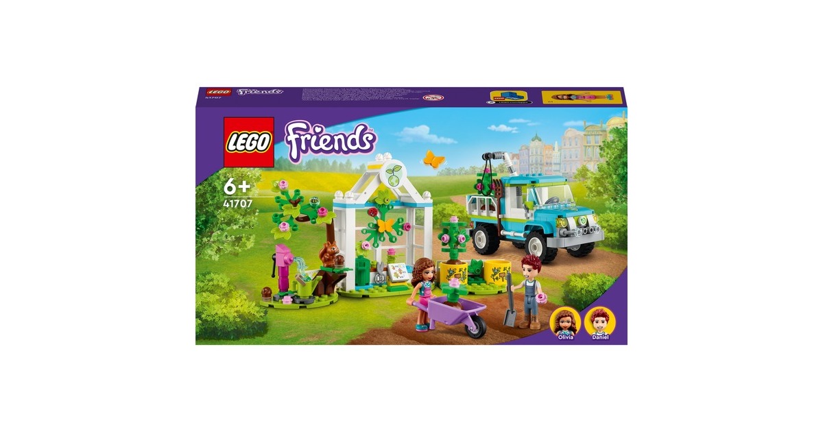 Wecke mit dem LEGO Friends Baumpflanzungsfahrzeug (41707) für Kinder ab 6 Jahren das Interesse an der Natur. Mit diesem preiswerten Pflanzen- und Blumengarten-Spielzeug ab 6 Jahren, das 2 Mini-Puppen (Olivia und Daniel), eine Baumschule und einen fahrbaren Spielzeug-Pickup enthält, können Jungen und Mädchen spielerisch lernen, wie Pflanzen wachsen. Außerdem gibt es viele niedliche Accessoires für die Gartenarbeit und jede Menge Tierfiguren zu entdecken, die den LEGO Friends-Figuren bei der Arbeit Gesellschaft leisten. Dieses LEGO Friends Set ist voller Funktionen, die zu fantasievollem Spielen anregen. Kleine Auto-Fans werden den Spielzeug-Pickup lieben, den die Charaktere zu einem Elektro-Truck umgebaut haben. Er verfügt über einen beweglichen Greifarm zum Anheben und Absenken der Bäume in den Pickup. Die Kabine hat Platz für beide Mini-Puppen – die Kinder können einfach das Dach abnehmen und sie hineinsetzen. Lass kleine LEGO Baumeister die Welt von Heartlake City entdecken. Egal, ob die Kinder sich für Wissenschaft, Sport, Kunst oder die Umwelt interessieren – sie finden bestimmt ein Set, das ihre Fantasie anregt, und eine Figur, die genauso ist wie sie. Die LEGO Friends-Naturspielzeuge bringen Kindern die Natur näher und sind tolle Geschenke zum Geburtstag oder zu jedem anderen Anlass für Kinder ab 6 Jahren.Art.-Nr.: 1787700