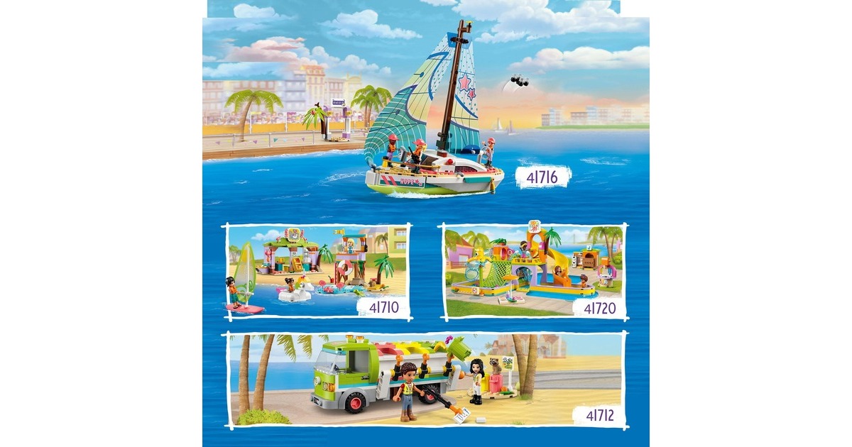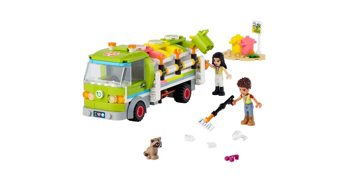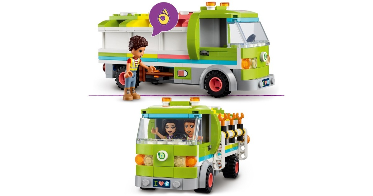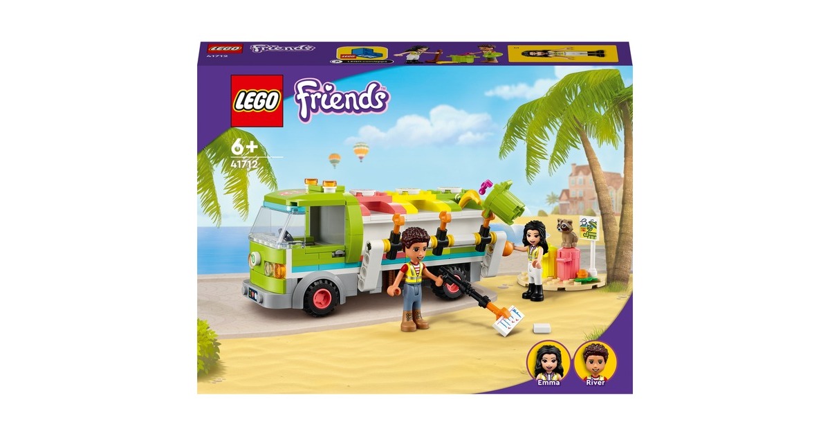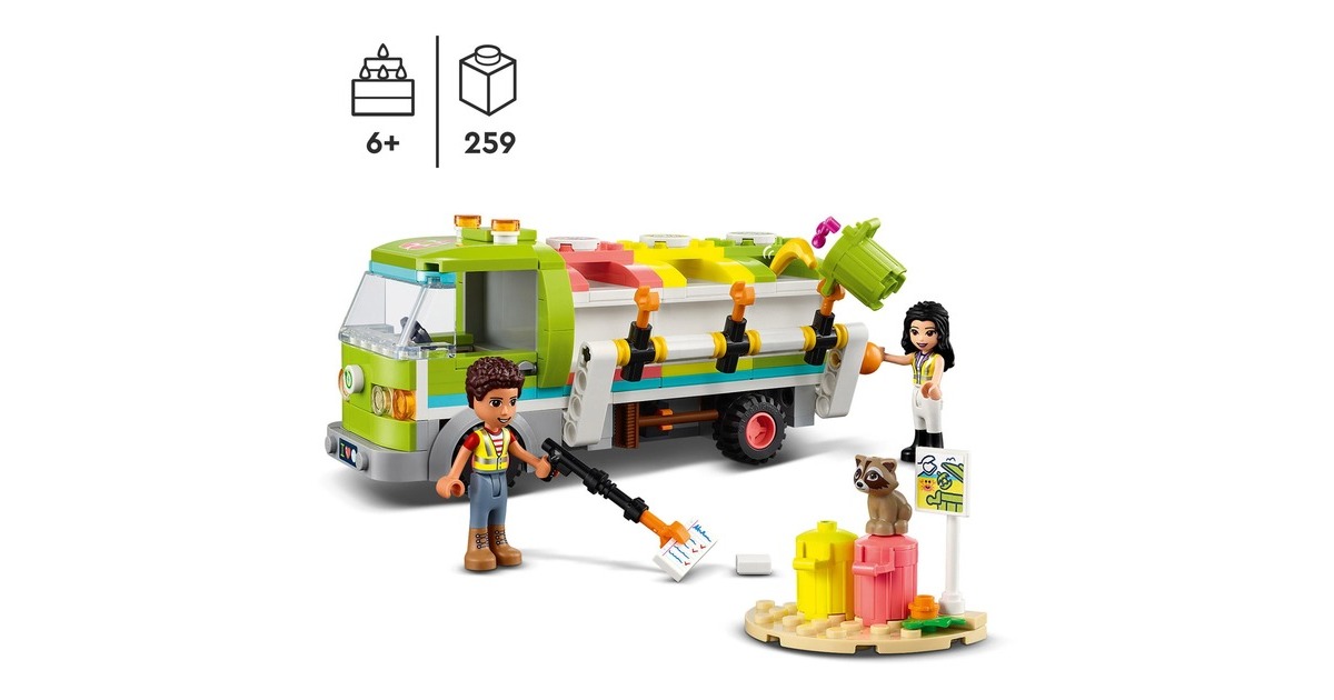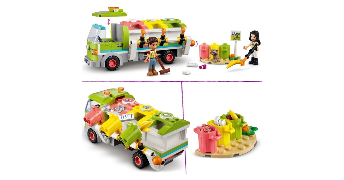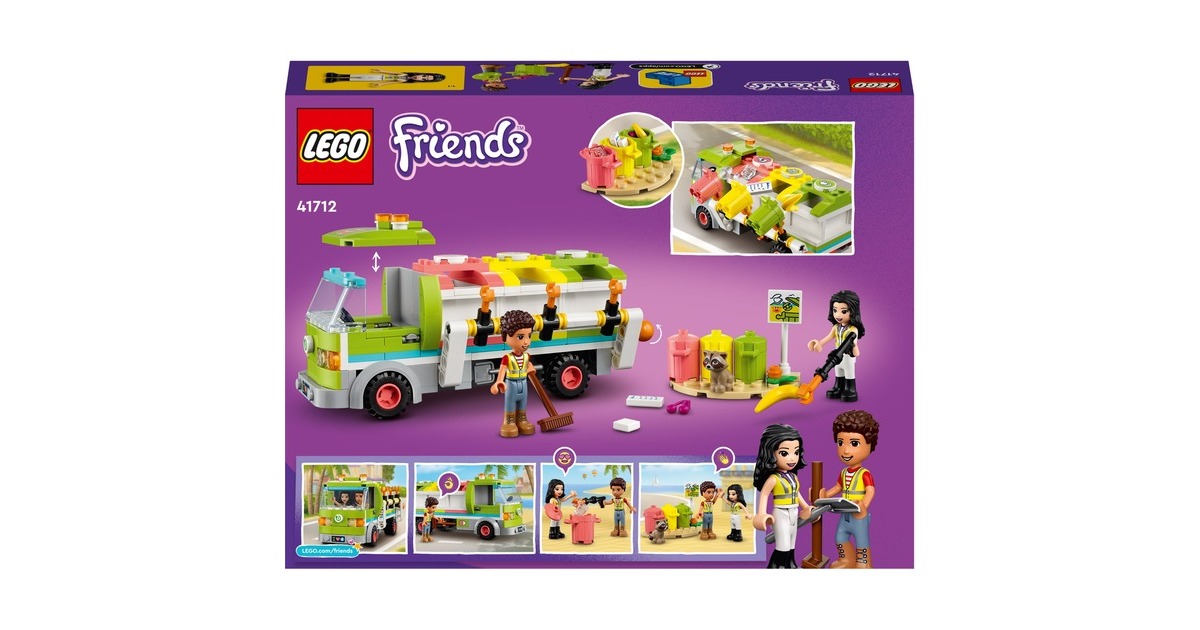Suchst du nach einem lustigen Spielzeug für Kinder ab 6 Jahren, denen die Umwelt am Herzen liegt? Dann ist der LEGO Friends Recycling-Auto (41712) genau das richtige Spielzeug für sie. Kinder können sich dem Reinigungsteam anschließen, um den Strand von Heartlake City aufzuräumen. Dieses Lernspielzeug enthält einen Spielzeug Müllwagen mit Mülltonnen. Der Truck hat einen beweglichen Arm, den die Kinder an den Mülltonnen befestigen können, um deren Inhalt in die Container zu kippen. Es gibt 3 Straßenmülltonnen und einen Müllgreifer, mit dem man das Recycling in Papier, Lebensmittel und Glas trennen kann. Die Mini Puppen LEGO Friends Emma und River und eine Tierfigur eines Waschbären sind ebenfalls enthalten, zusammen mit Zubehör wie einer Spielzeugbürste, einer Banane, Kirschen und einem Schild zum Aufräumen des Strandes. Emma und River patrouillieren in ihrem coolen Recycling-Auto an der Küste. Die Kinder heben mit dem Greifwerkzeug den Müll auf, bevor der Waschbär damit wegläuft und sortieren ihn dann in den richtigen Eimer. Emma braucht Hilfe, um die Mülltonnen am Arm des Trucks zu befestigen, dann heben die Kinder den Griff an, um den Müll in die Behälter zu kippen.