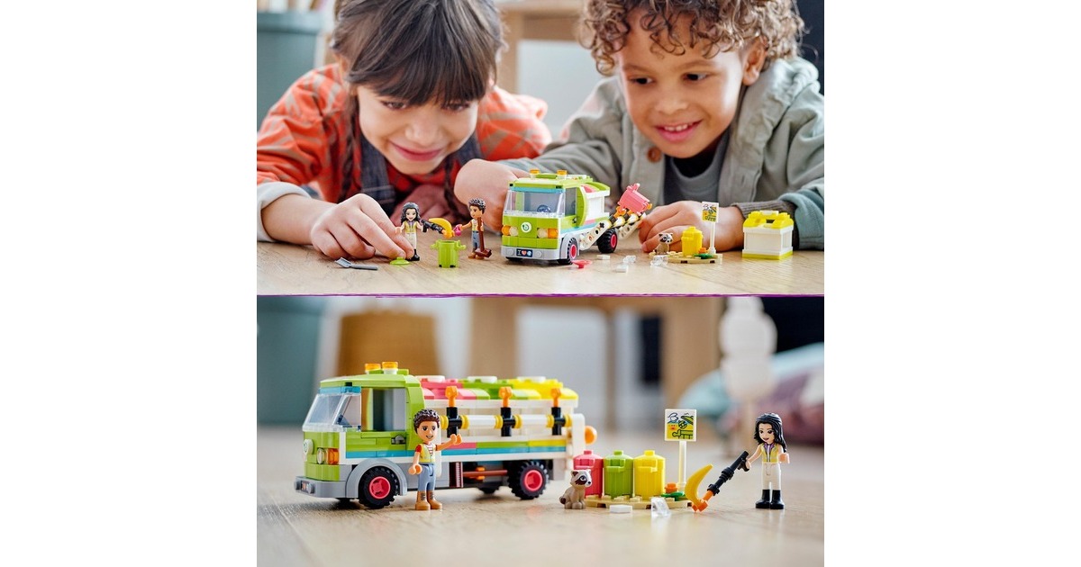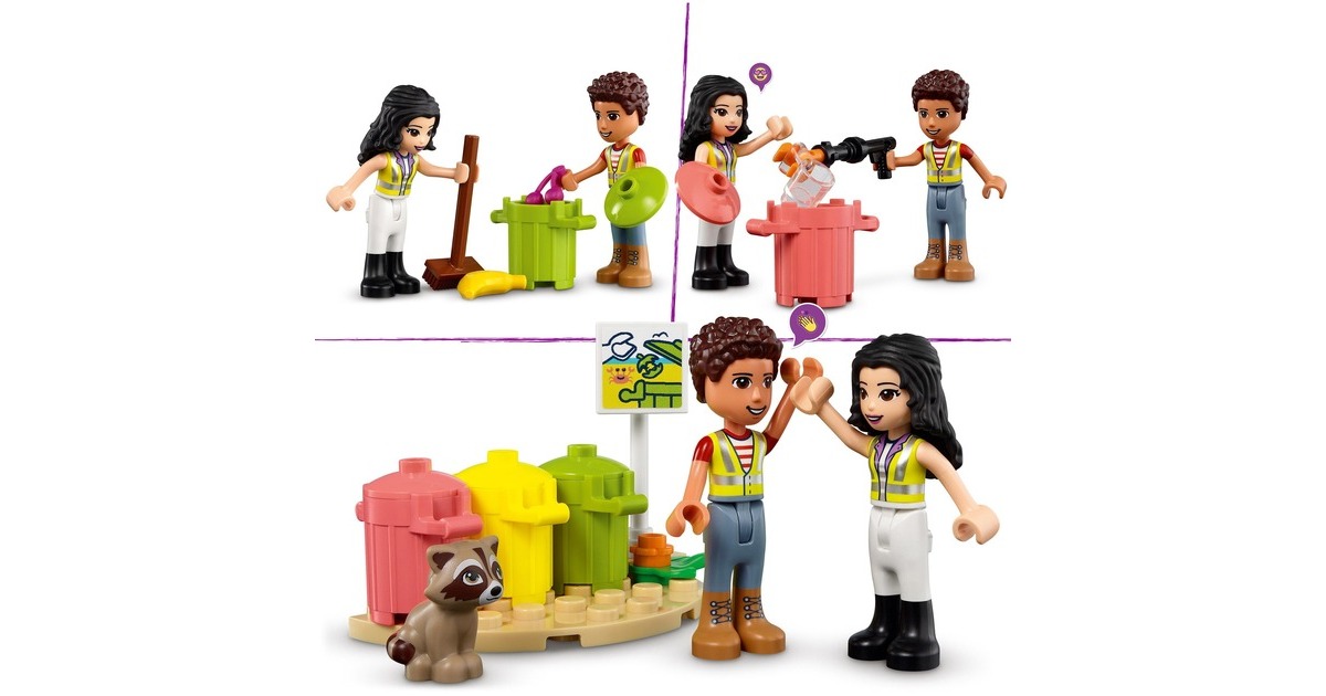 Müllwagen mit3 Fächern für Papier, Glas und Bioabfälle, Behältern mit Kippfunktion und Sitzen für 2 Figuren. 2 Friends Mini-Figuren: Emma und River; ein Waschbär, eine Bürste, eine Müllzange, Essensreste und ein Schild. |