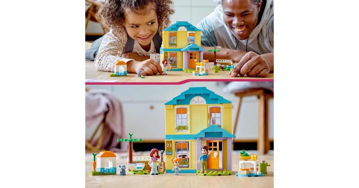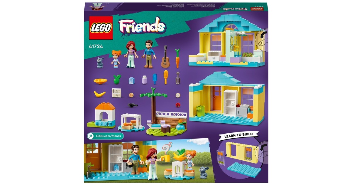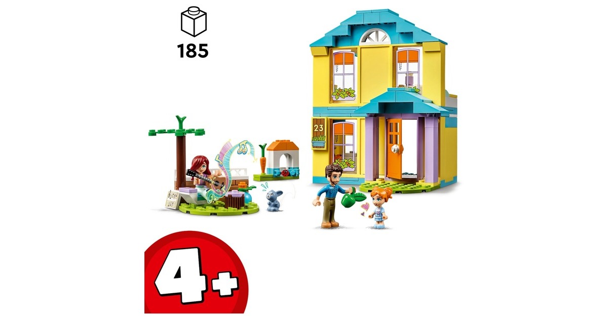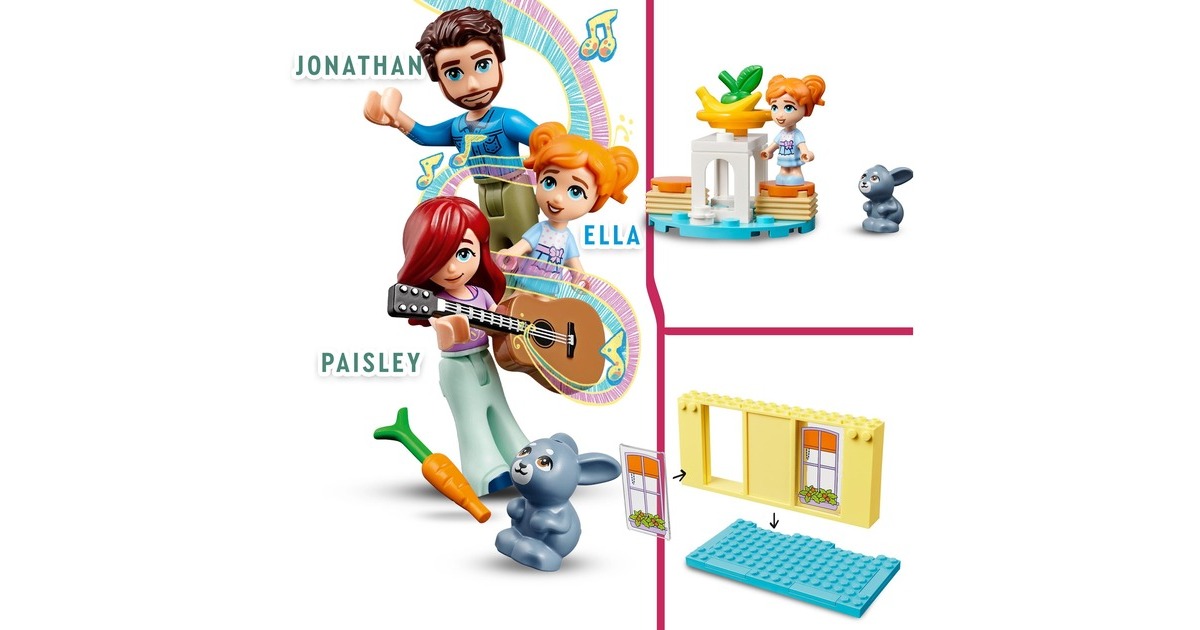 Die obere Etage dieses LEGO Friends Mini-Puppenhauses enthält ein Schlafzimmer und ein Badezimmer. Sie kann herausgenommen werden, um die darunter liegende Küche zu erkunden. Die Lego Friends Mini-Puppen Paisley, Ella und Jonathan sind ebenfalls enthalten. Außerdem gibt es eine Hasenfigur mit eigenem kleinen Haus. Jede Menge Puppenhaus-Zubehör für Rollenspiele ist enthalten, darunter Snacks und Obst für den Tisch im Freien und eine Recycling-Tonne. Im Hof gibt es eine gemütliche Ecke, in der Paisley Gitarre spielt und Musik schreibt, während sie ihrem Lieblingshasen Gesellschaft leistet. Für das Kaninchen gibt es sogar eine Karotte zum Naschen. Dieses LEGO-Set ab 4 Jahren wird mit einem hilfreichen Starter-Stein geliefert - einer stabilen Basis, die schnellen Bauerfolg ermöglicht.Art.-Nr.: 1869307