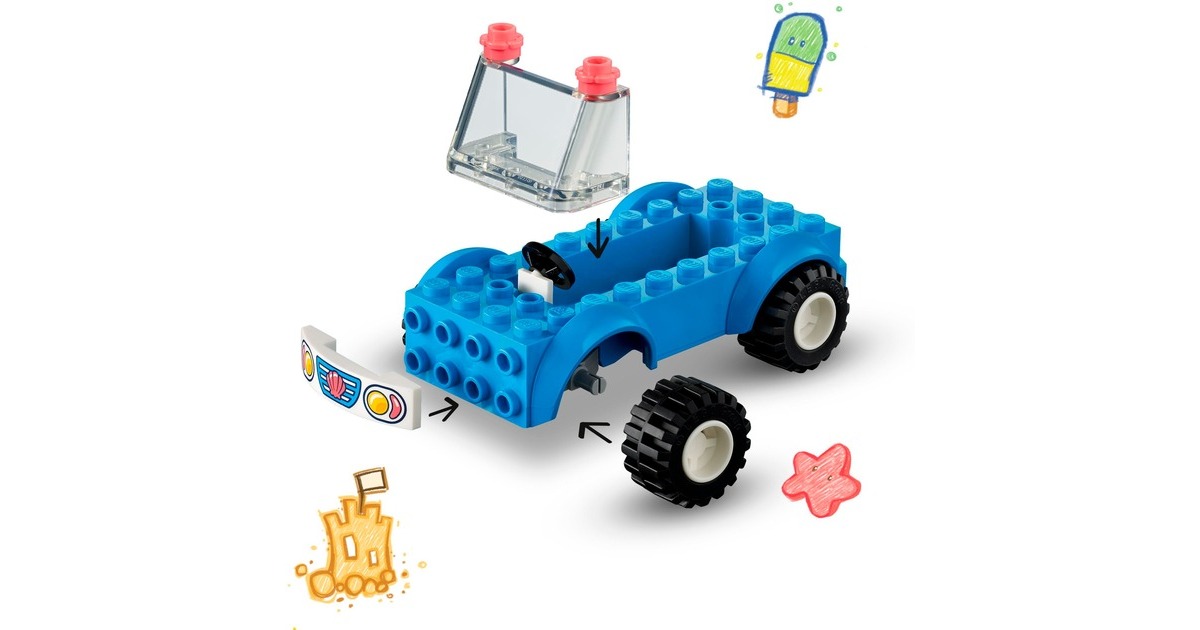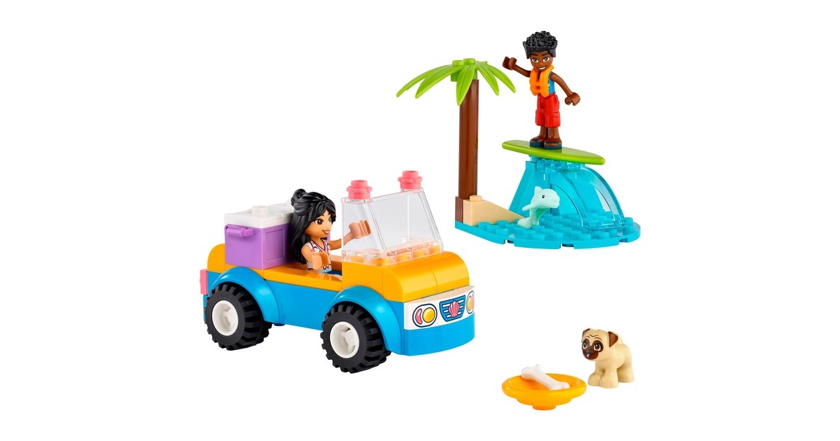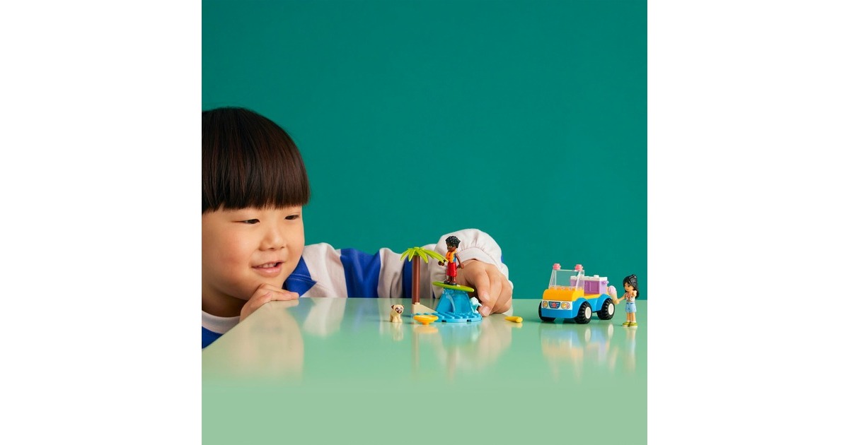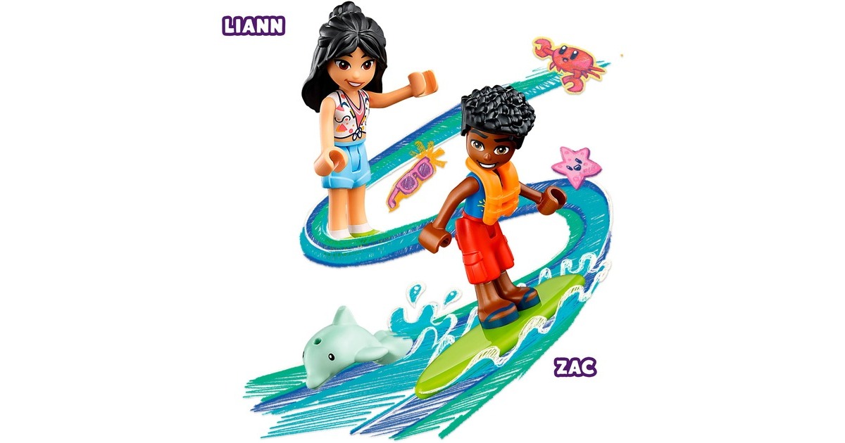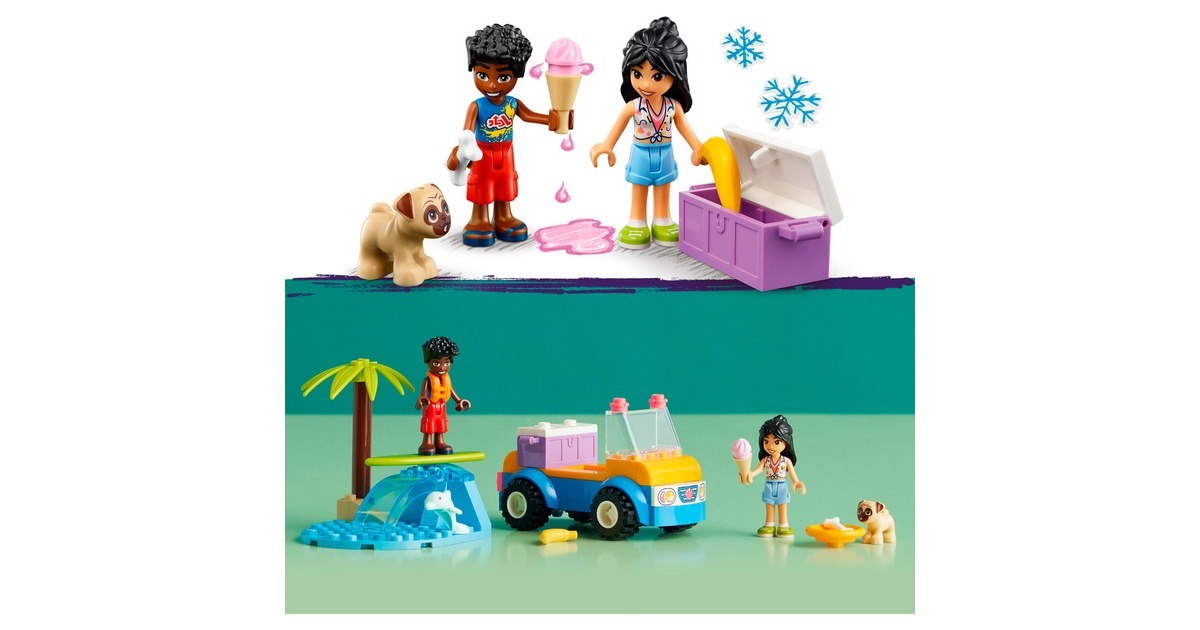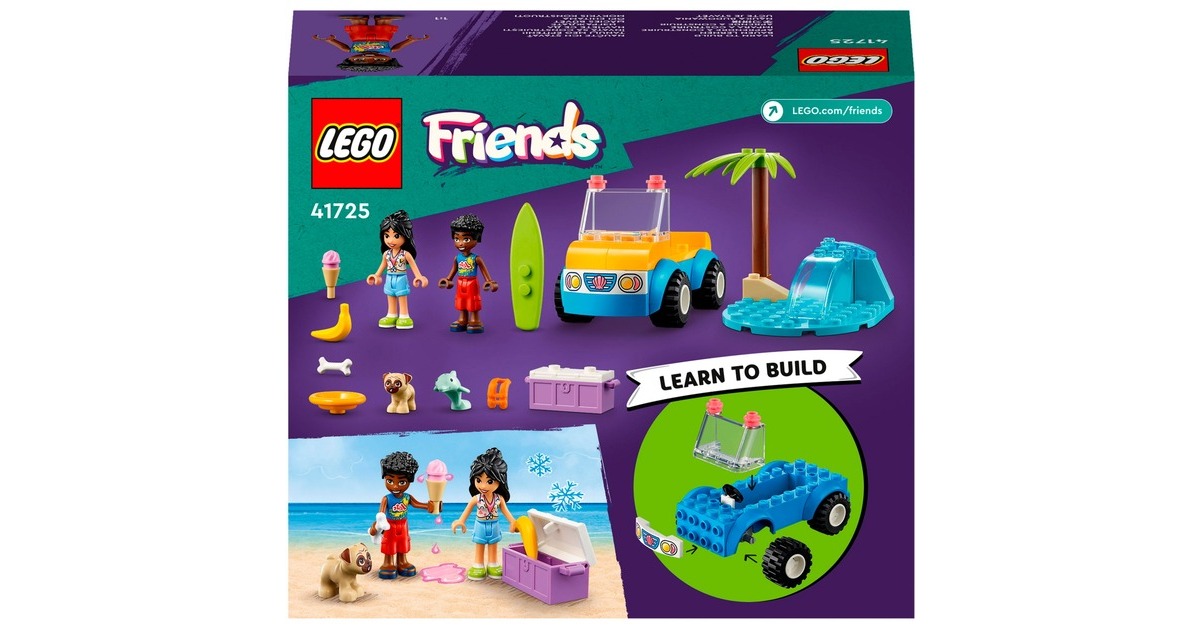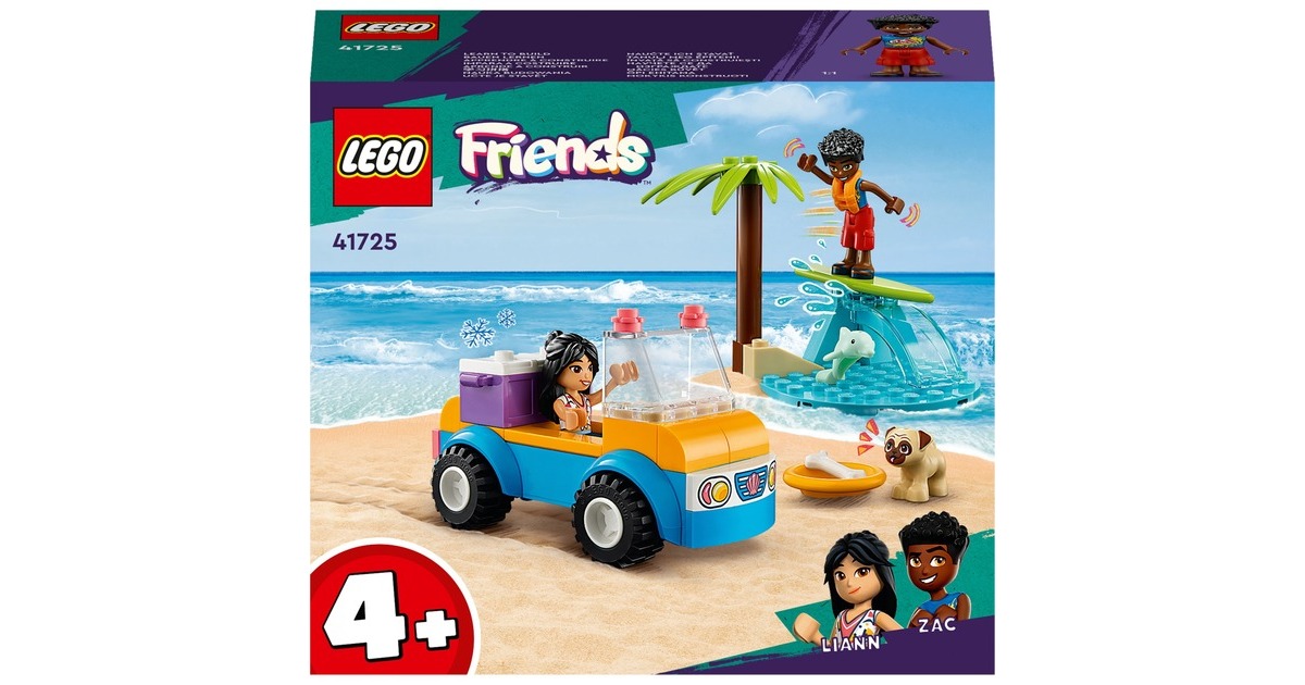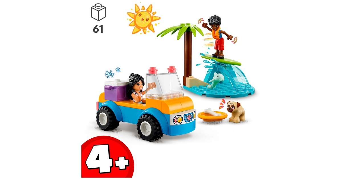 Ein toller Tag am Strand! Liann ist mit ihrem Strandbuggy gekommen, um sich mit ihrem Freund Zac zu treffen. Sie hat auch eine Kühlbox mit Banane und köstlichem Speiseeis dabei. Zac ist gerade beim Wellenreiten und wird von einem Babydelfin begleitet. Die Freunde genießen ihr Sonnenbad. Und Zacs Hund Dango knabbert im Schatten der Palme an einem Knochen. Das Set enthält neben dem baubaren Strandbuggy die Friends-Spielfiguren Liann und Zac, einen Mops, einen Delfin und eine Welle. Mit dem Starter-Bauelement ist der Aufbau auch schon für Kinder ab 4 Jahren gut zu bewältigen. Art.-Nr.: 1900955