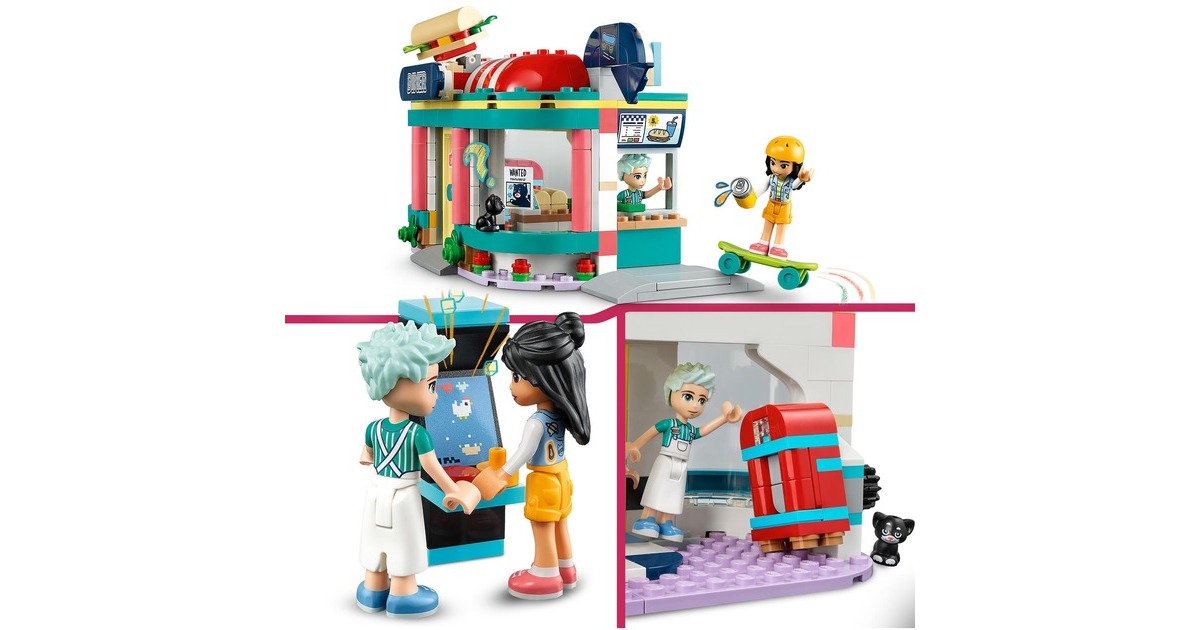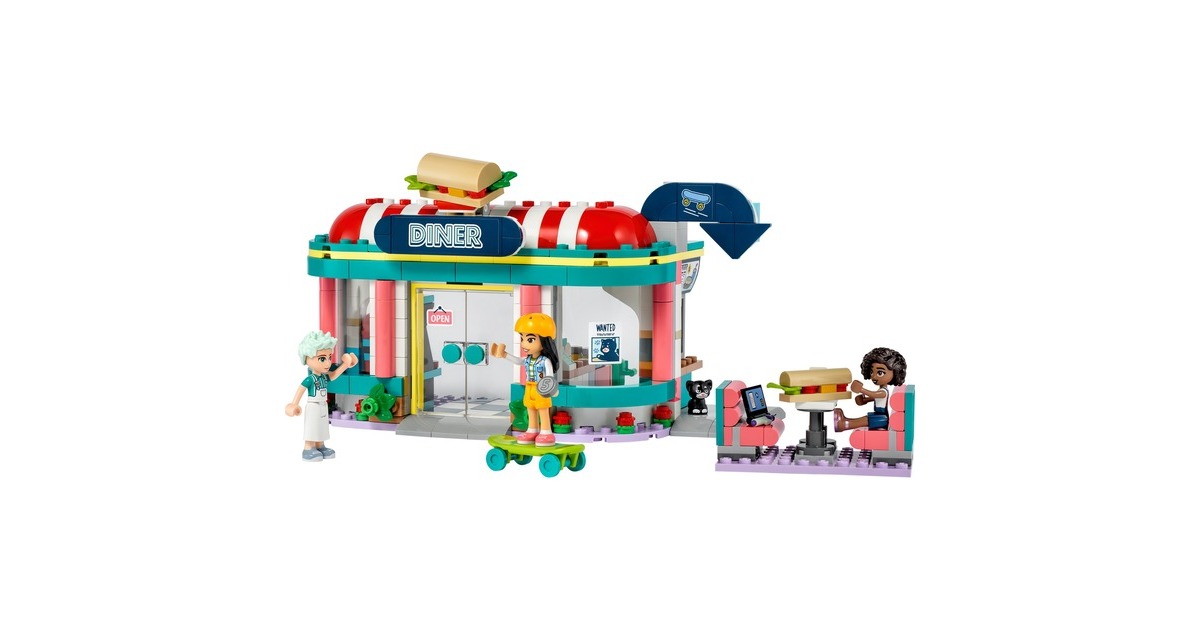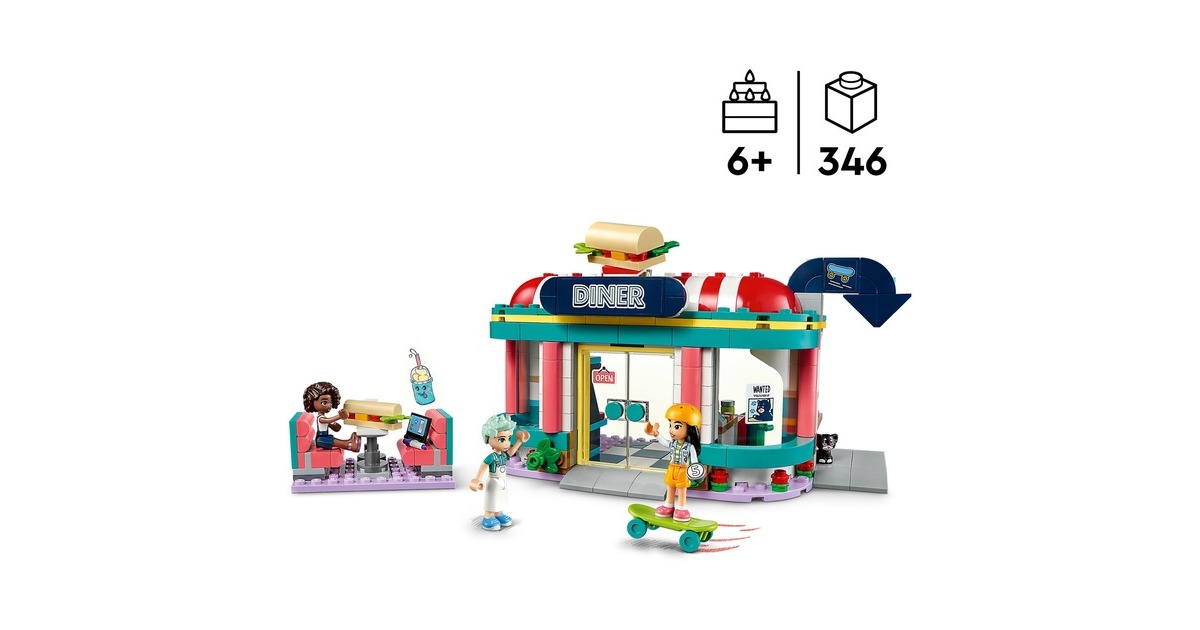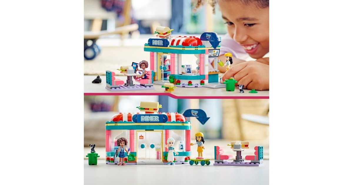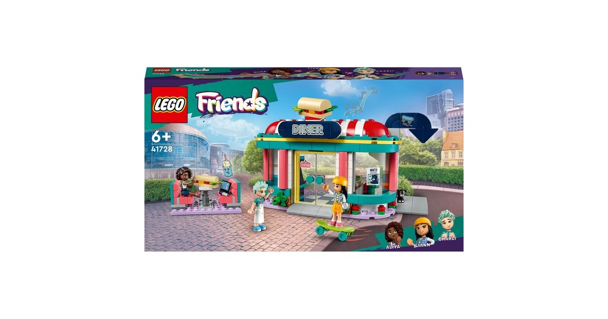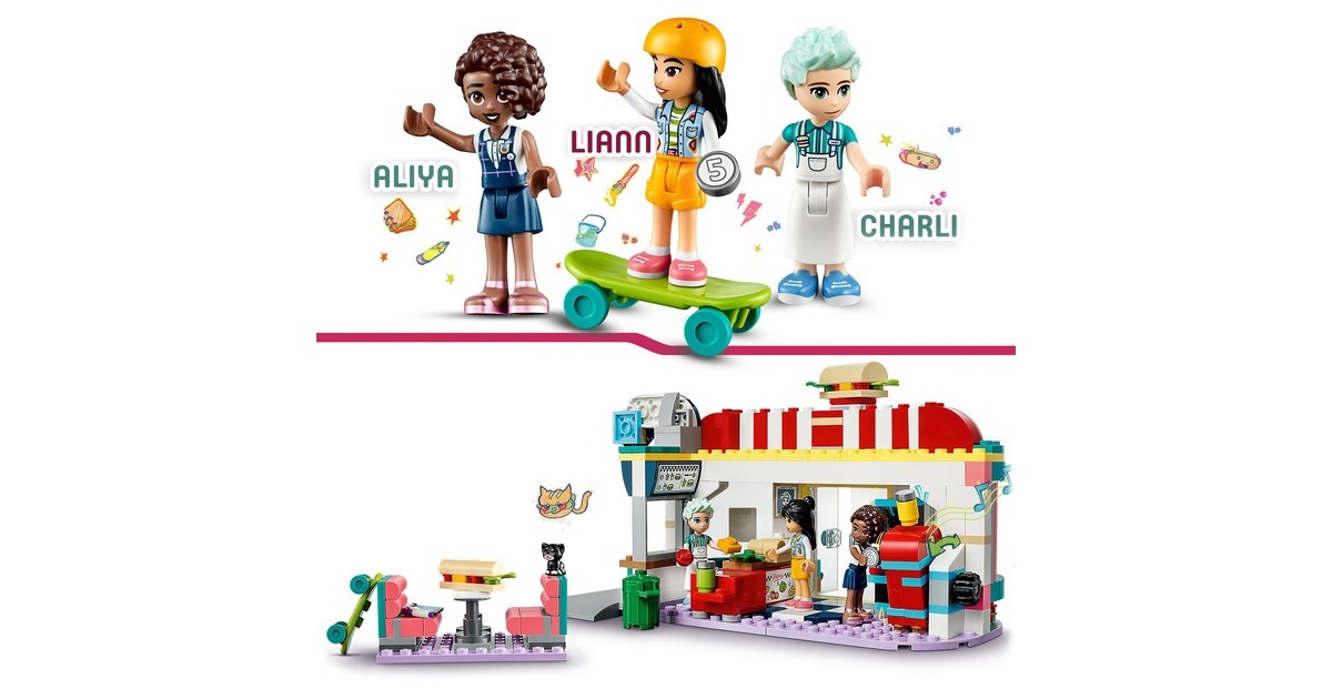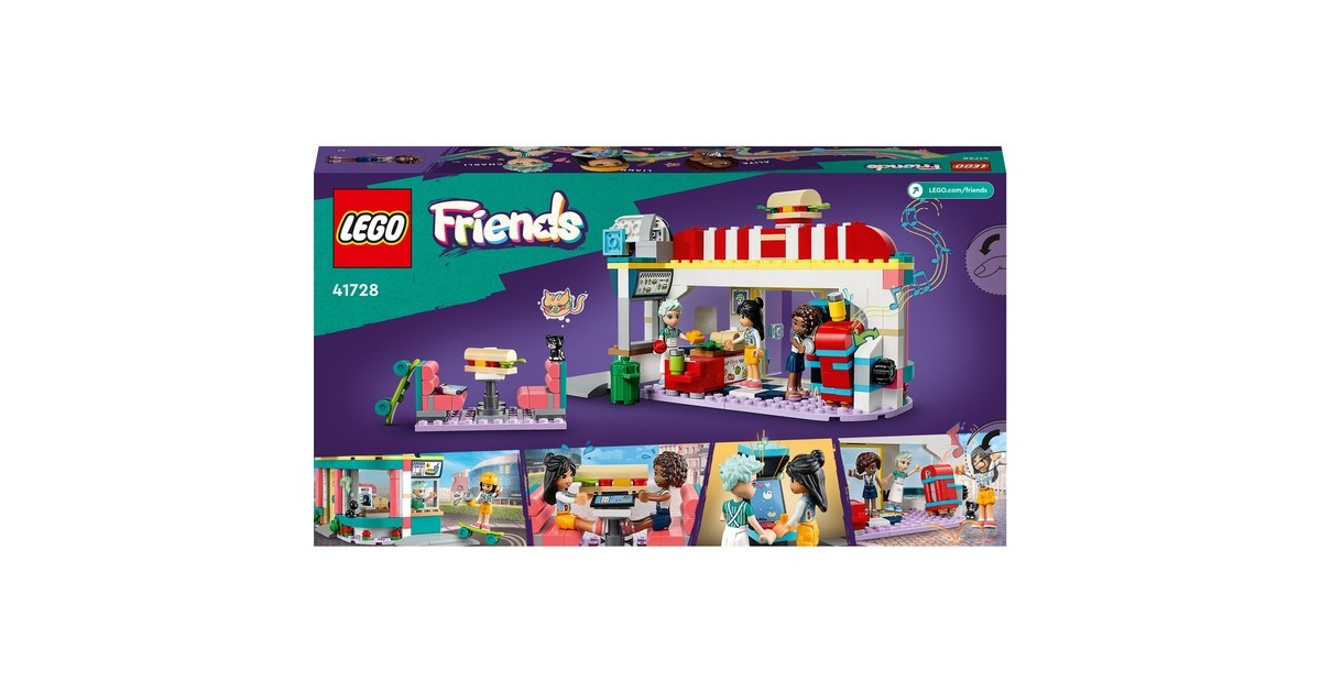 Das LEGO Friends Restaurant ist voll ausgestattet: Dazu gehört ein Drive-In-Schalter, eine Gästeterrasse, ein Spielautomat und eine bewegliche Jukebox. Mit dem Salat aus dem Kühlschrank können Sandwiches belegt werden. Das weitere Zubehör umfasst unter anderem 2 Getränke, Geld, 3 Scheiben Brot, einen Serviettenhalter, einen Mülleimer und ein Skateboard. Und es gibt sogar eine freche Katze, die gern im Restaurant vorbeischaut. Mit dabei sind die Spielfiguren Liann, Aliya und Charli sowie jede Menge Restaurantzubehör.Art.-Nr.: 1869313