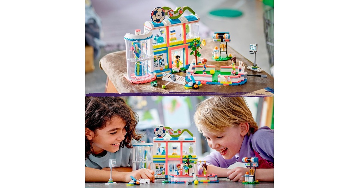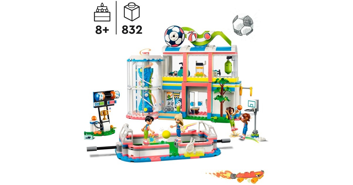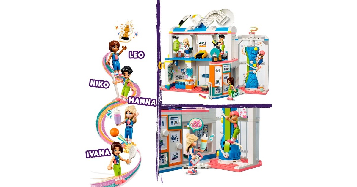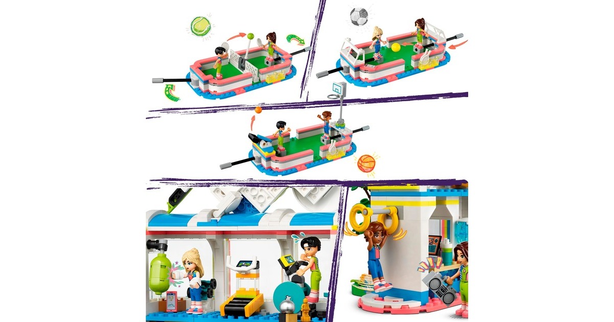 Sport tut gut - auch in Heartlake City! Niko ist nach Heartlake City gezogen und lernt Leo beim Fußballspielen kennen. Heute begleiten die beiden Ivana und Hanna, um all die verschiedenen Sportarten auszuprobieren, die das Sportzentrum so zu bieten hat. Da gibt es Fußball, Basketball, Tennis und eine Kletterwand. Ein Spielfeld lässt sich durch Austauschen der Tore und Netze für unterschiedliche Sportarten nutzen. Es gibt auch eine Anzeigetafel und eine Ablage für die Bälle. Nach dem Spielen können die Freunde noch in den Fitnessraum oder gleich in die Umkleide gehen. Und dann gönnen sie sich eine Pause - und einen kleinen Snack. Das Set enthält 4 Friends-Spielfiguren: Niko, Leo, Ivana und Hanna sowie viel Zubehör für verschiedene Sportarten. Art.-Nr.: 1900959