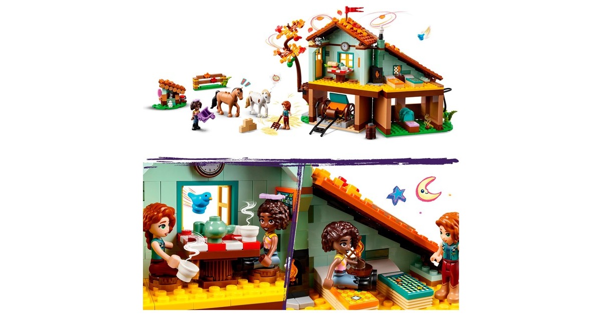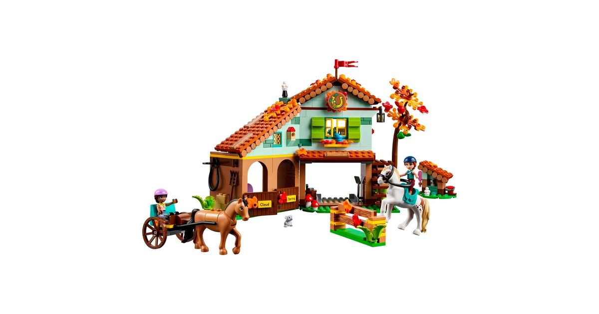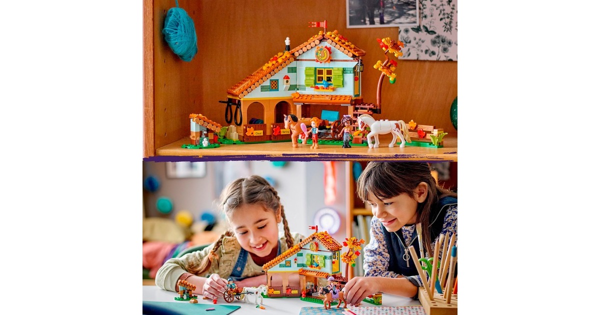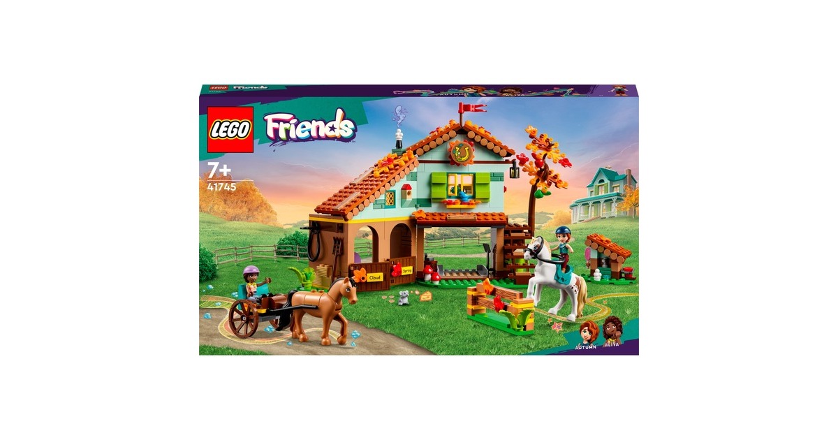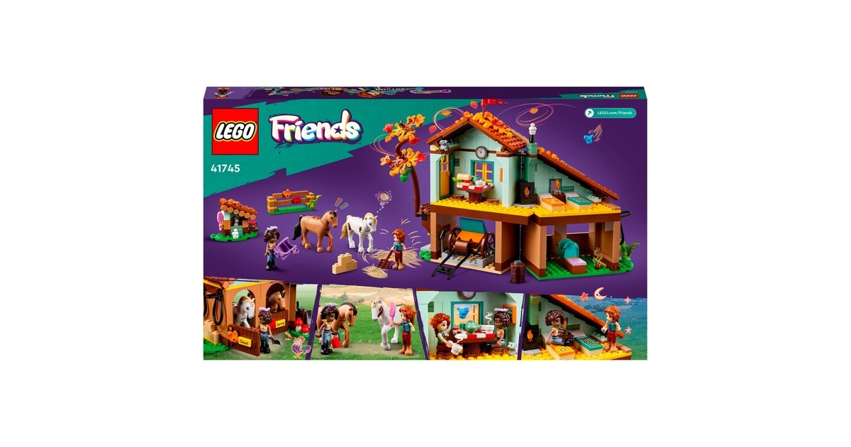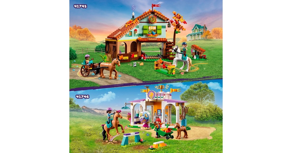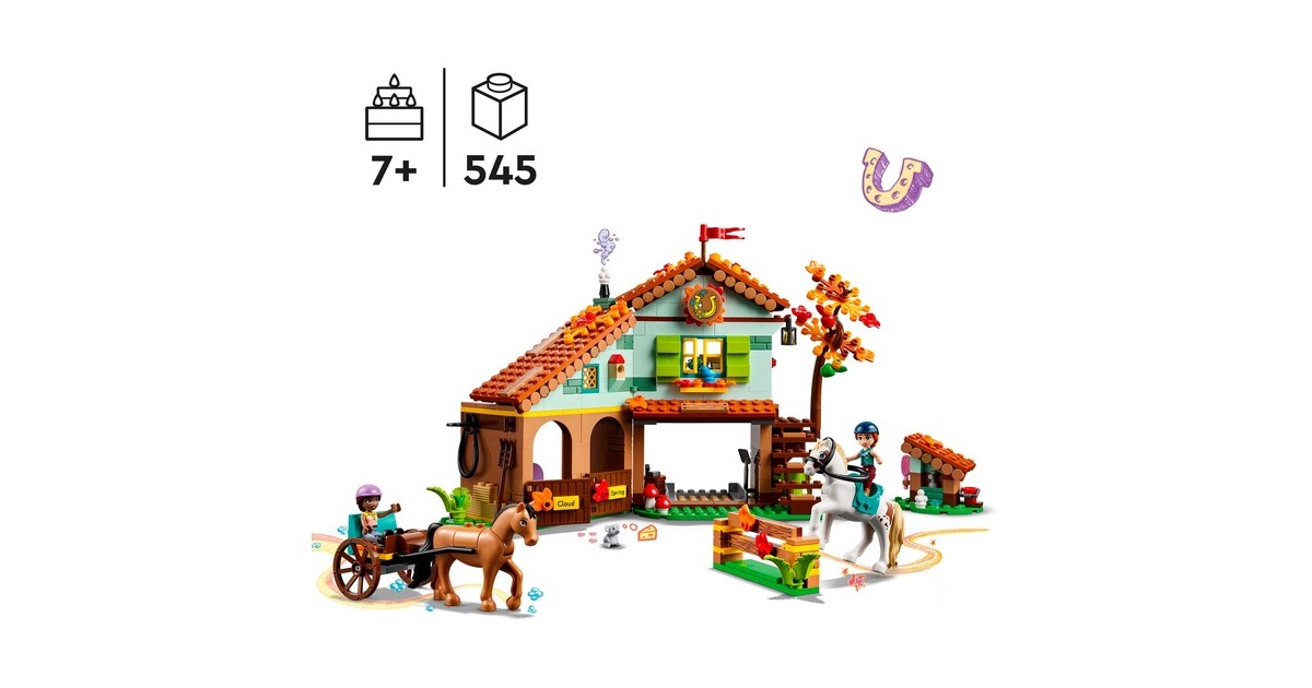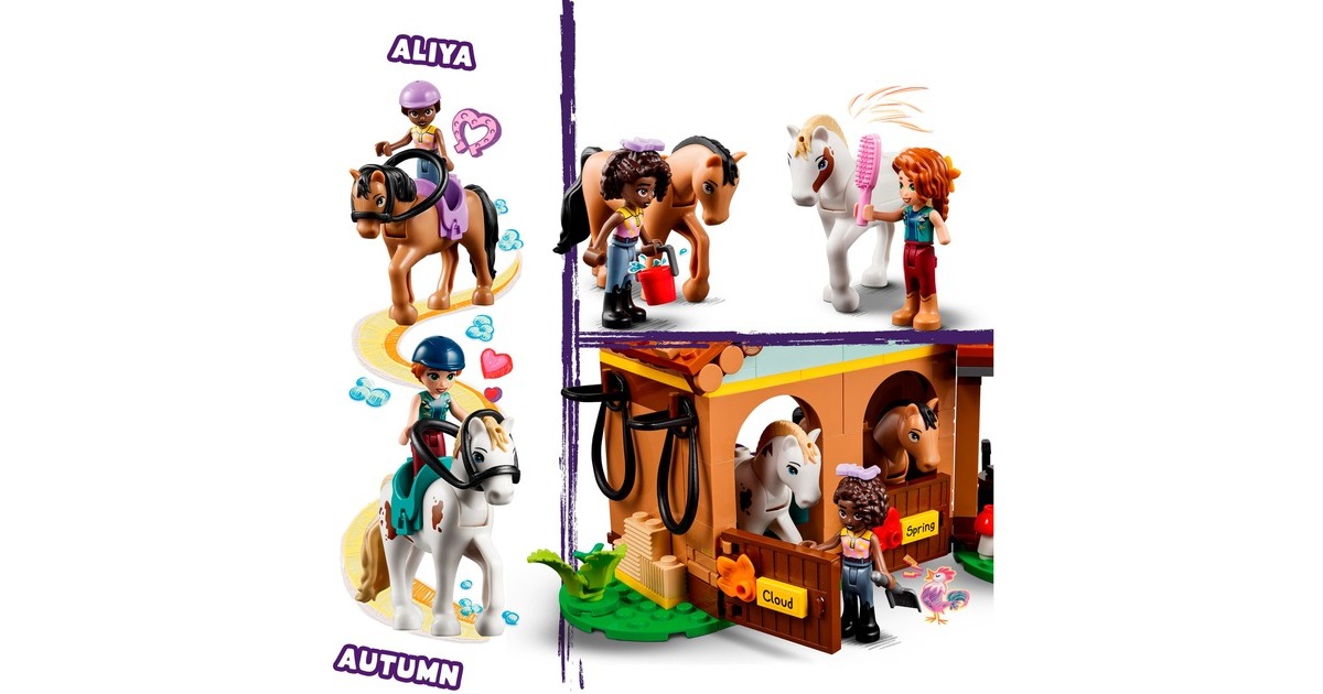 Autumn liebt ihren Reitstall - und lädt gerne Freunde dorthin ein. Heute ist Aliya da und hilft bei der Stallarbeit. Danach können die Pferde am Sprunghindernis trainieren. Dann die Boxen ausmisten, den Pferden einen Snack geben und danach können Autumn und Aliya in der Küche etwas trinken und ausruhen. Dann gibt es noch eine Kutschfahrt, wonach Aliya auf den gemütlichen Heubetten bei Autumn übernachten kann. Das Set beinhaltet die Friends-Spielfiguren Autumn und Aliya und viel Pflegezubehör wie eine Heugabel, eine Schaufel, Bürste, Eimer und einen Hammer zur Kontrolle der Hufeisen. Hinzu kommt eine baubare Kutsche. Art.-Nr.: 1900960
