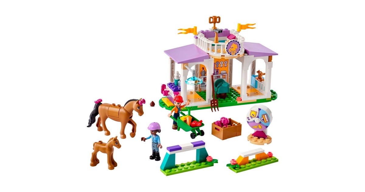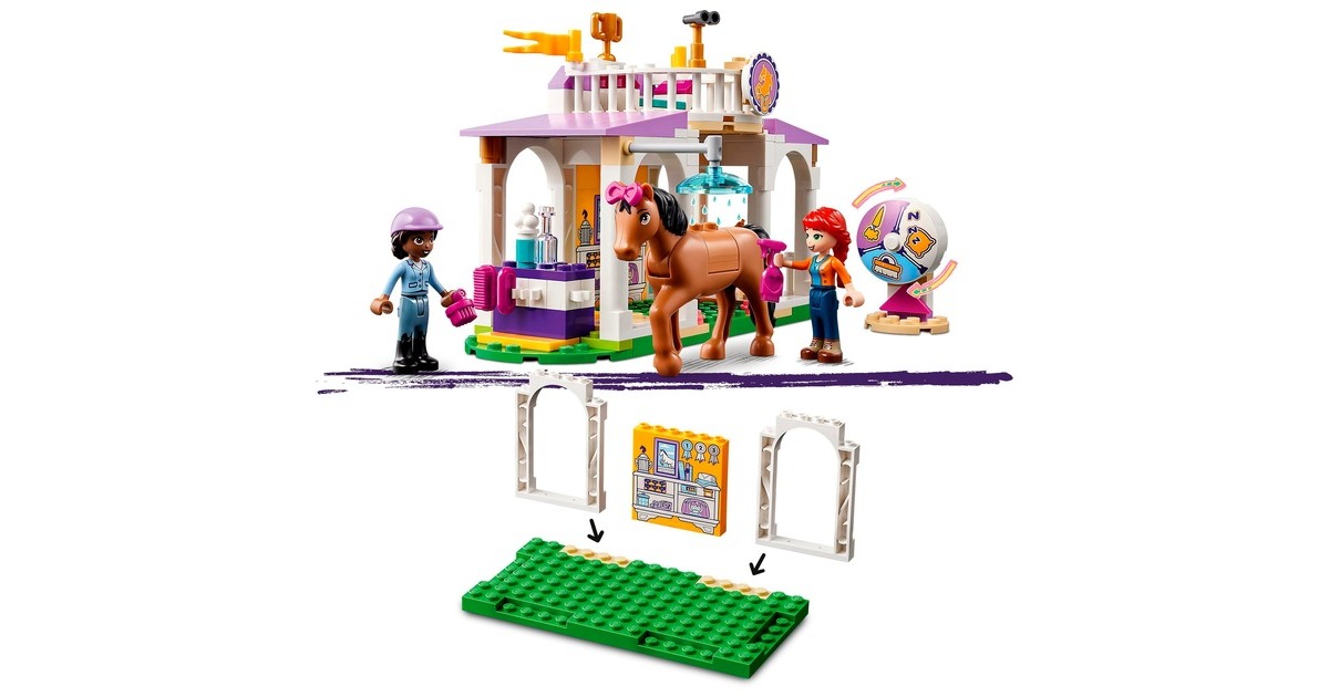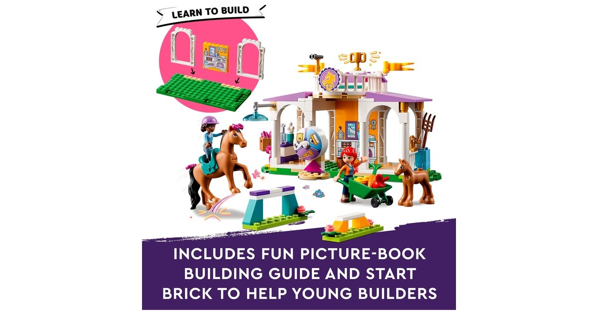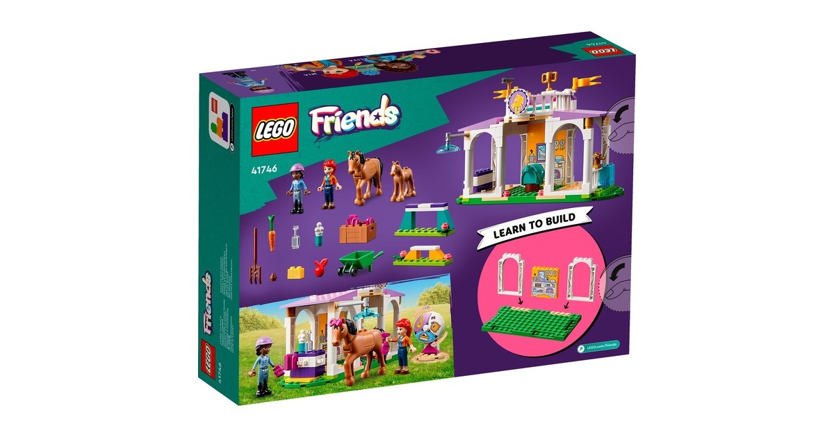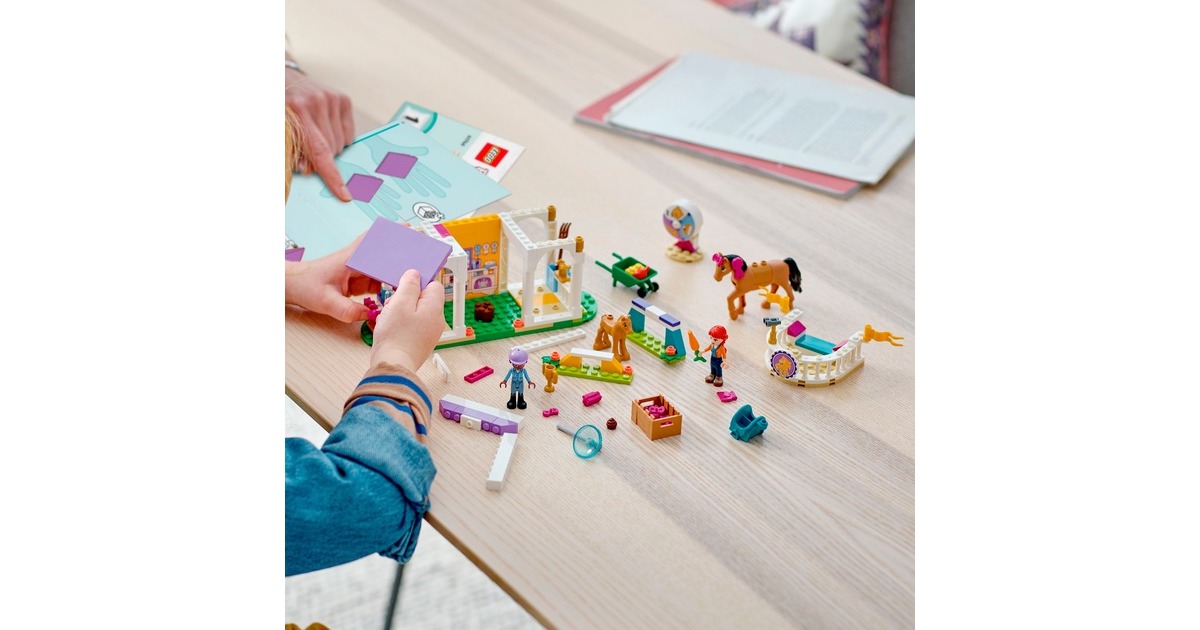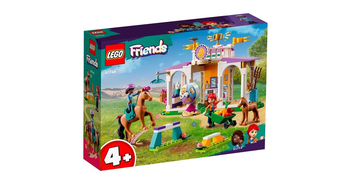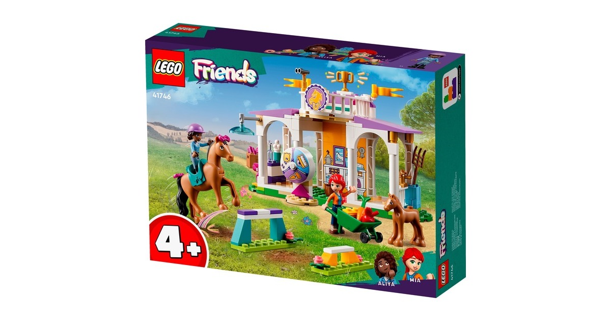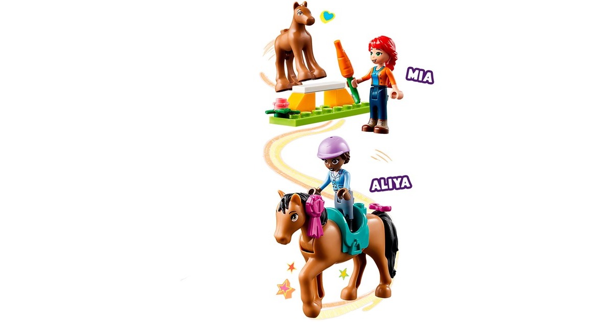 Die Pferdefreunde von Heartlake City kommen immer gerne in diese tolle Reitschule! Aliya hilft Mia, die Stute und ihr Fohlen zu versorgen. Im Reitstall ist alles vorhanden, was sie brauchen. Aliya liebt das Reiten und lässt das Pferd beim Training gern über die Hindernisse springen. Aliya und Mia striegeln die Stute und ihr Fohlen, misten den Stall aus und setzen sich dann auf den Balkon, um den Pferden beim Spielen zuzuschauen. Dieses Set enthält die Friends-Spielfiguren Aliya und Mia, 2 Pferde und viel Zubehör. Mit dem Starter-Bauelement ist der Aufbau auch schon für Kinder ab 4 Jahren gut zu bewältigen. Art.-Nr.: 1900962
