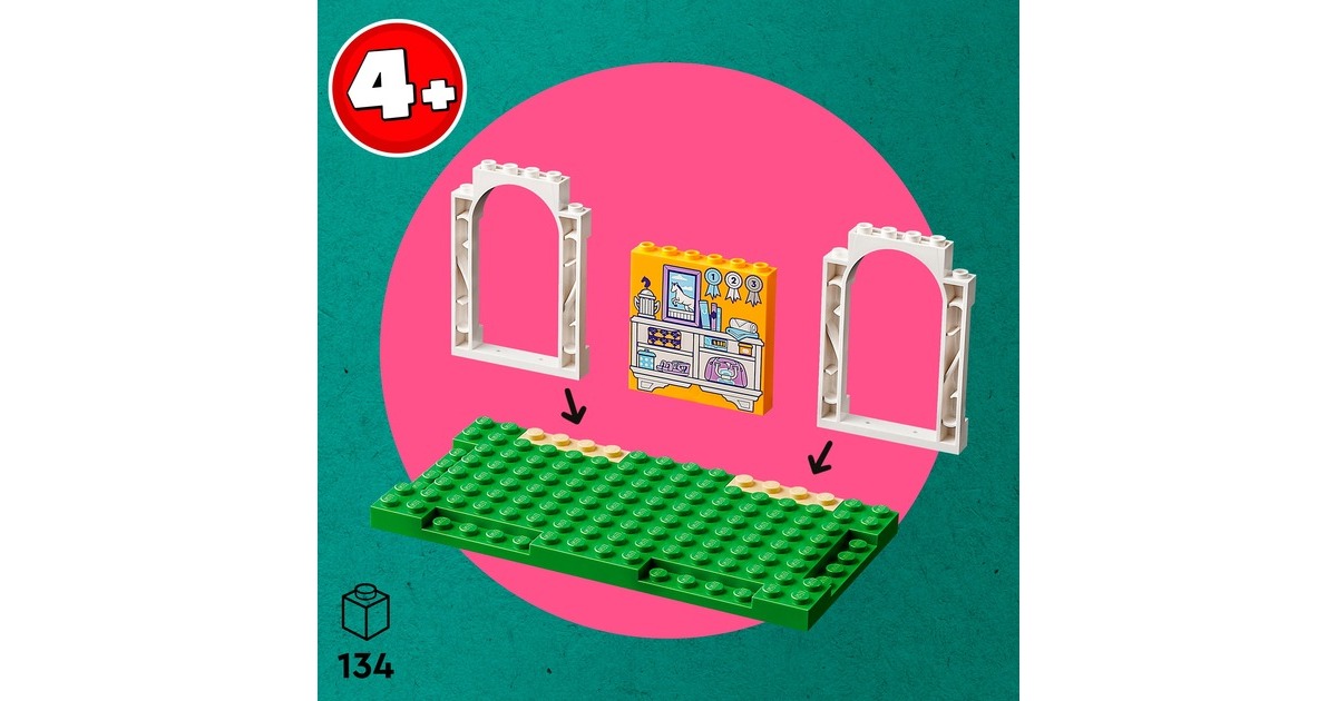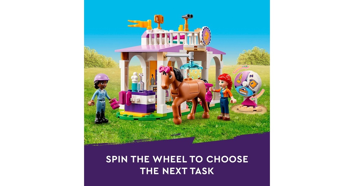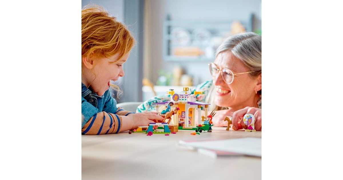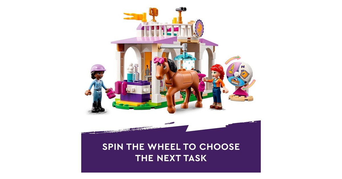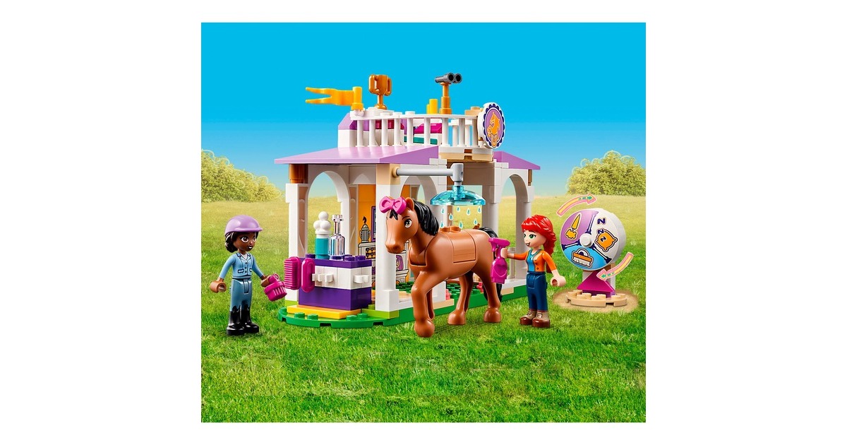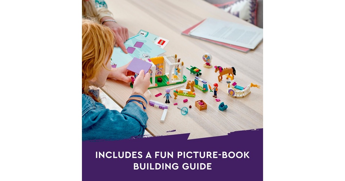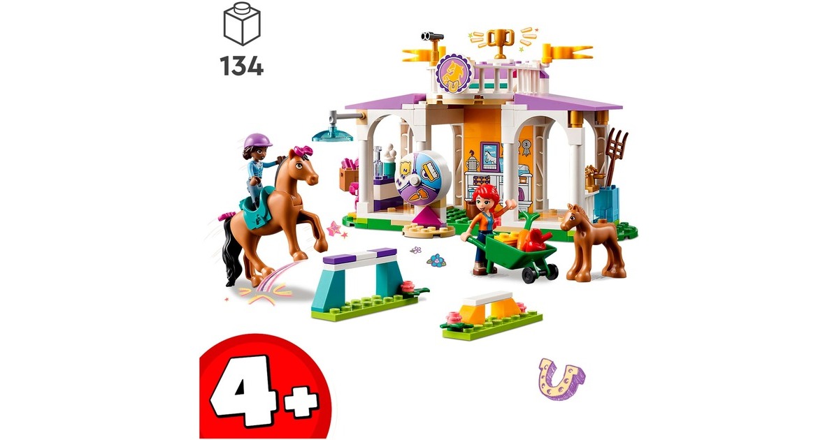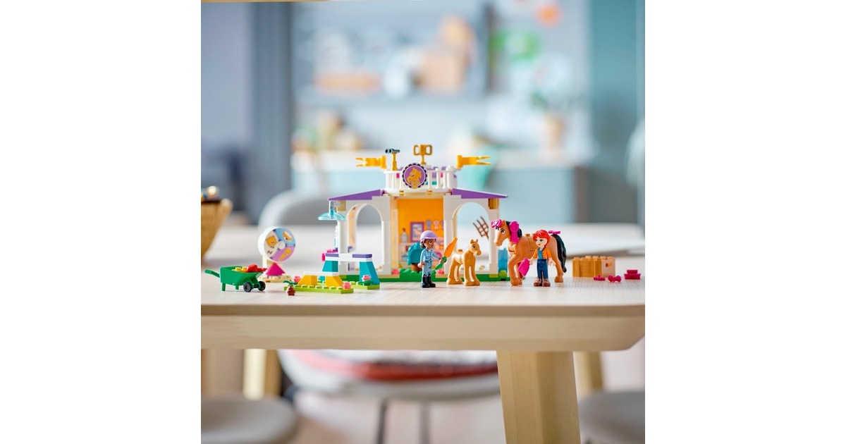 Die Pferdefreunde von Heartlake City kommen immer gerne in diese tolle Reitschule! Aliya hilft Mia, die Stute und ihr Fohlen zu versorgen. Im Reitstall ist alles vorhanden, was sie brauchen. Aliya liebt das Reiten und lässt das Pferd beim Training gern über die Hindernisse springen. Aliya und Mia striegeln die Stute und ihr Fohlen, misten den Stall aus und setzen sich dann auf den Balkon, um den Pferden beim Spielen zuzuschauen. Dieses Set enthält die Friends-Spielfiguren Aliya und Mia, 2 Pferde und viel Zubehör. Mit dem Starter-Bauelement ist der Aufbau auch schon für Kinder ab 4 Jahren gut zu bewältigen. Art.-Nr.: 1900962