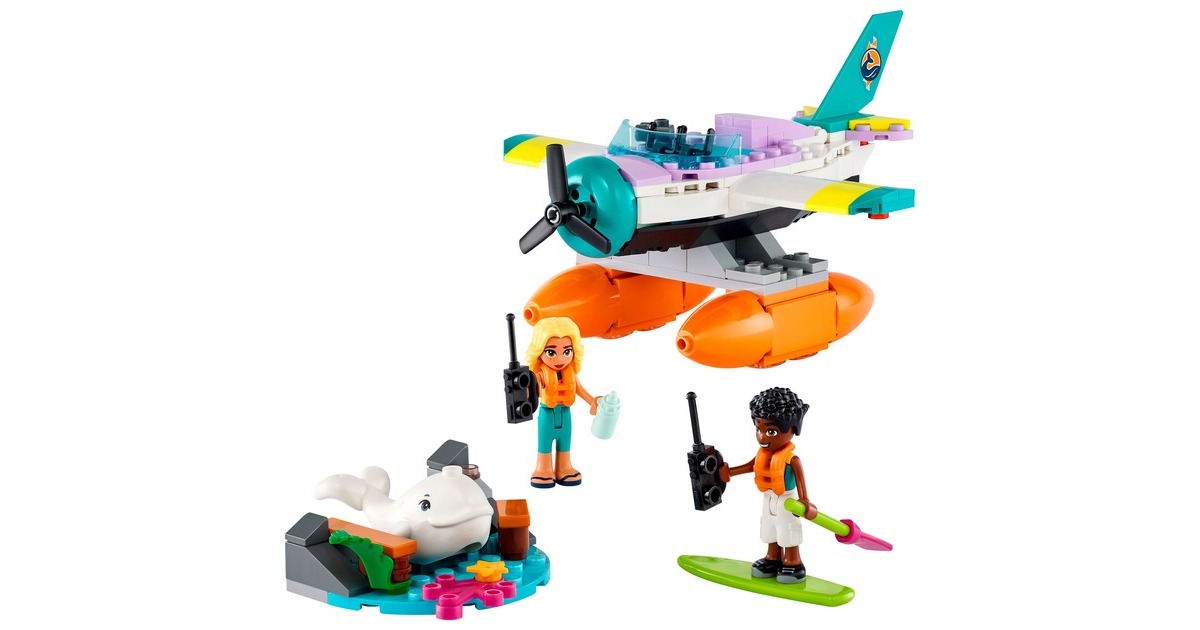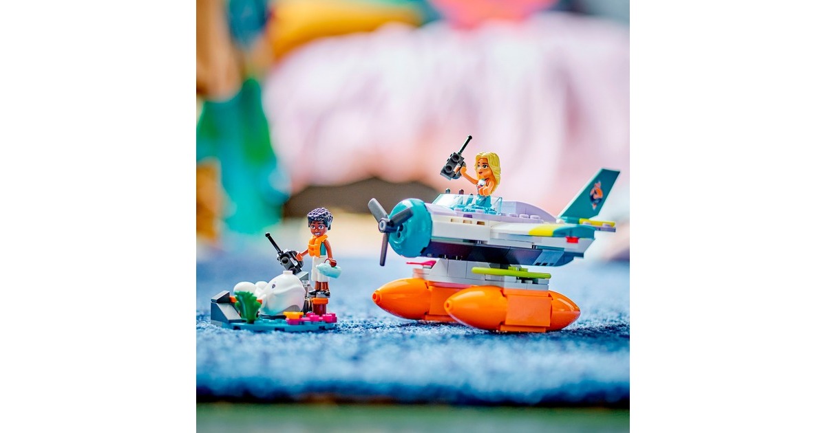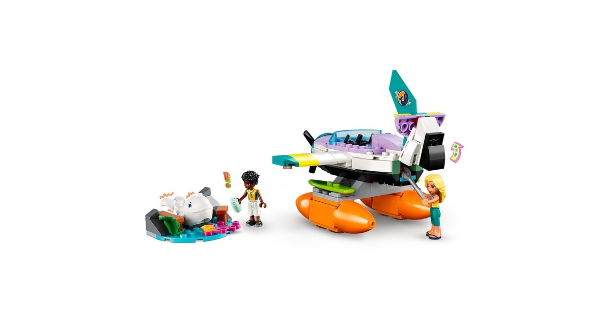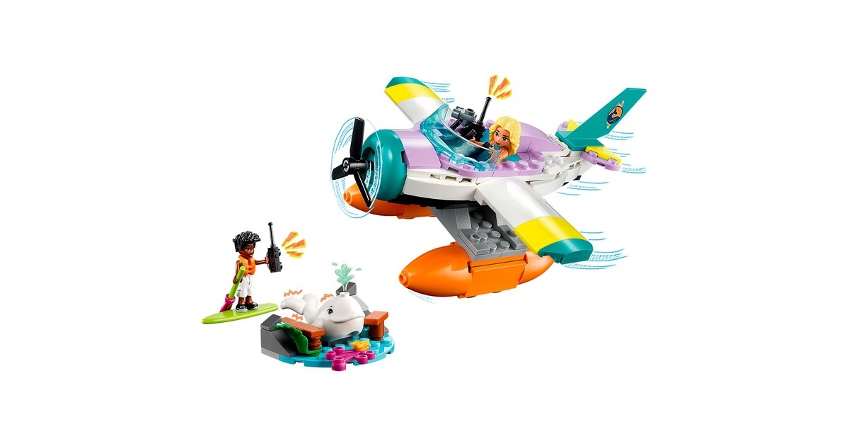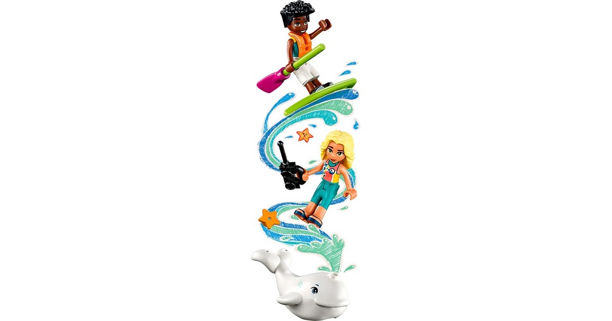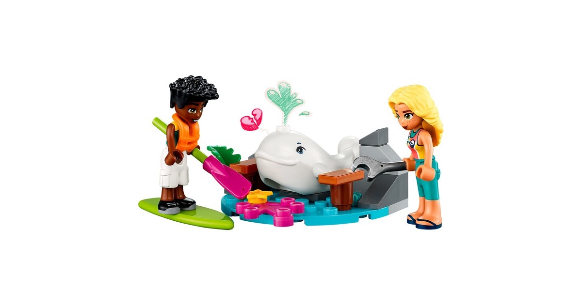 Mit LEGO Friends auf Wal-Rettungsmission: Zac hat einen Weißwal entdeckt, der zwischen Felsbrocken und altem Treibholz am Strand von Heartlake City festklemmt. Doch Dia ist schon mit ihrem Seerettungsflugzeug in der Luft. Zac funkt Dia an, damit sie zusammen den Wal retten können. Sobald der Wal wieder sicher ins Meer zurückgekehrt ist, darf sich Zac auf einen Rundflug freuen. Das baubare Rettungsflugzeug aus diesem Set hat 2 Sitze und einen Frachtraum. Die Strandkulisse besteht aus Zacs Paddelbrett und Teilen, die sich bewegen lassen. Mit dabei sind zwei Friends-Figuren und ein weißer Wal. Art.-Nr.: 1904688
