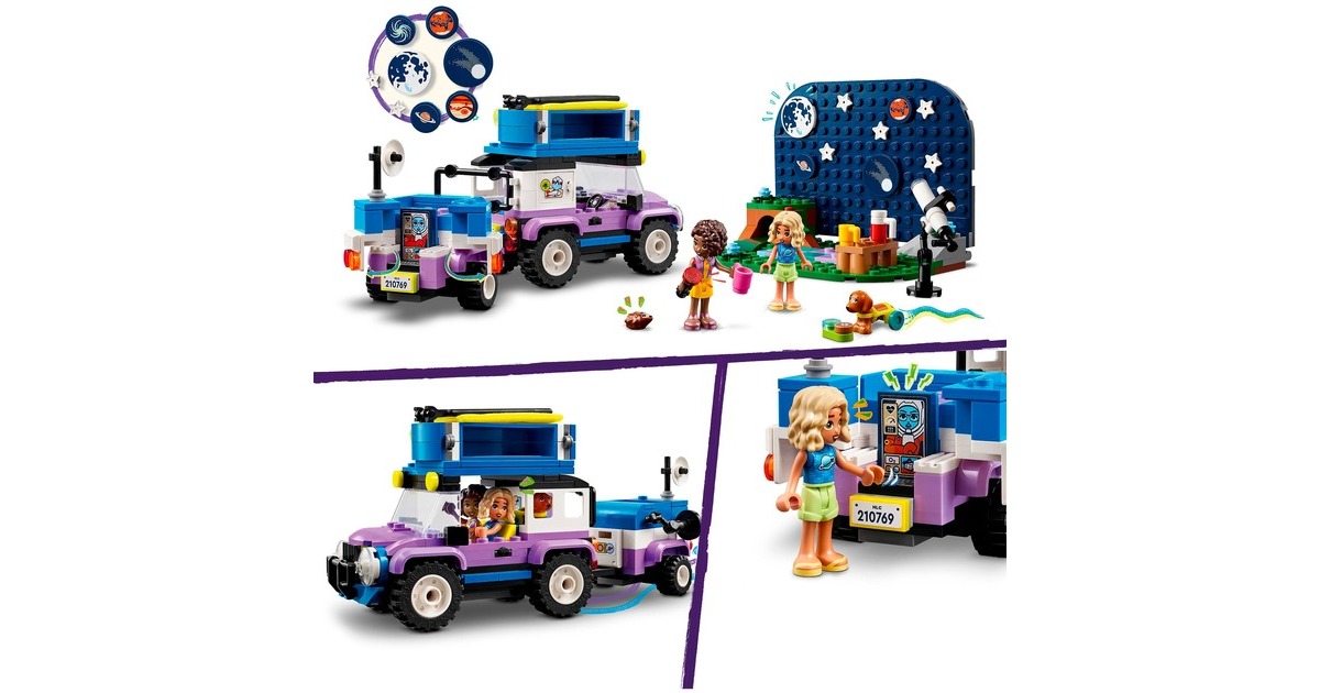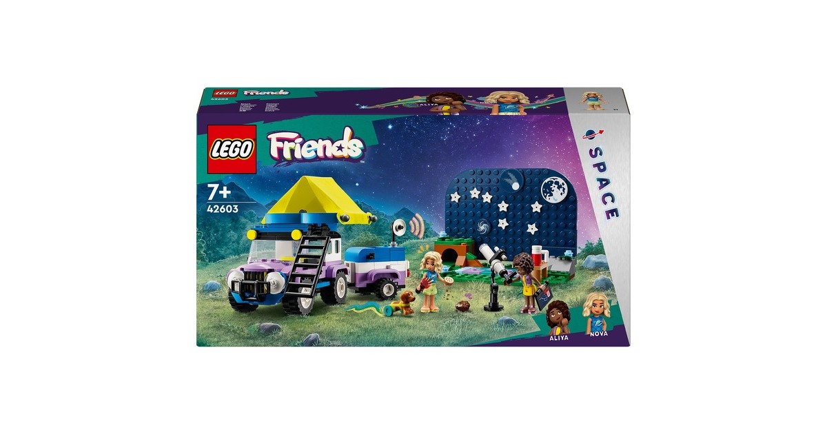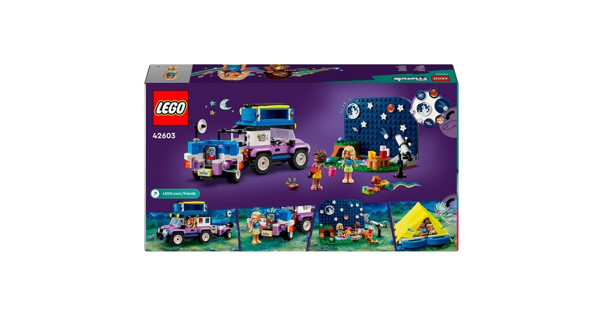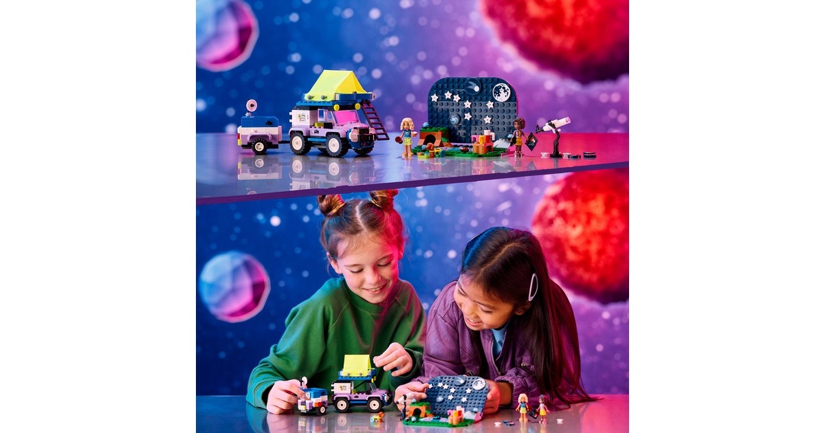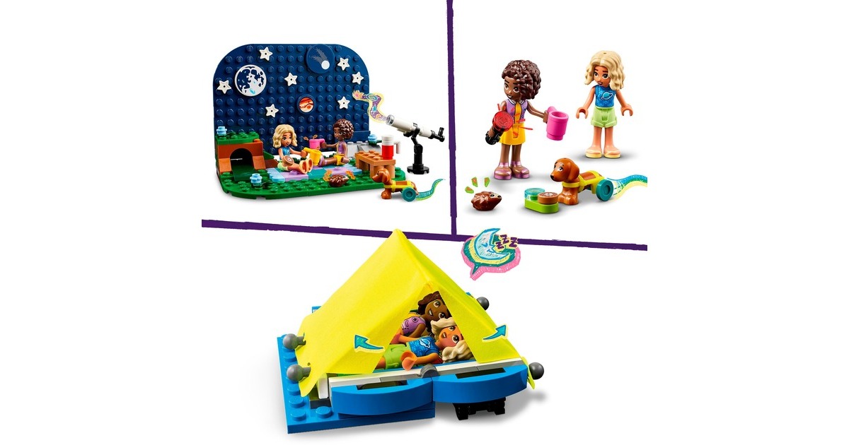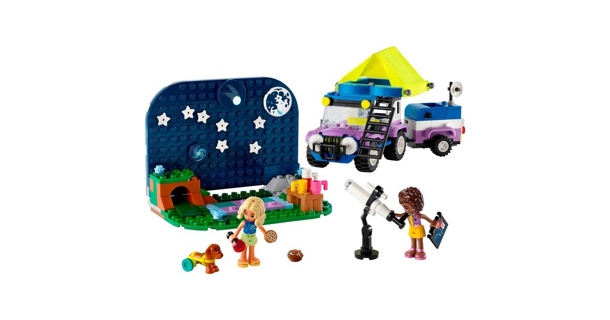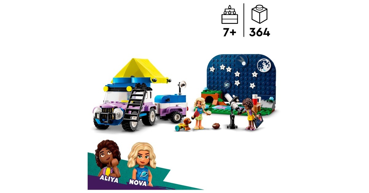 Auf in die Natur und Sterne beobachten: Mit dem Sternengucker-Campingfahrzeug aus der Serie LEGO Friends gibt es jede Menge zu entdecken. Es enthält ein baubares Spielzeug-Teleskop und einen kleinen Geländewagen mit Anhänger und faltbarem Dachzelt. Auf dem ebenfalls enthaltenen Hintergrund können Planeten- und Sternteile dazu genutzt werden, verschiedene Sternbilder anzuordnen. In diesem Set ist außerdem eine breite Auswahl an Zubehör wie Becher, Kekse, ein Fernglas und eine Taschenlampe enthalten. Hinzu kommen die LEGO Friends-Figuren Nova und Aliya sowie ein Hund und ein Igel. Dieses Set für von Wissenschaft und Astronomie begeisterte Kinder besteht aus 364 Teilen.Art.-Nr.: 100012188