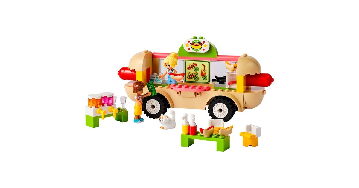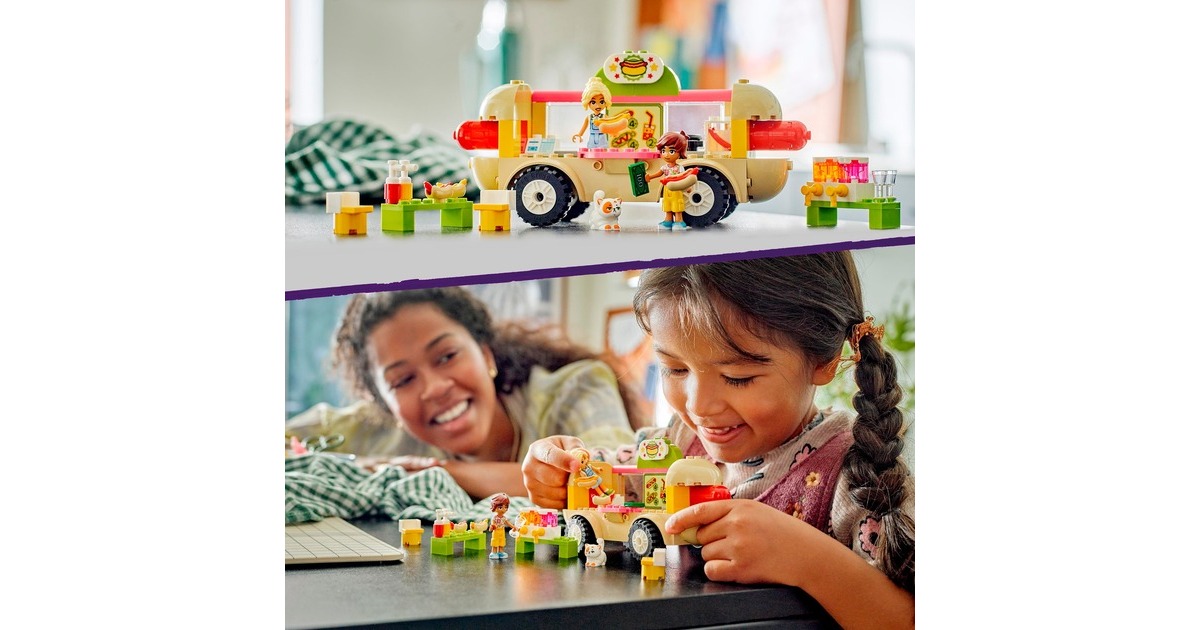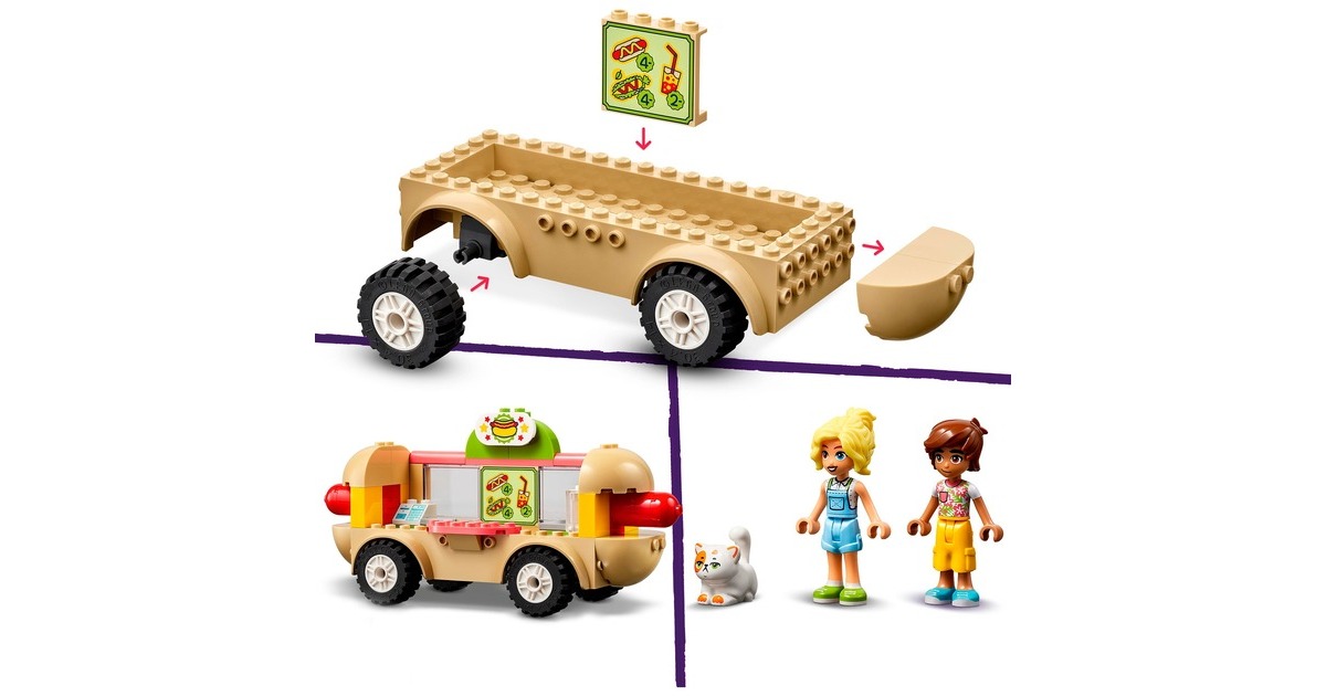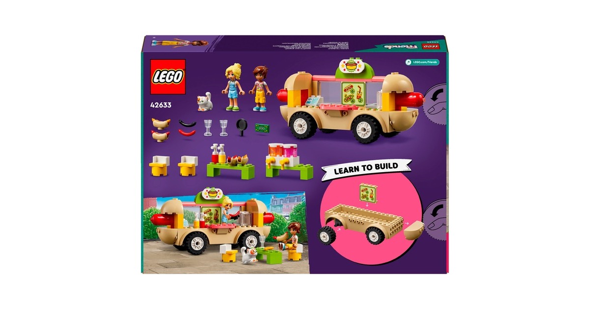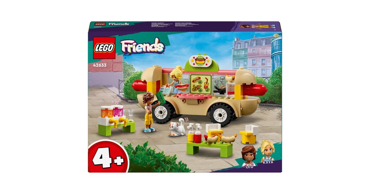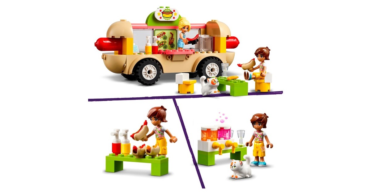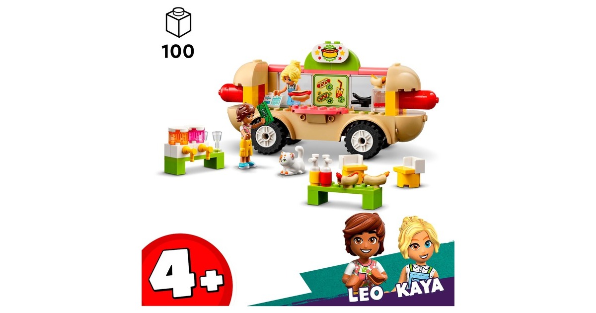 Leckere und frische Hotdogs gibt es jetzt auch in Heartlake-City - mit diesem tollen Hotdog-Truck! Das Set aus der Serie LEGO Friends beinhaltet einen baubaren Foodtruck und viel Zubehör. Mit dem Herd, einer Pfanne, einer Kasse, einem Grill, einem Kühlschrank und verschiedenen Hotdog-Zutaten ergeben sich vielfältige Spielmöglichkeiten. Kaya ist als LEGO Friends-Minifigur enthalten und kümmert sich um die die Zubereitung der Hotdogs. Leo kommt mit seiner niedlichen Katze Churro zum Essen und auf eine Unterhaltung vorbei. Dieses Set mit 100 Teilen ermöglicht einen leichten Start in das LEGO-Bauen und ist bereits für Kinder ab 4 Jahren geeignet.Art.-Nr.: 100012184
