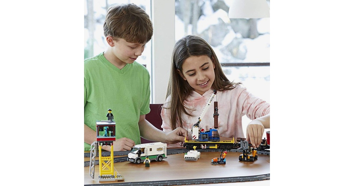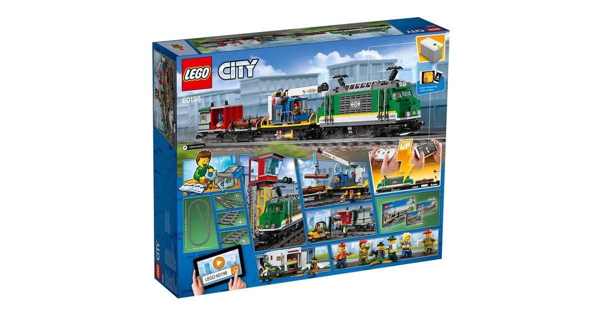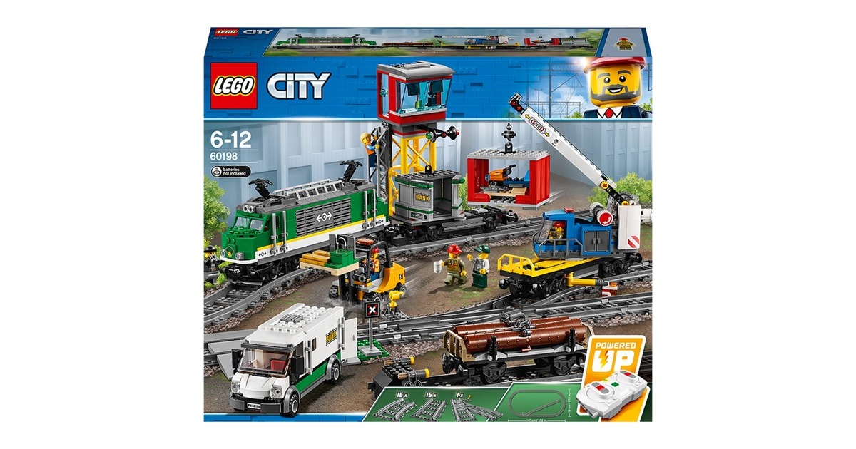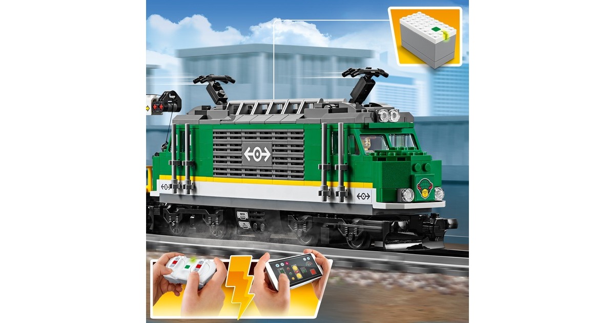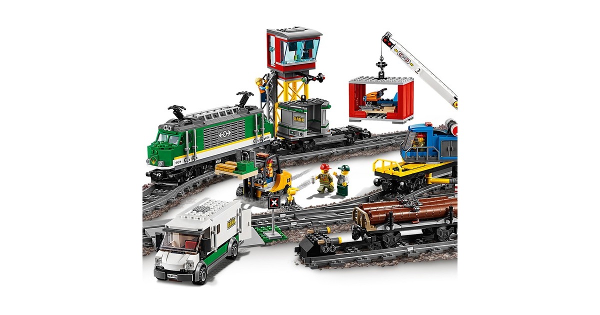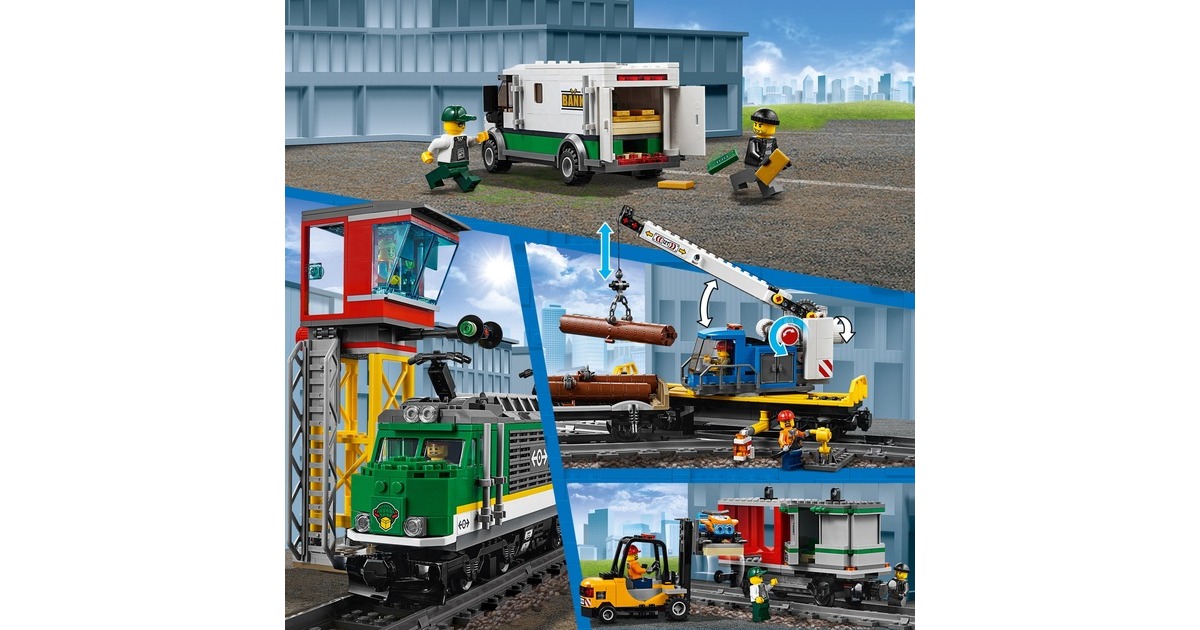 Bereite den diesen Güterzug auf seine nächste Fahrt vor! Benutze den Gabelstapler, um die Container zu beladen, bevor du sie mit dem Kran auf den Waggon hebst. Kopple alle Waggons an die Lokomotive an, steig in den Führerstand, lass die Pfeife ertönen und fahr los! Bring deine Fracht pünktlich ans Ziel, damit am LEGO City-Bahnhof keine Lieferengpässe entstehen! Dieses coole LEGO City-Set enthält eine motorisierte Lokomotive mit Bluetooth-Fernsteuerung (10 Geschwindigkeitsstufen) und zugänglichem Führerstand, einen Kranwaggon mit dreh- und ausfahrbarem Ausleger, einen Containerwaggon, einen Holzwaggon sowie einen gepanzerten Geldtransporter mit aufklappbaren Türen und einen Gabelstapler mit aufklappbarem Überrollkäfig und beweglicher Gabel. Außerdem sind eine komplette Rundstrecke aus 16 gekrümmten und 16 geraden Schienensegmenten sowie eine Leitstelle mit Leiter, zwei baubare Paletten mit Geldscheinen, Goldbarren, ein Schneemotorrad und 6 LEGO-Minifiguren enthalten.Art.-Nr.: 1445526