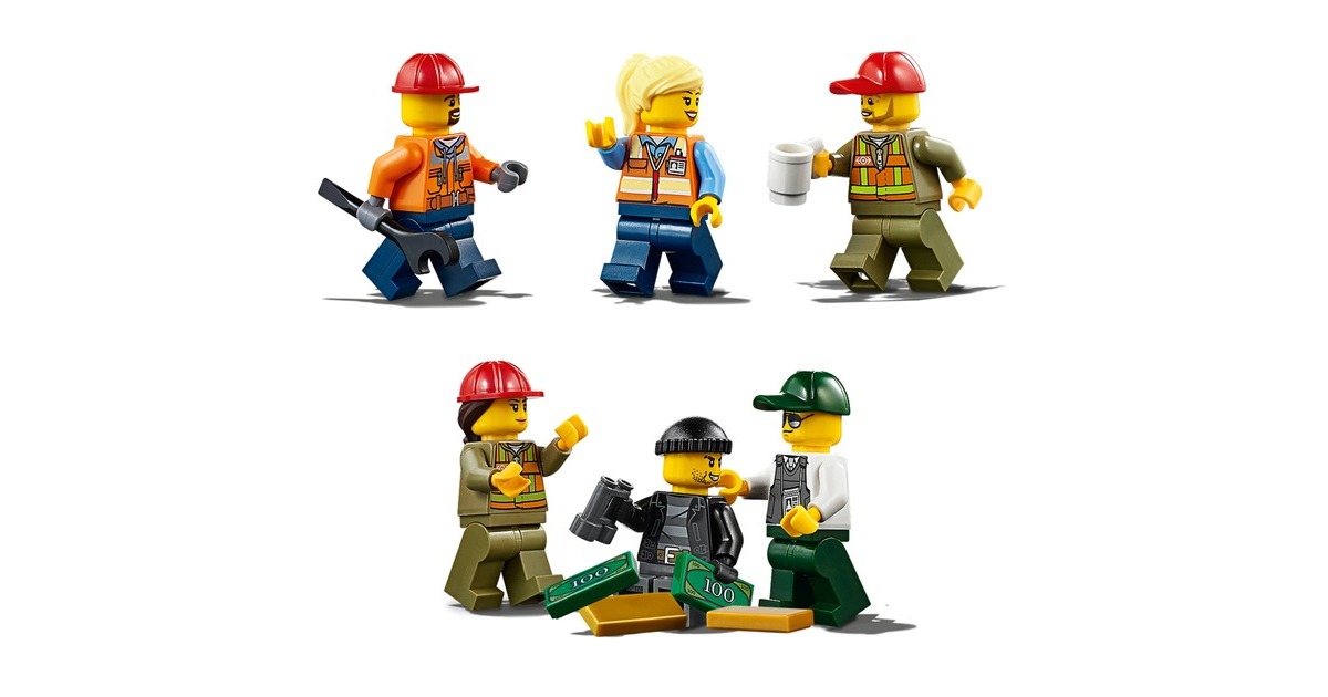 Enthaltene MinifigureN. 4 Bahnarbeiter, ein Sicherheitsmann, ein Ganove. Weiteres Zubehör: Ein Schraubenschlüsse, 12 Goldbarren, 4 Geldscheine, 3 Baumstämme. Der Güterzug ist 11 cm hoch, 82 cm lang und 6 cm breit. Die Lok ist 11 cm hoch, 27 cm lang und 6 cm breit. Der Holzwaggon ist 5 cm hoch, 15 cm lang und 6 cm breit. Der Kranwaggon ist 10 cm hoch, 22 cm lang und 5 cm breit. Der Containerwaggon ist 9 cm hoch, 18 cm lang und 5 cm breit. Der Geldtransporter ist 6 cm hoch, 15 cm lang und 6 cm breit. Die Leitstelle ist 21 cm hoch, 8 cm breit und 12 cm tief. Der Gabelstapler ist 7 cm hoch, 5 cm breit und 12 cm lang. |