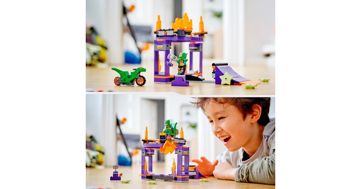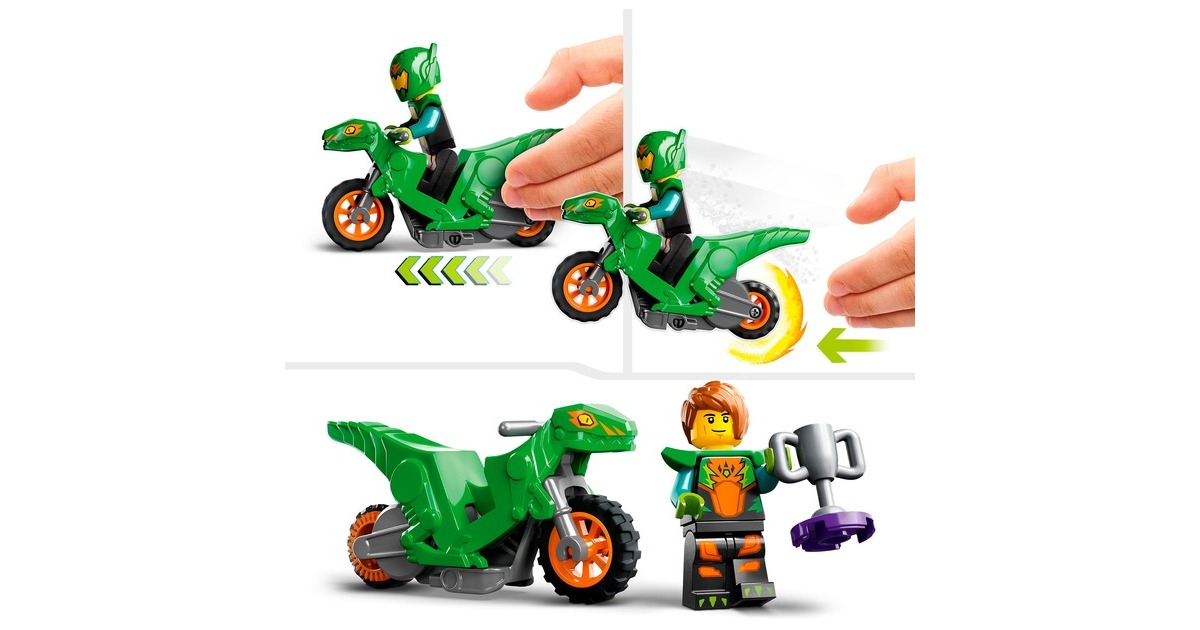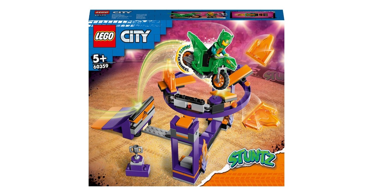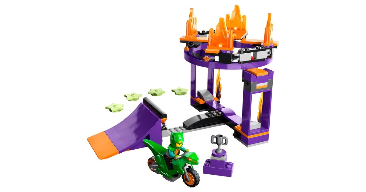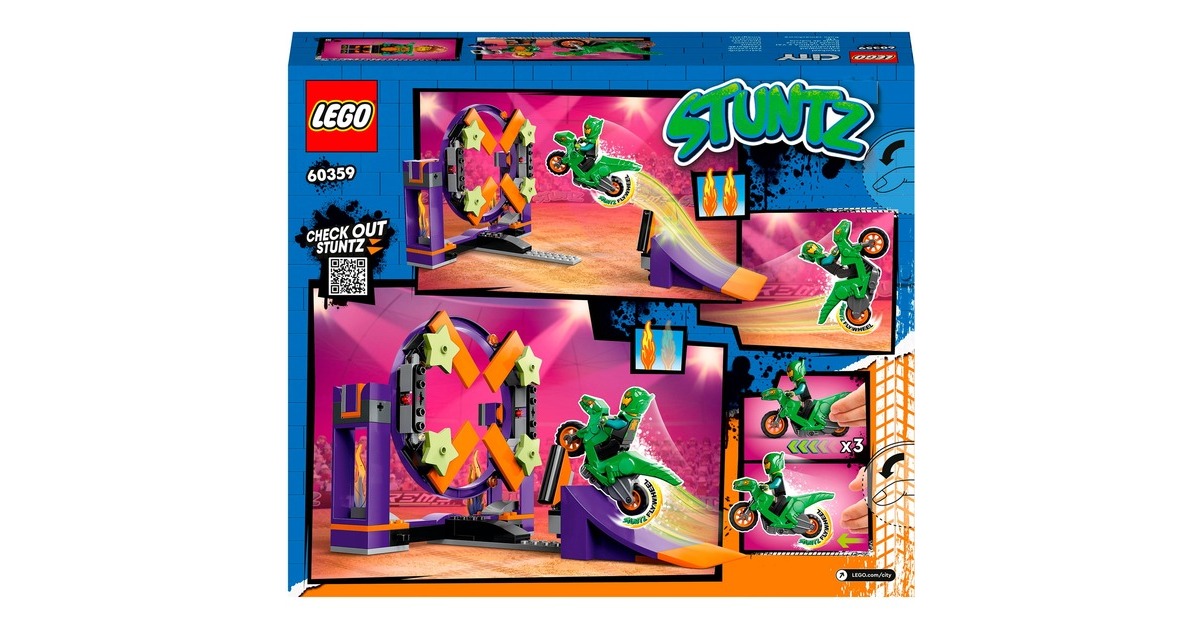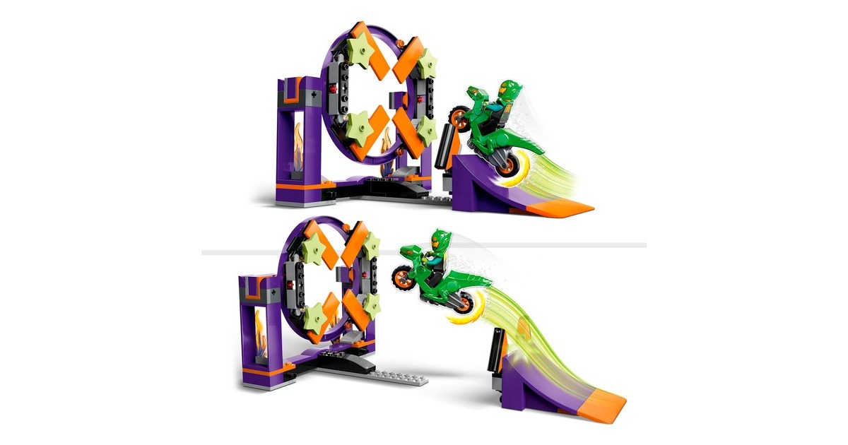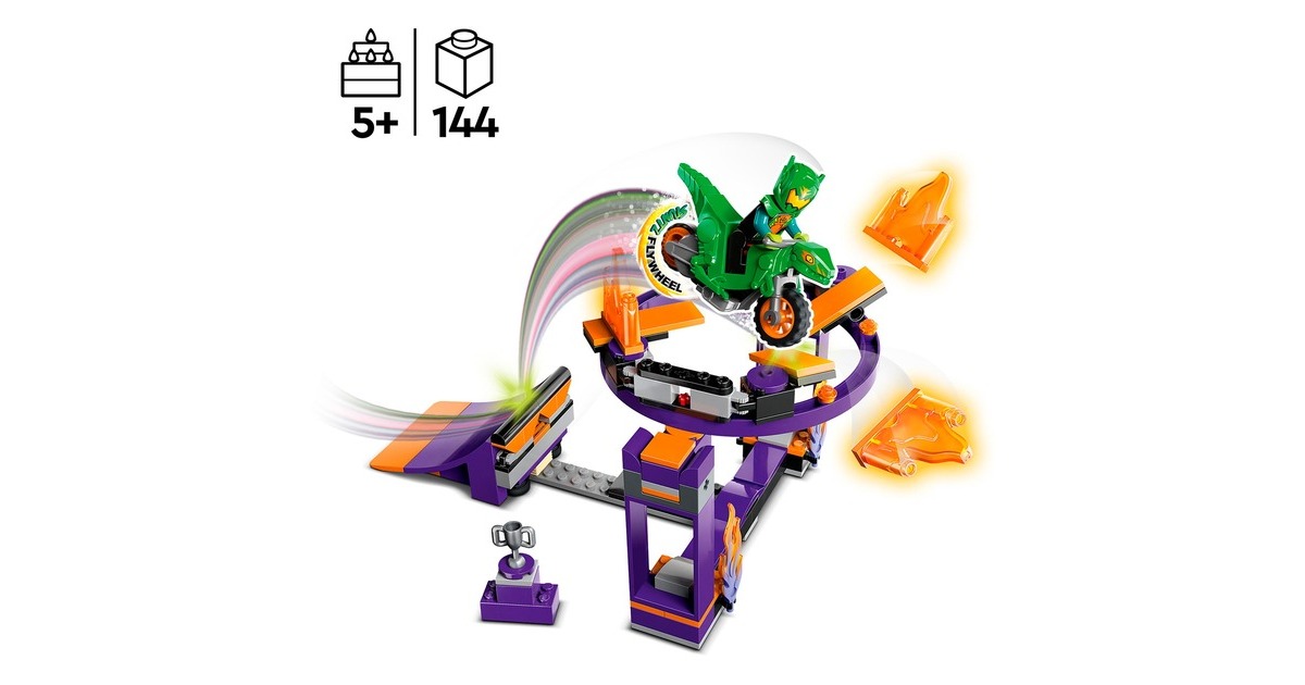 Die Sturzflug-Challenge aus der Serie LEGO City ist nichts für schwache Nerven: Der Sprungreifen kann in eine senkrechte oder waagerechte Position gebracht werden - danach wird das Schwungrad des Stuntbikes aktiviert und Fahrer und Bike springen über die Rampe. Mit dabei ist eine Fahrer-Minifigur im zum Motorrad passenden Outfit.Art.-Nr.: 1870416