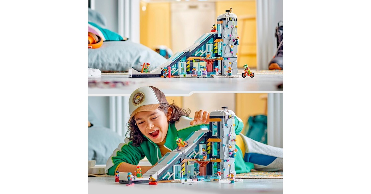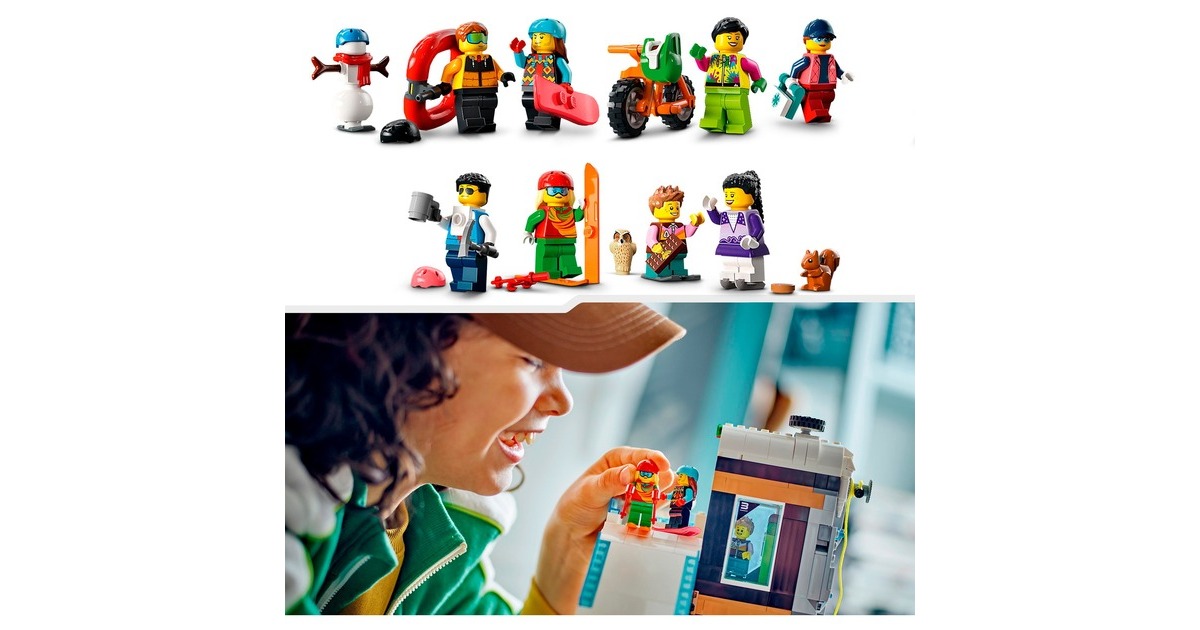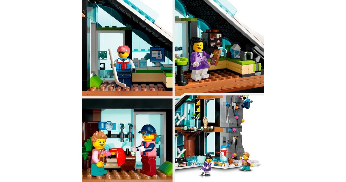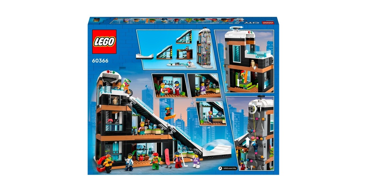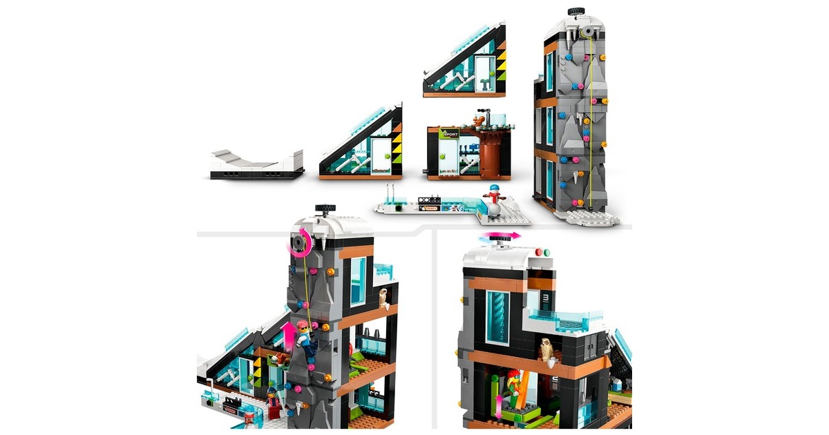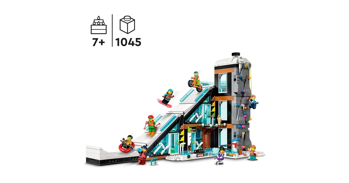 Mit diesem Wintersportpark kommen Wintersportabenteuer das ganze Jahr über nach LEGO City. Ein Aufzug führt auf das Dach des Gebäudes, von wo aus auf Skiern oder dem Snowboard den Hang hinabgefahren werden kann. Danach einfach den Klettergurt anlegen und die Kletterwand ausprobieren. Im Ski-Shop gibt es neue Ausrüstung, im Cafe' warme Getränke. Draußen gibt es eine Eisbahn, auf der auch Eishockey gespielt werden oder ein Schneemann gebaut werden kann. Mit dabei sind 8 Minifiguren mit Ausrüstung, eine Eule und ein baubarer Schneemann. Art.-Nr.: 1906178