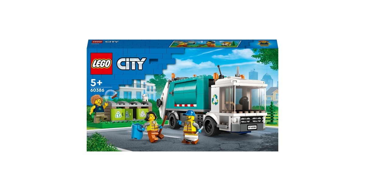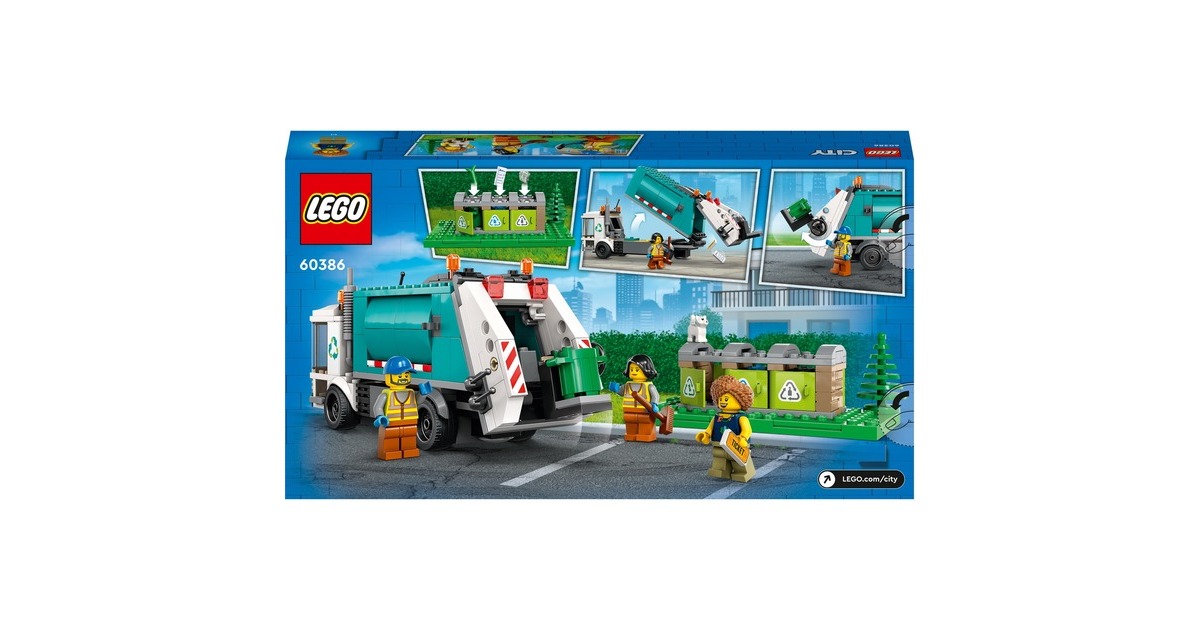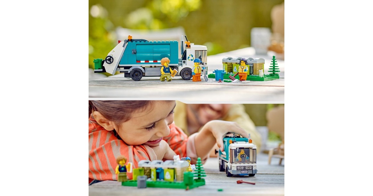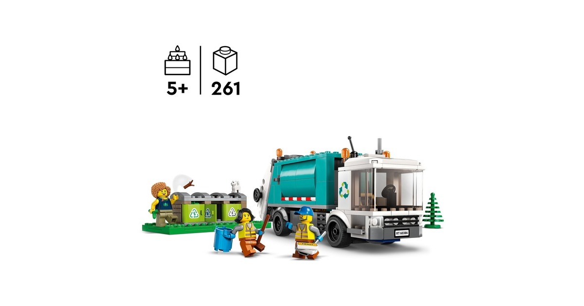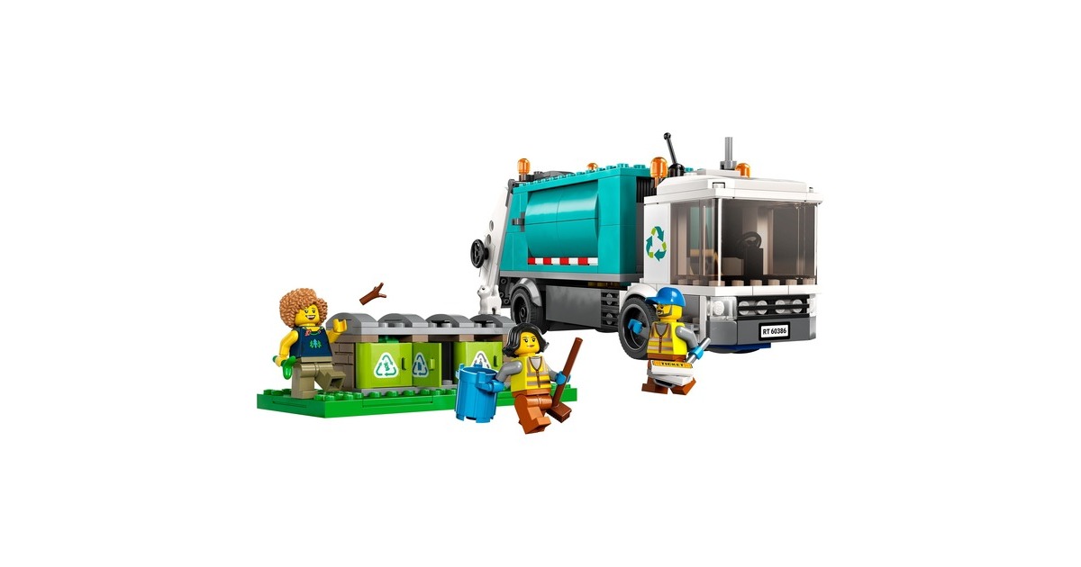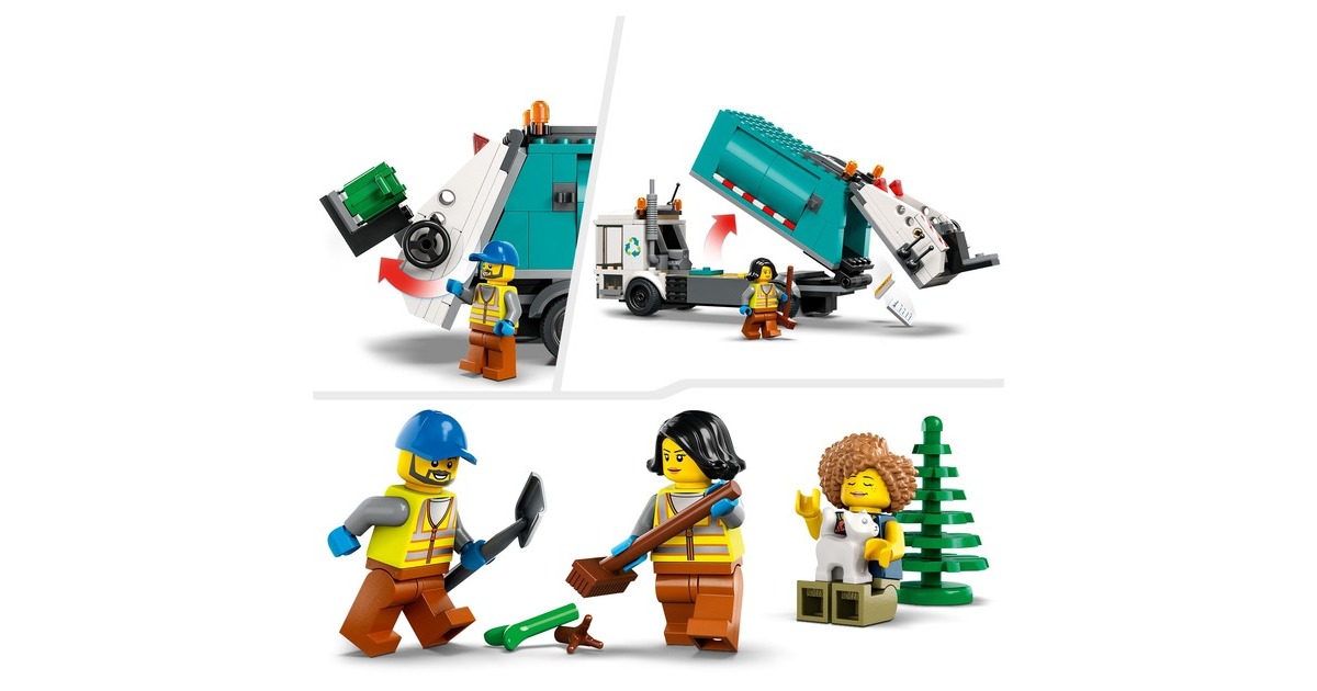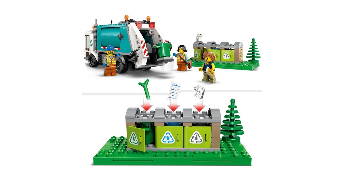 Mit dem LEGO-Set "Müllabfuhr" aus der Serie City macht Recycling so richtig Spaß: Der Recycling-Truck verfügt über eine Kippplattform zum Entleeren der Container und eine kippbare Plattform zum Abladen. Beim Sortieren des Mülls aus den drei Mülltonnen, beim Abtransportieren und Abladen helfen drei Minifiguren und eine Katzenfigur. Art.-Nr.: 1870263