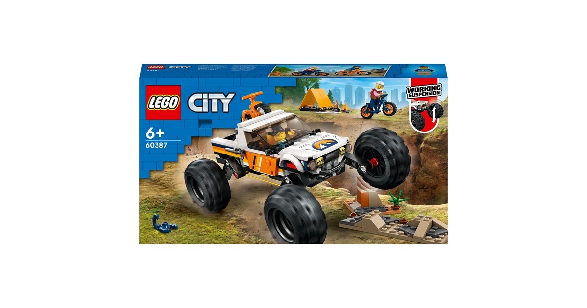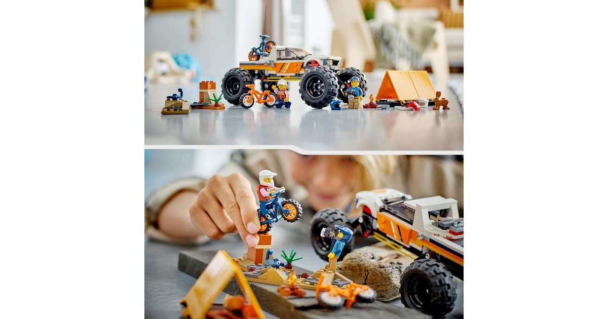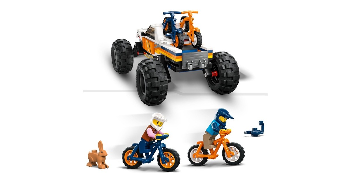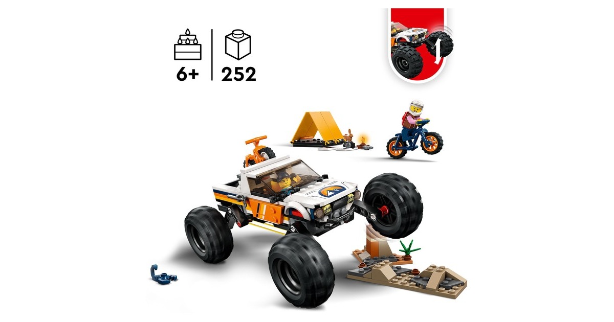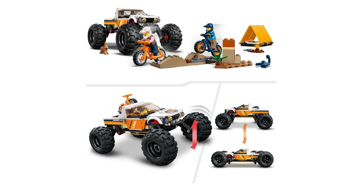 Der 4x4-Geländewagen aus dem LEGO-Set "Offroad Abenteuer" ist ein tolles Fahrzeug für spannende Gelände-Abenteuer in der Welt von LEGO City. Er hat riesige Reifen und eine hohe, belastbare Federung. Zwei Minifiguren und eine Tierfigur brechen zu einem aufregenden Ausflug mit Lagerfeuer, Zelt und Mountainbikes auf. Abends verkriechen sie sich in ihren gemütlichen Schlafsack, bevor es am nächsten Tag mit der Kamera zur Wildtierbeobachtung geht. Art.-Nr.: 1870264