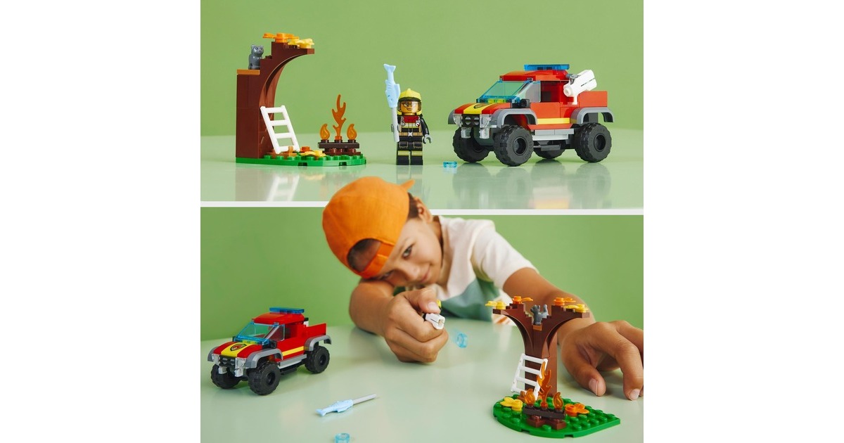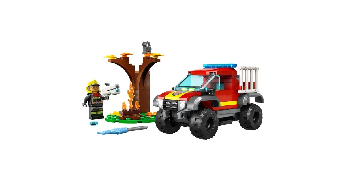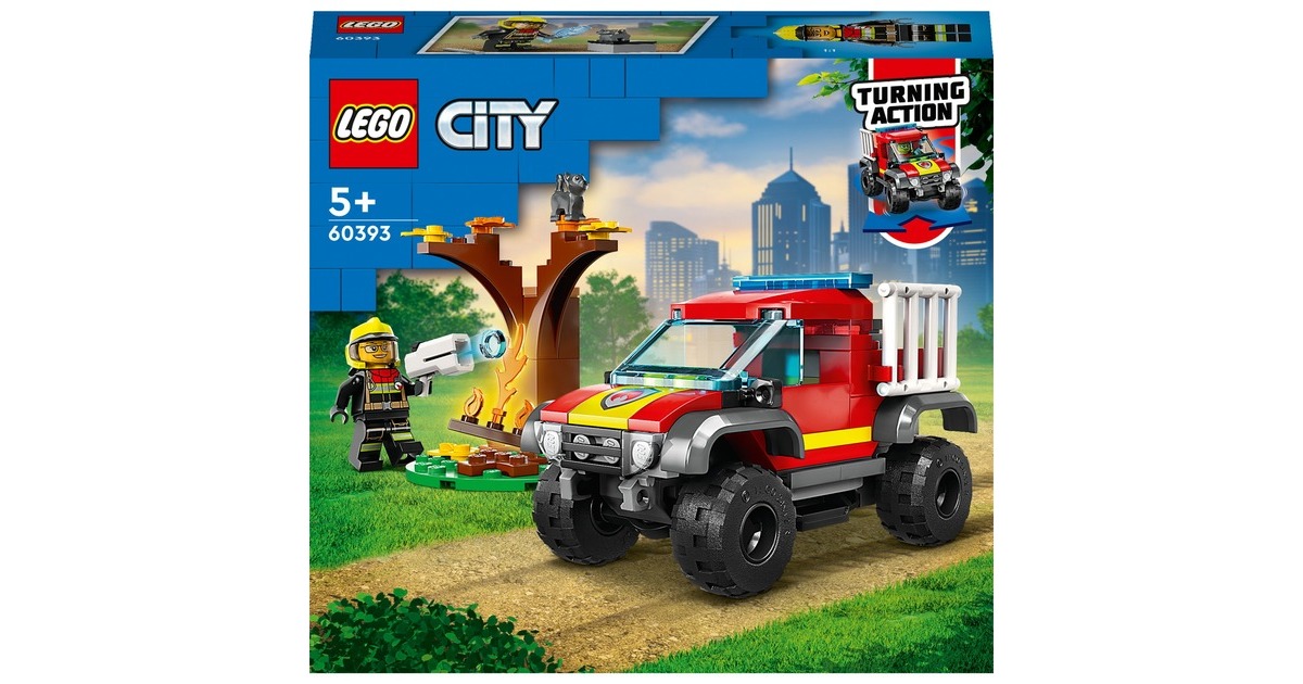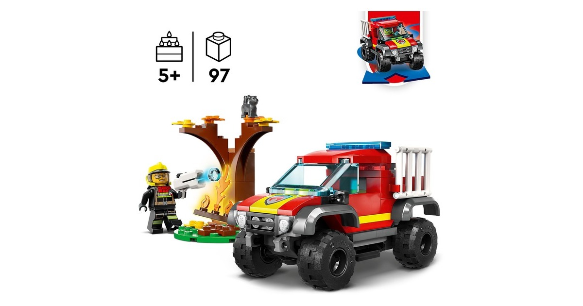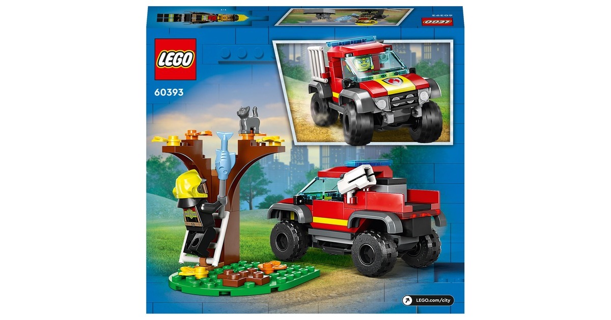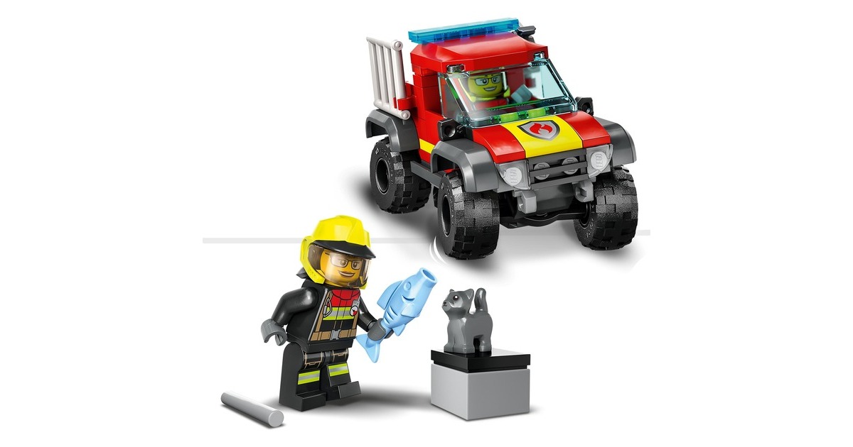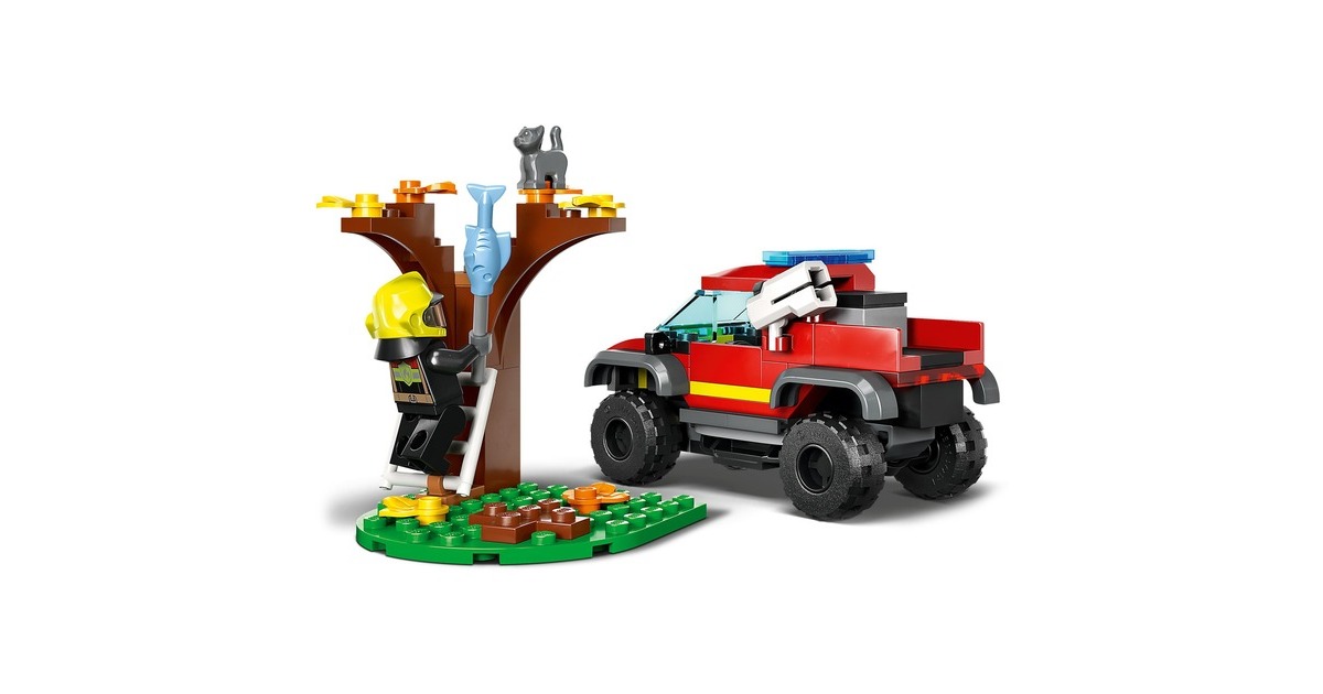 Der Feuerwehr-Pickup aus der LEGO-Serie City verfügt über grobstollige Reifen, ein zu öffnendes Cockpit und einen abnehmbaren Wasserelement-Werfer. Dieses Set enthält außerdem ein Lagerfeuer mit Flammen, einen Baum sowie eine Feuerwehr-Einsatzkraft-Minifigur mit Helm und eine Katzenfigur. Mit dabei sind außerdem ein Handfeuerlöscher und eine Leiter, mit der die Katze aus dem Baum gerettet werden kann. Sobald ihre Rettung abgeschlossen ist, kann sie mit einem Bissen Fisch verwöhnt werden.Art.-Nr.: 1870252