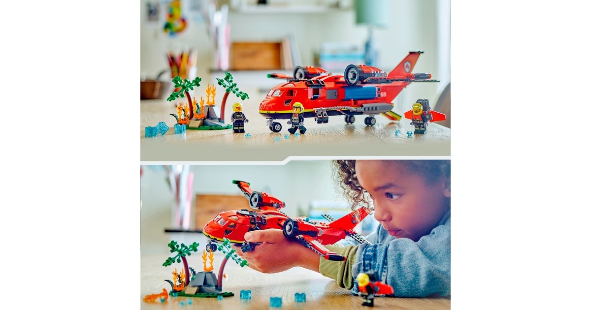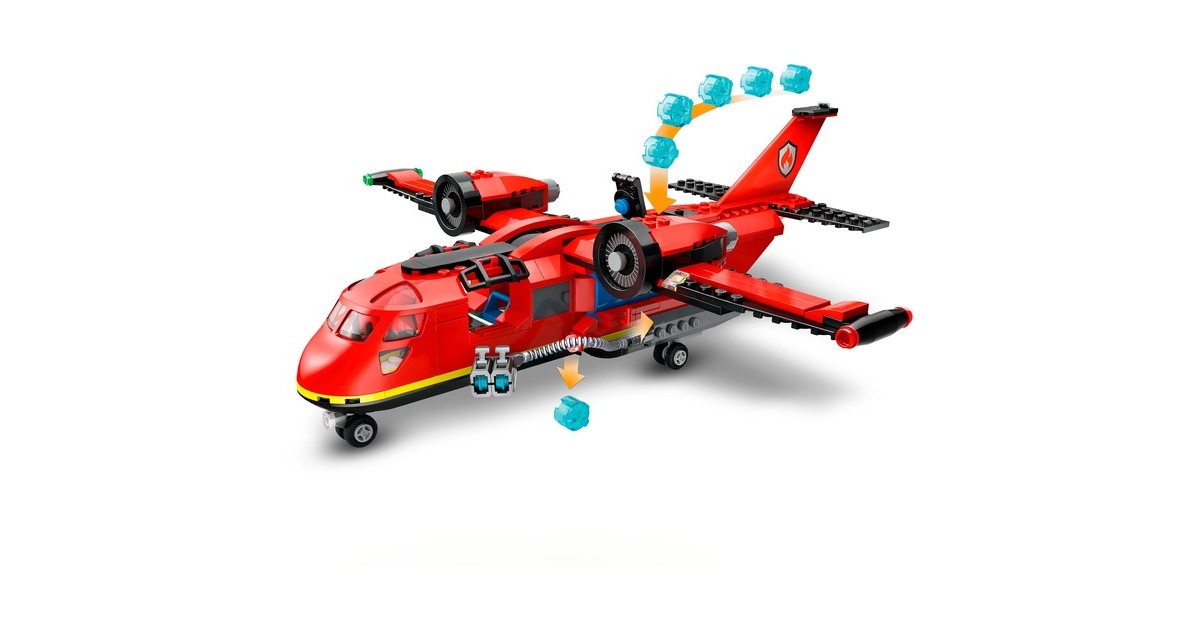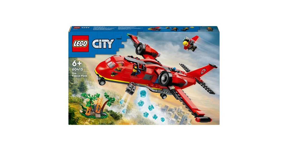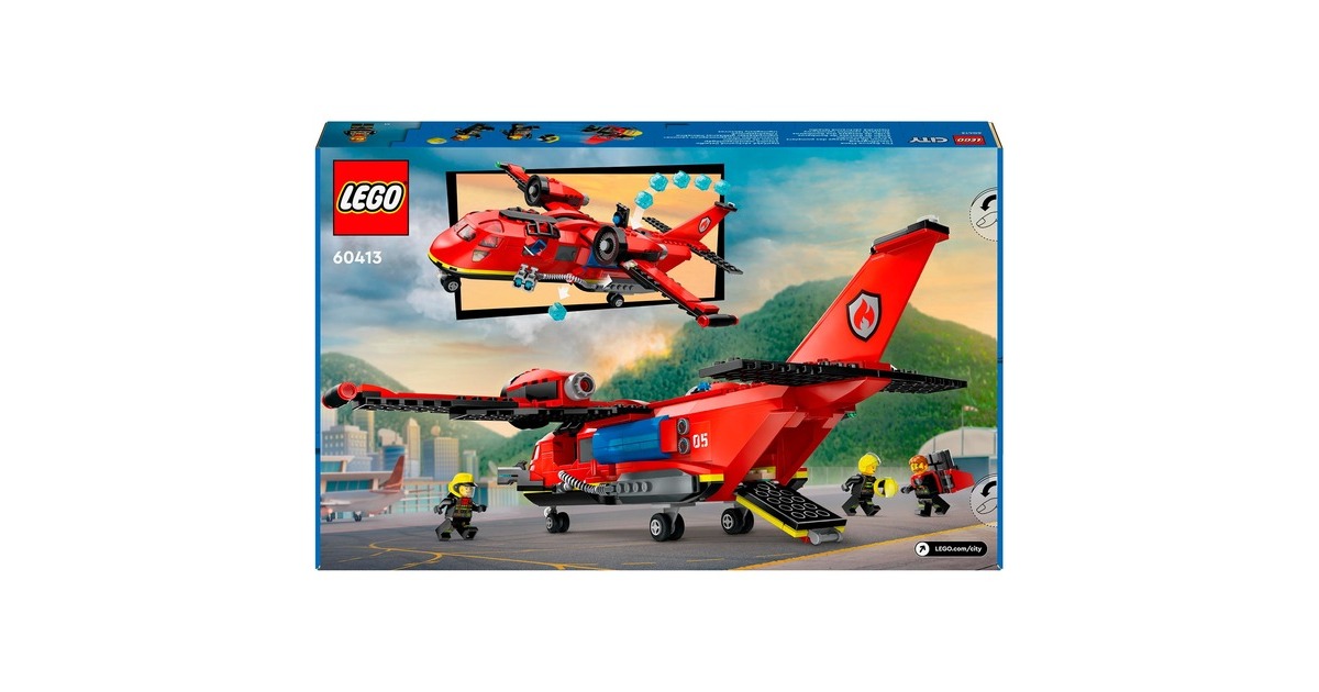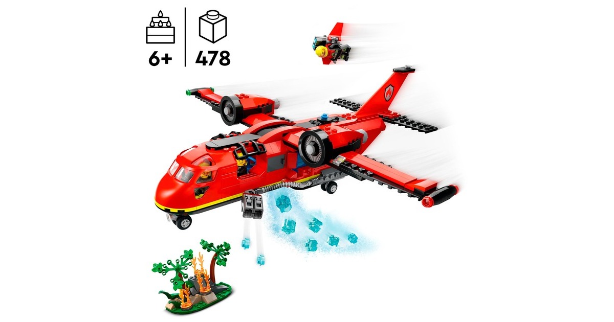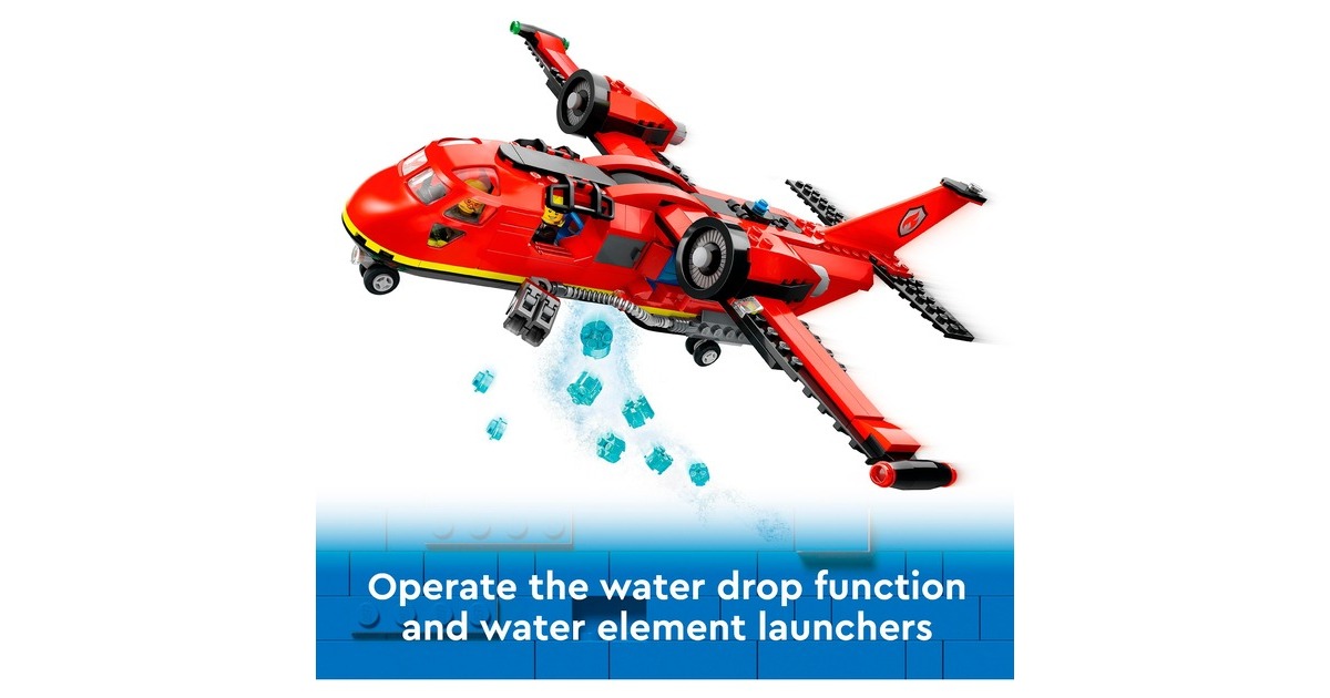 Mit diesem imposanten Spielzeug-Löschflugzeug ist jeder Brand in LEGO City schnell unter Kontrolle. Aus 478 Teilen entsteht ein etwa 33 Zentimeter langes Flugzeug mit vielen tollen Funktionen: Es hat eine aufklappbare Heckladetür, ein zweisitziges Cockpit, eine Löschkanone und einen Feuerwehrmann mit Raketenrucksack an Bord. Die Waldbrandkulisse lädt zum realitätsnahen Spielen ein - das zweimotorige Flugzeug kann LEGO-Wasserelemente über dem Brand abwerfen. Neben dem Feuerwehrmann mit Raketenrucksack sind ein Pilot und ein weiterer Feuerwehrmann zum Bedienen der Löschkanone enthalten.Art.-Nr.: 100012291