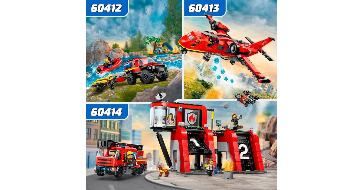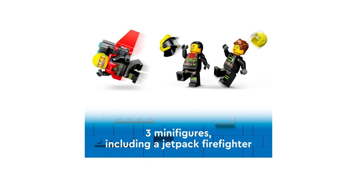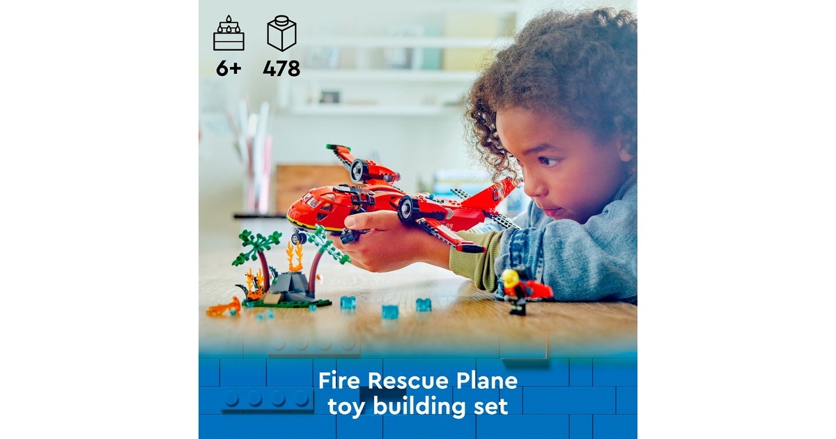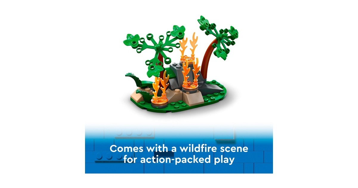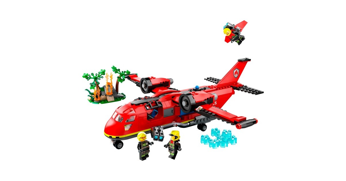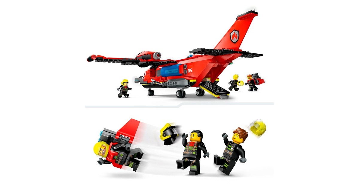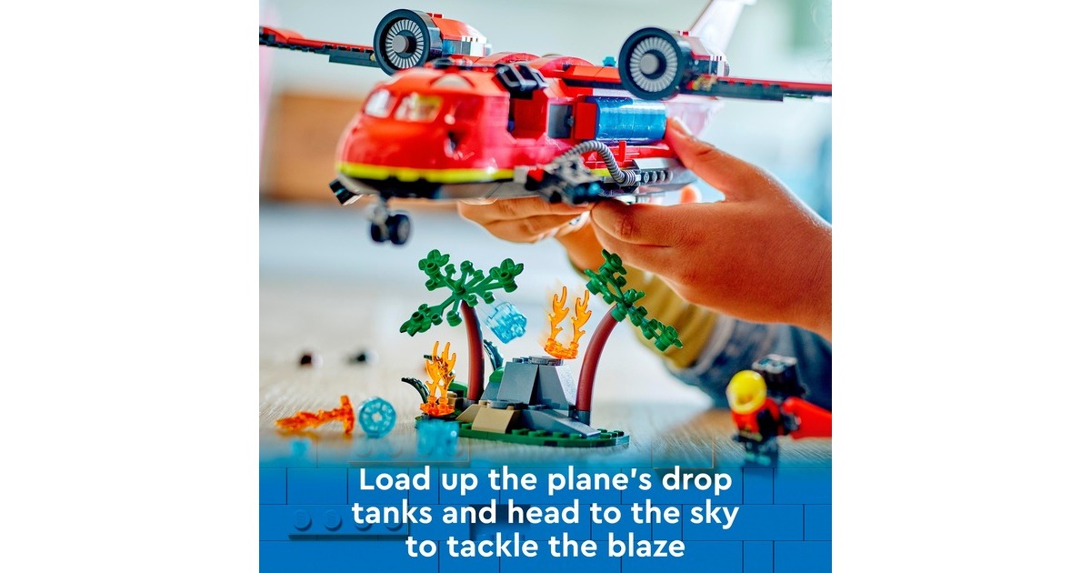 Mit diesem imposanten Spielzeug-Löschflugzeug ist jeder Brand in LEGO City schnell unter Kontrolle. Aus 478 Teilen entsteht ein etwa 33 Zentimeter langes Flugzeug mit vielen tollen Funktionen: Es hat eine aufklappbare Heckladetür, ein zweisitziges Cockpit, eine Löschkanone und einen Feuerwehrmann mit Raketenrucksack an Bord. Die Waldbrandkulisse lädt zum realitätsnahen Spielen ein - das zweimotorige Flugzeug kann LEGO-Wasserelemente über dem Brand abwerfen. Neben dem Feuerwehrmann mit Raketenrucksack sind ein Pilot und ein weiterer Feuerwehrmann zum Bedienen der Löschkanone enthalten.Art.-Nr.: 100012291