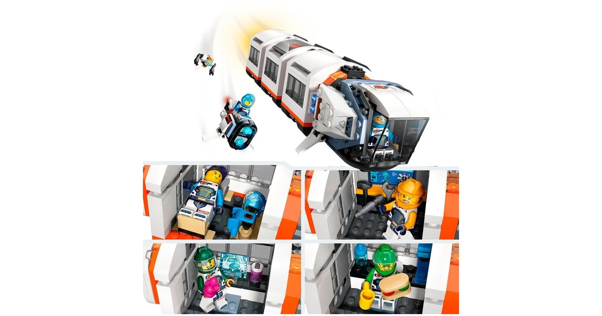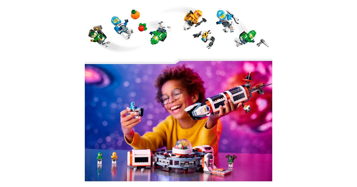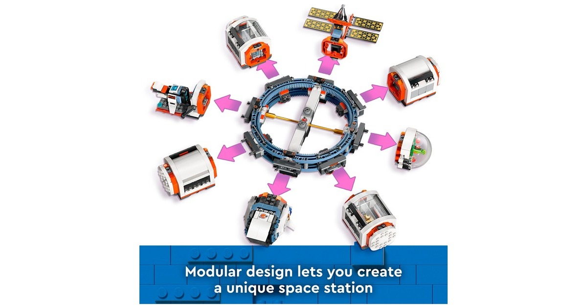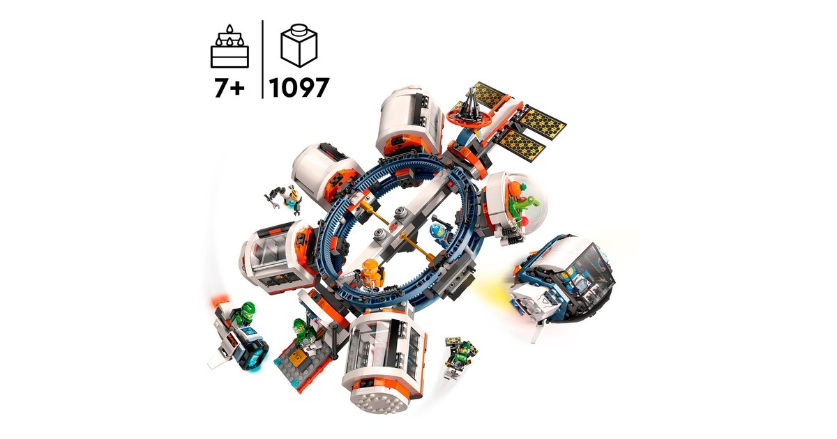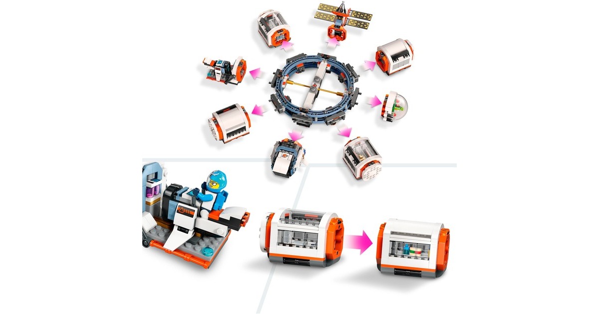 Mit dieser tollen Raumstation erweitert sich die Welt von LEGO City in den Weltraum. Die runde Raumstation ist voll aufgebaut 40 Zentimeter breit und verfügt über 5 Module: Ein Labor, eine Werkstatt, eine Küche, ein Schlafquartier und eine Biokuppel. Die Module können untereinander ausgetauscht und ganz nach Belieben angeordnet werden. Darüber hinaus sind ein Weltraummotorrad, ein Shuttle und ein Satellit in diesem umfangreichen Set mit 1097 LEGO-Teilen enthalten. Die Raumkapselmodule und die Raumfahrzeuge aus diesem Set verfügen über ein Luftschleusensystem, mit dem sie auch an andere kompatible, separat erhältliche LEGO-Weltraummodelle andocken können. 6 Astronauten-Minifiguren bewohnen die Raumstation.Art.-Nr.: 100012357