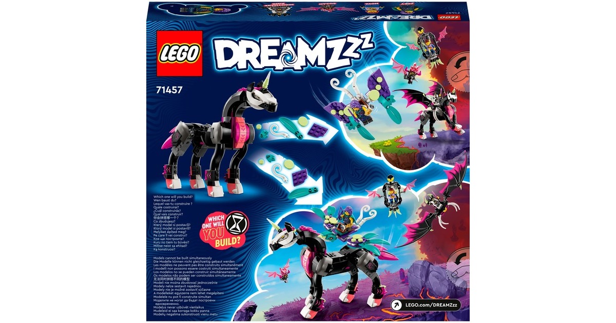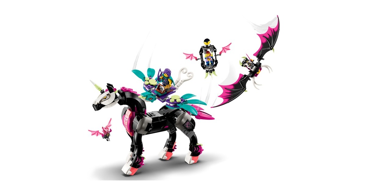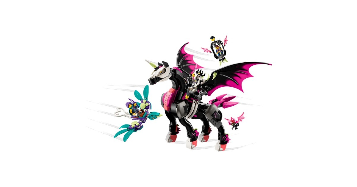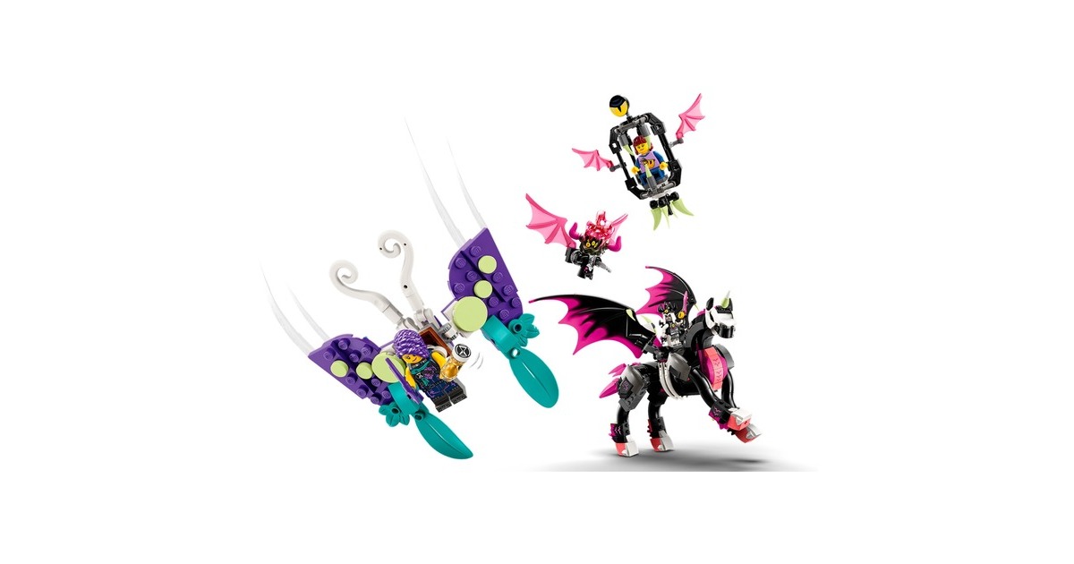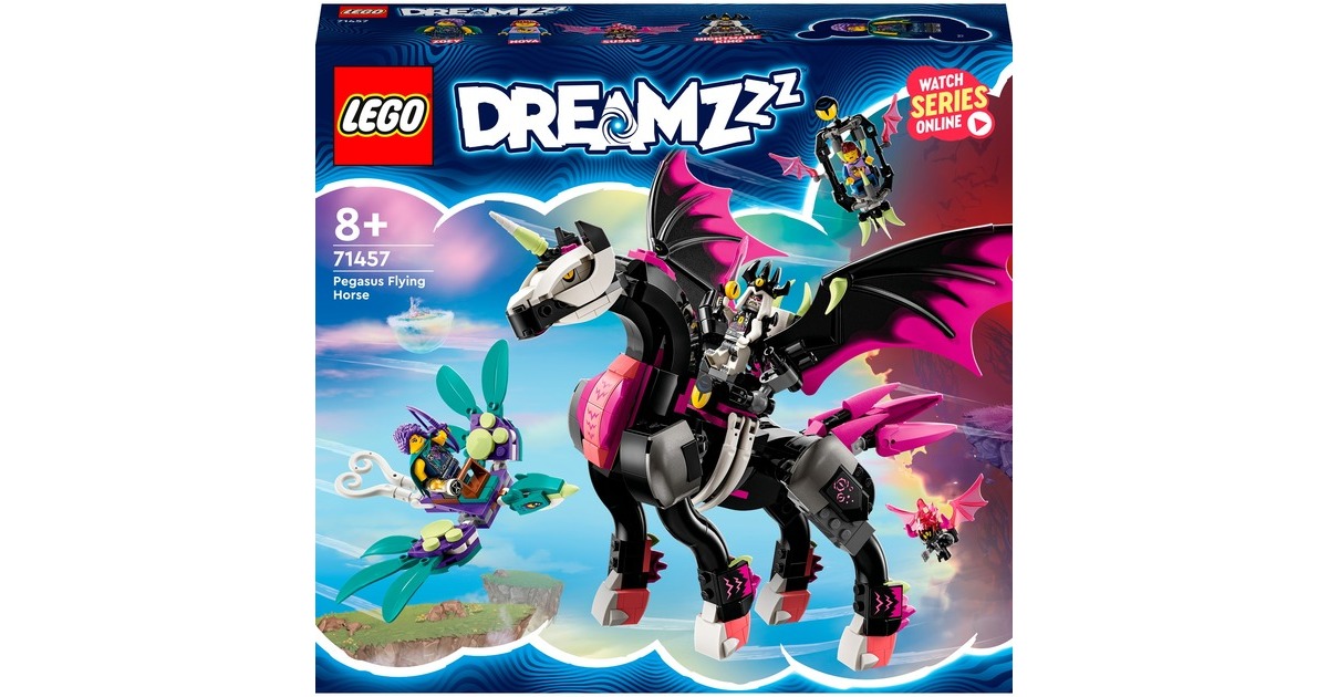 Auf dem Pegasus in die Traumwelt von LEGO DREAMZzz reiten: Nova wurde von dem Albgnom Susan entführt. Doch Zoey ist den beiden schon auf ihrem Pegasus auf den Fersen, um ihre Freundin Nova zu retten! Der Spielzeug-Pegasus kann seinen Kopf, seine Hüfte, seine Hufe und seinen Schwanz bewegen. Sowohl der Thron des Albtraumkönigs als auch Zoeys Vogel können auf dem Rücken das Fabelwesens befestigt werden. Es gibt zwei Baumöglichkeiten: Es kann entweder ein Vogel gebaut werden, der Zoey begleitet oder Zoey kann direkt mit Flügeln ausgestattet werden. Mit dabei sind 3 Minifiguren: Zoey, Nova und der Albtraumkönig sowie die Figur Susan. Art.-Nr.: 1907494