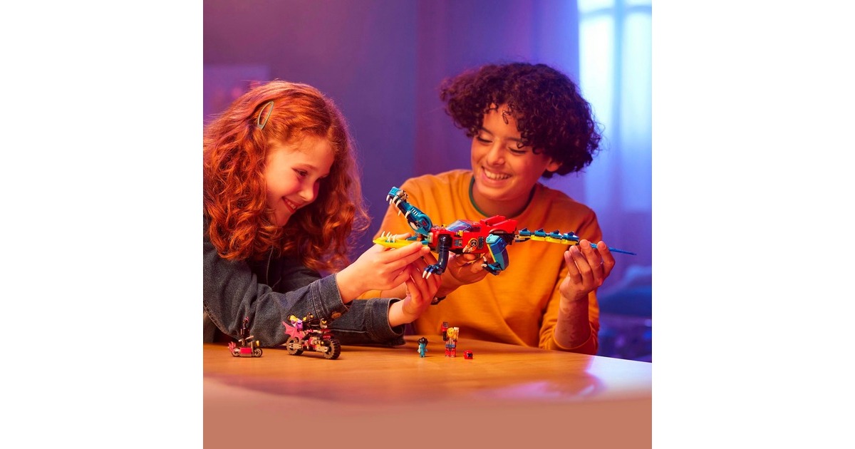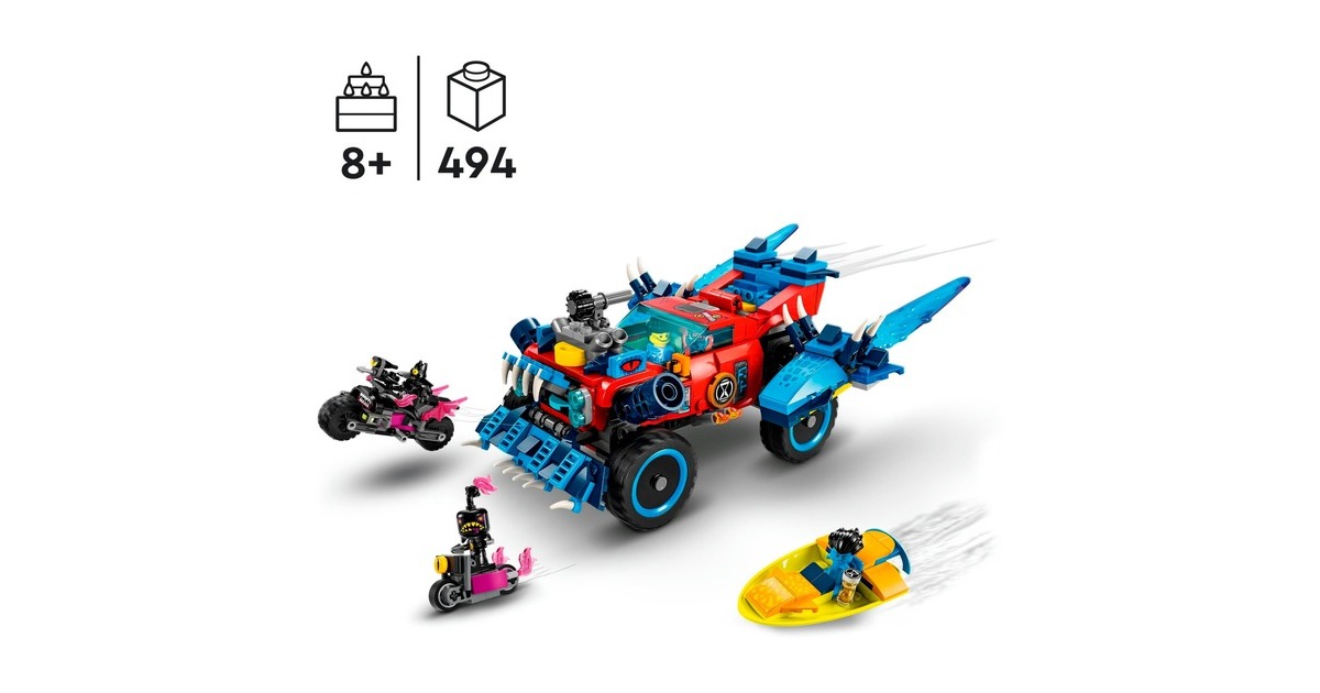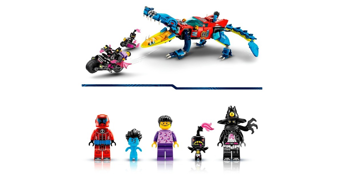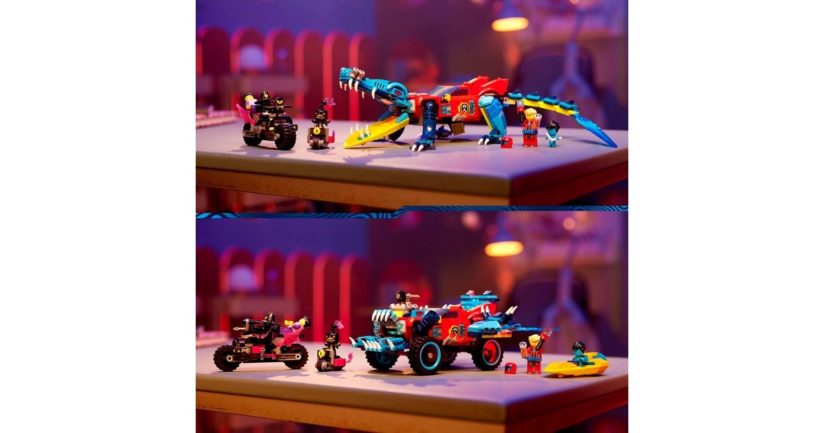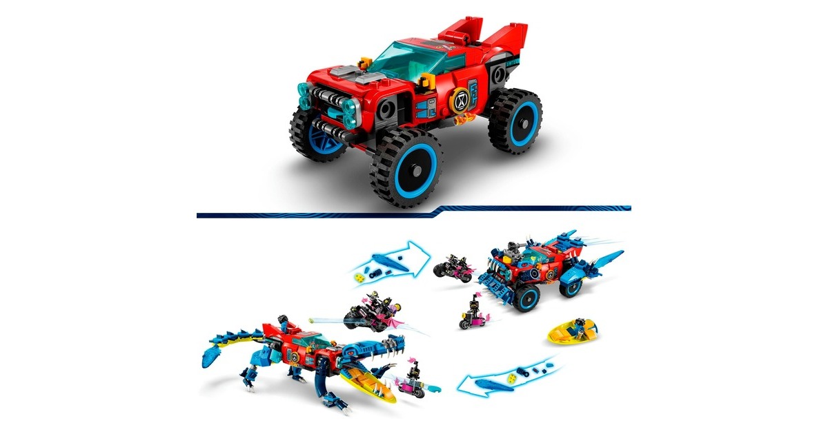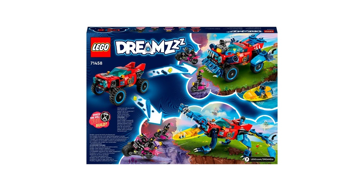 Los geht's - mit Höchstgeschwindigkeit in die Traumwelt von LEGO DREAMZzz! Basierend auf der TV-Serie entsteht mit diesem Set ein fantastisches Auto, mit dem Jayden aus den Fängen des gruseligen Nachtjägers befreit werden kann. Es gibt zwei Baumöglichkeiten: Entweder das Krokodilauto, das Albträume verscheuchen kann - oder der superschnelle Geländewagen, der die Albträume einholt. In der Krokodilversion verfügt das Auto über bewegliche Arme und Beine sowie über ein im Kühlergrill verstecktes Katapult, um Scheiben aus dem Krokodilmaul zu schleudern. Als Geländewagen hat das Fahrzeug rollende Räder und ein abnehmbares Dach, um eine Minifigur hineinsetzen zu können. 3 Minifiguren sind enthalten: Cooper, Jayden und der Nachtjäger.Art.-Nr.: 1907496