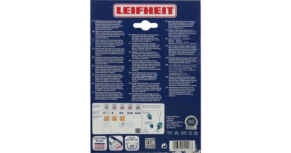 Der Leifheit Wischbezug Profi XL cotton plus 55117 ist aus hochwertigen Supra- und Baumwollfasern gefertigt, die Schmutz porentief aus dem Boden lösen, diesen aufnehmen und das Wasser optimal speichern. So sorgt er für Glanz auf Steinböden und Fliesen. Er ist außerdem ein Rundumwischbezug, wodurch er Ecken und Kanten gleich mit reinigt. Der Wischbezug Profi XL cotton plus kann bei 60°C in der Waschmaschine gereinigt werden und besteht zu 60% aus Polyester und zu 40% aus Baumwolle. Er passt für den Bodenwischer Profi XL.Art.-Nr.: 1822433