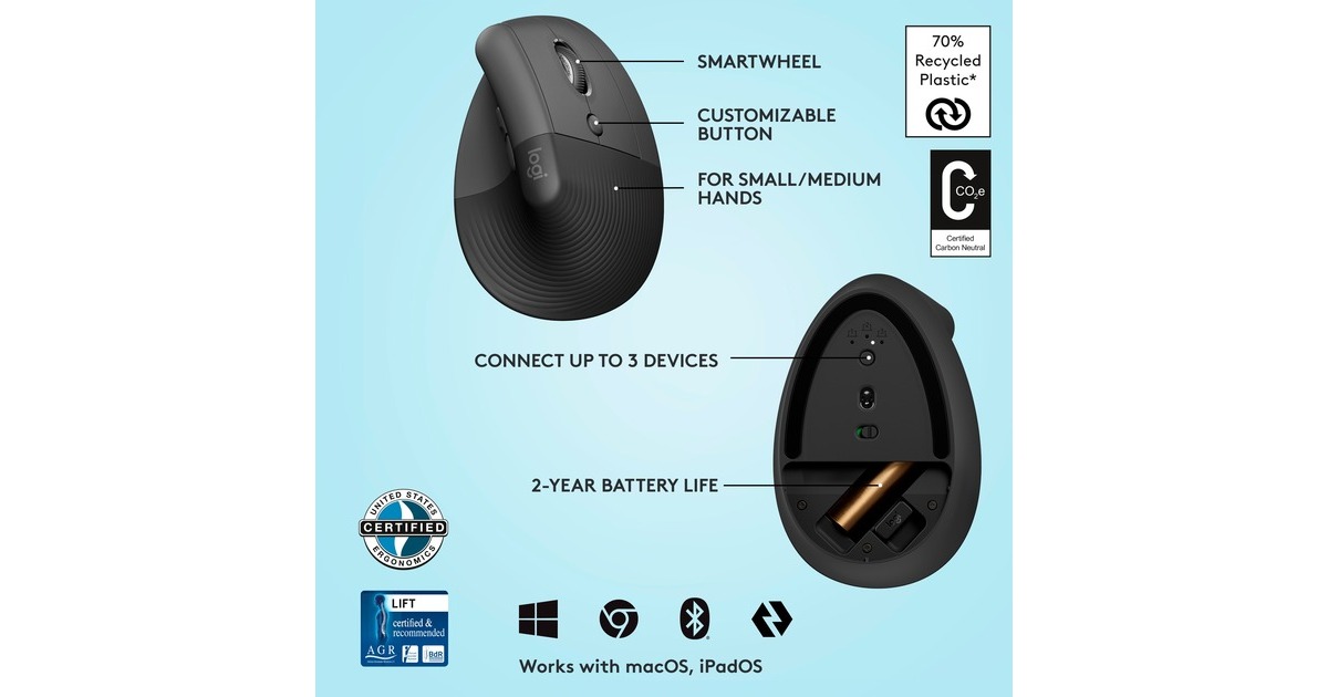 Die Logitech Lift ist eine ergonomische vertikale Maus, die perfekt für kleine bis mittelgroße Hände geeignet ist und Komfort vom frühen Morgen bis spät in die Nacht bietet. Weiche gummierte Griffflächen und eine bequeme Daumenauflage machen das Arbeiten gleich viel bequemer. Mit der Lift nimmt man eine lockere und natürliche Handhaltung von 57° ein, was für eine entspanntere Haltung des Oberkörpers sorgt. Mit vier leicht zu erreichenden, anpassbaren Tasten sowie einem SmartWheel lässt sich die Lift auf den persönlichen Arbeitsstil optimal abstimmen, für eine bessere Produktivität. Der Logi Bolt USB-Empfänger ist dabei ideal für beengte Arbeitsplätze oder zusätzliche Sicherheit; alternativ lässt sich die vertikale Maus auch via Bluetooth Low Energy-Technologie verbinden.Art.-Nr.: 1835275
