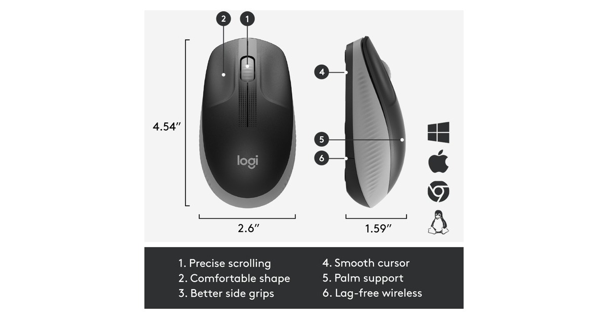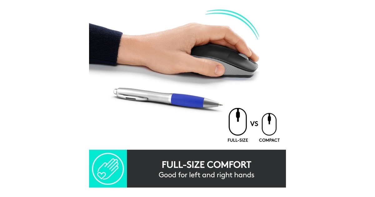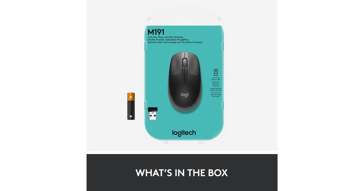 Die Logitech M190 ist eine kabellose Maus in Standardgröße mit einem komfortablen, geschwungen geformten Design, das der natürlichen Wölbung mittelgroßer bis großer Hände folgt und sowohl für Links- als auch Rechtshänder geeignet ist. Spezielle konkave Tasten führen die Finger in die ideale Position und die zusätzliche Handballenunterstützung sorgt für Komfort den ganzen Tag lang. Die M190 ermöglicht kabelloses Arbeiten und Bewegungsfreiheit mit einer Reichweite von bis zu 10 Metern und praktisch ohne Verzögerungen oder Ausfälle. Der optische Sensor sorgt für eine geschmeidige und präzise Cursor-Steuerung auf nahezu jeder Oberfläche. Ganz gleich, ob man die M190 mit einem Notebook, einem Desktop, zu Hause oder unterwegs verwendet: Auf diese Maus kann man sich verlassen.Art.-Nr.: 1676719