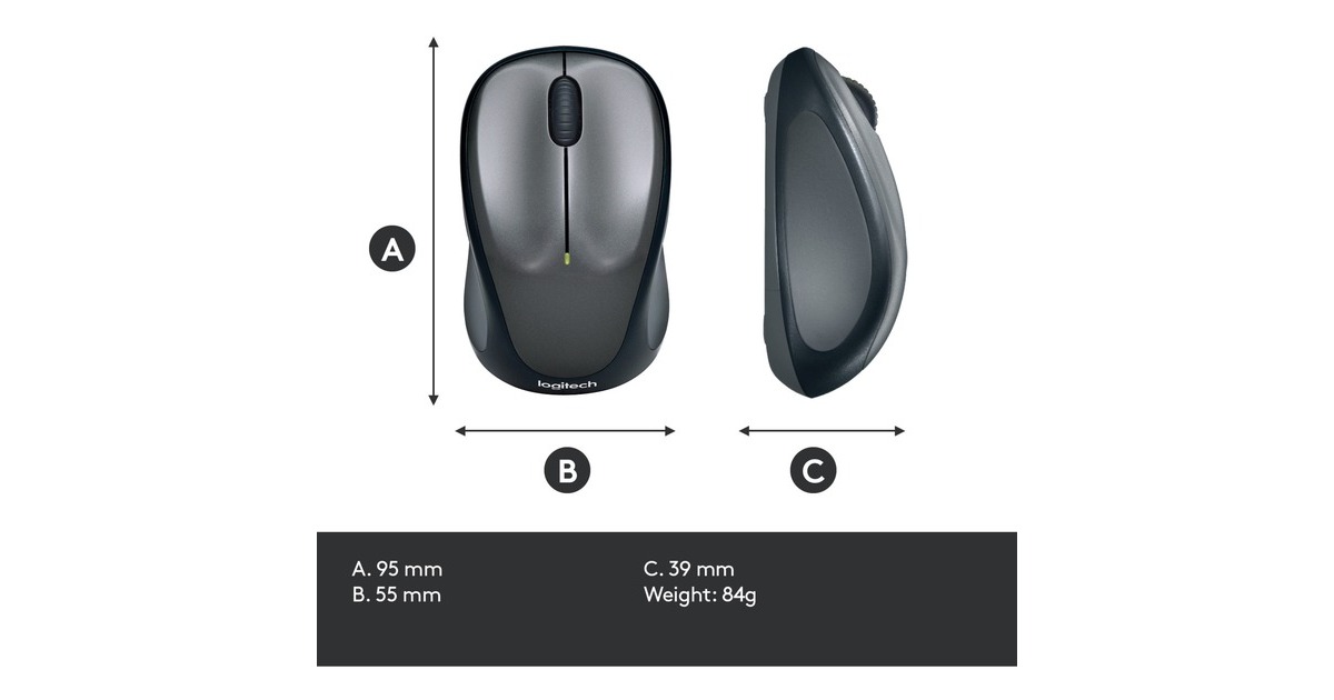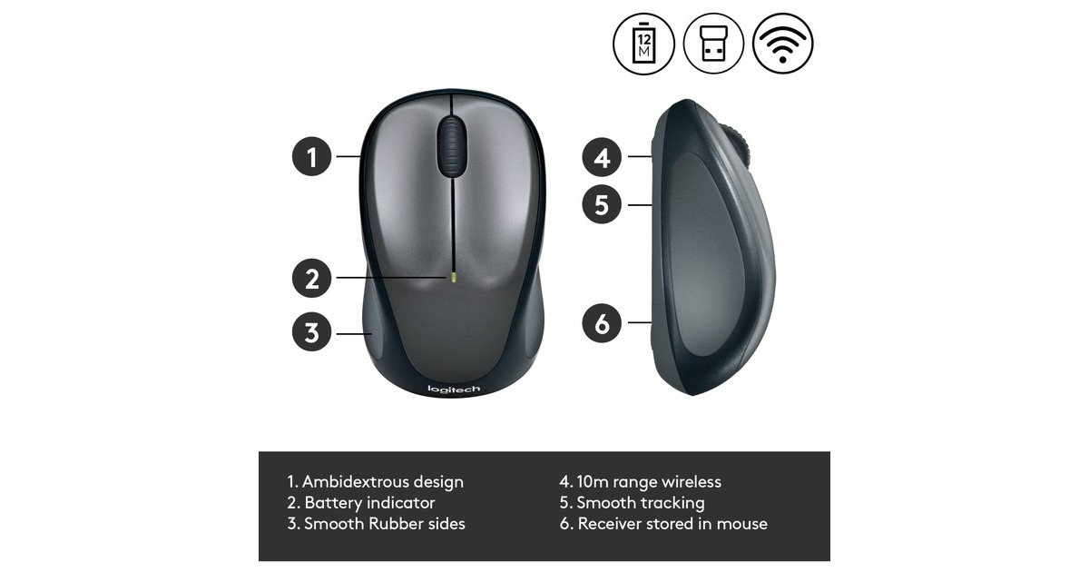 geschwungene Form; ein Jahr Batterielebensdauer; Logitech® Advanced Optical Tracking; Logitech USB-Empfänger |