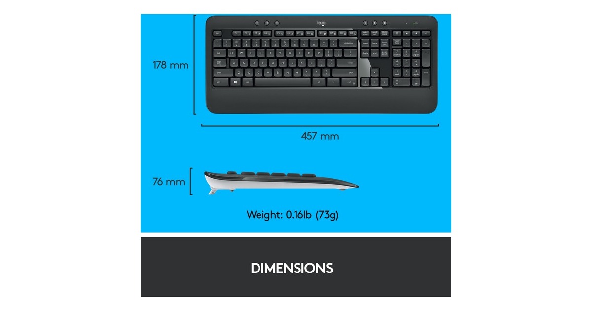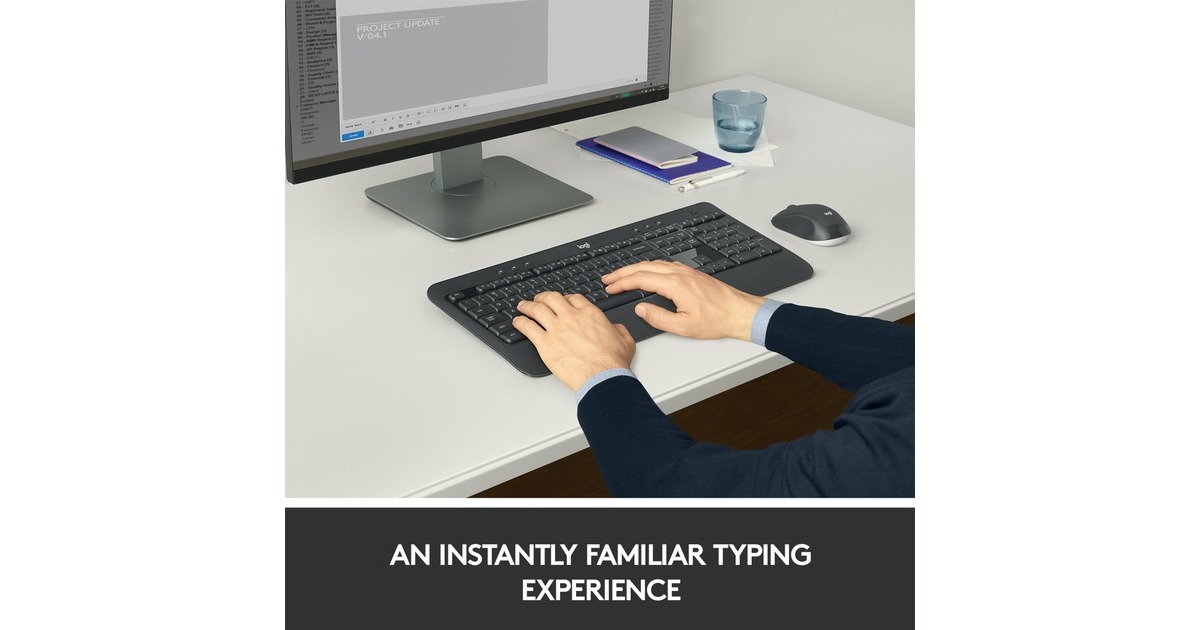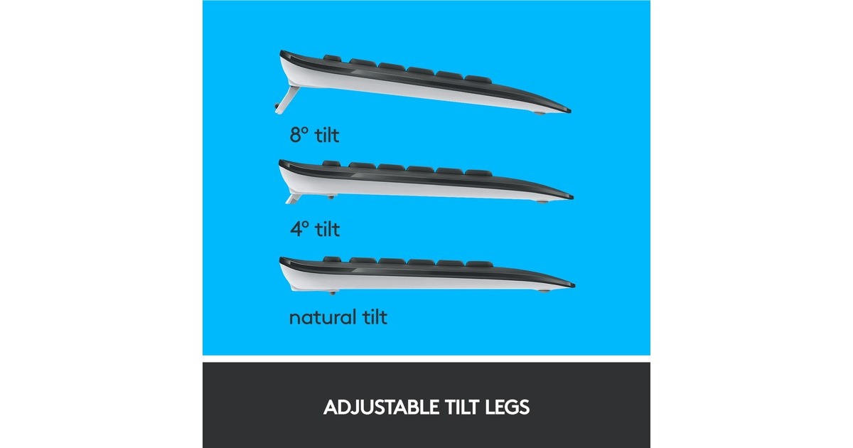 Standard-Tastenanordnung mit Funktionstasten, Ziffernblock und Pfeiltasten in Standardgröße | Tastenabstand 19 mm | Flüsterleise Tasten (weniger als 55 dB) | Personalisierter Bedienkomfort: Natürlicher Neigungswinkel, 4° Neigungswinkel und 8° Neigungswinkel | UV-beschichtete, verschleißfeste Tasten | Spritzwassergeschützt für bis zu 60 ml Flüssigkeitseinwirkung | Feststellanzeige | Handballenauflage | Maus in Standardgröße mit geschwungenem Design und weichen Gummi-Griffflächen | Aufbewahrungsfach für den Empfänger in der Maus | Logitech Unifying-USB-Empfänger – Pairing von bis zu 6 Produkten über einen winzigen Empfänger |