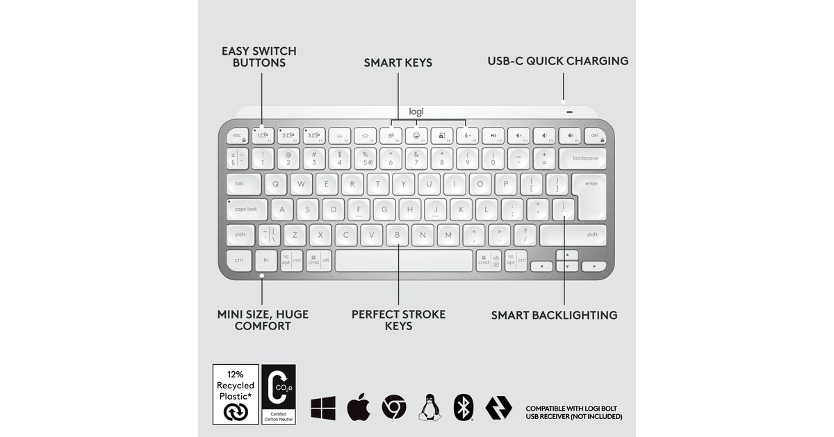 Wiederaufladbar über USB-C. Eine vollständige Akkuladung hält 10 Tage (oder bis zu 5 Monate ohne Hintergrundbeleuchtung) | Kompatibel mit Logitech Flow-fähigen Mäusen |