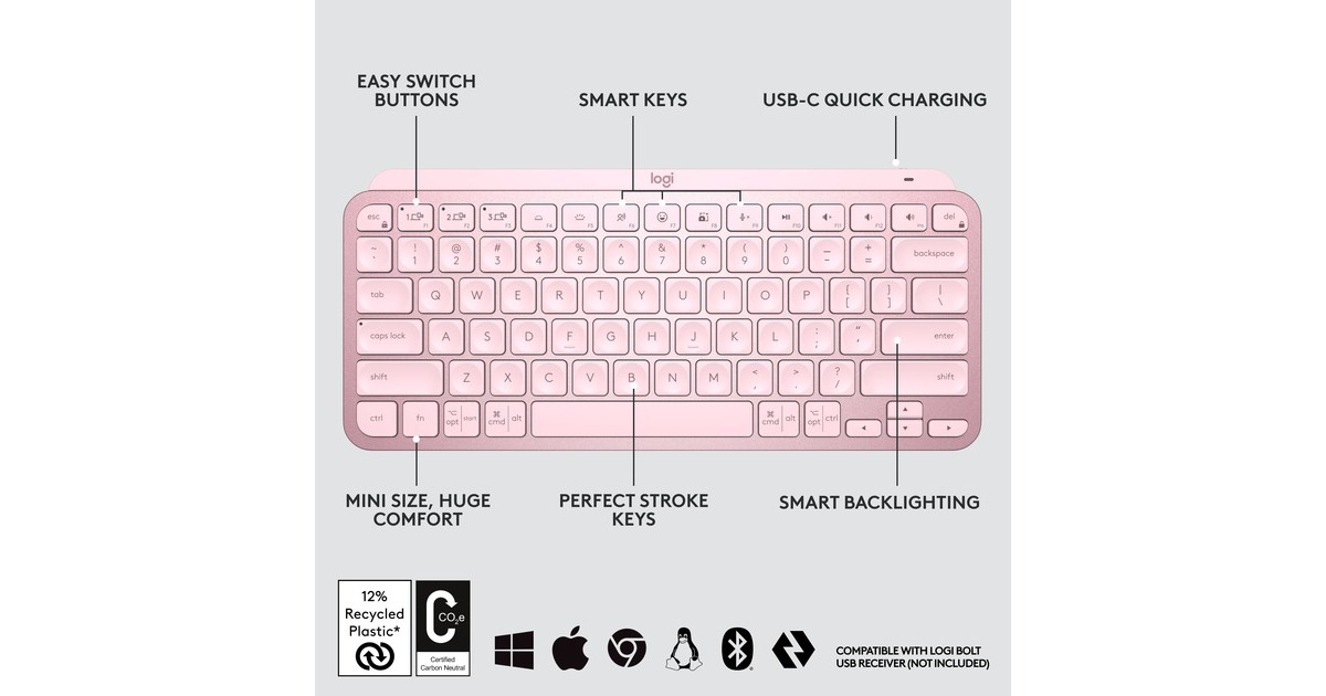 Wiederaufladbar über USB-C. Eine vollständige Akkuladung hält 10 Tage (oder bis zu 5 Monate ohne Hintergrundbeleuchtung) | Kompatibel mit Logitech Flow-fähigen Mäusen |