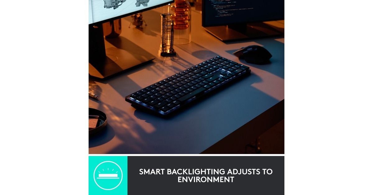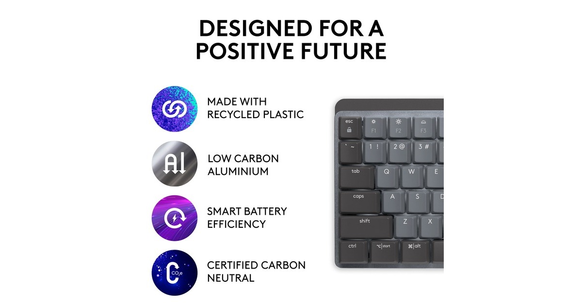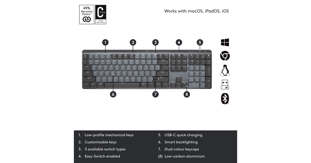 Mechanische Low-Profile-Tasten, Umgebungsbeleuchtungs-Sensoren zum automatischen Anpassen der Hintergrundbeleuchtung,Easy-Switch-Tasten zum Verbinden von bis zu 3 Geräten und einfachem Umschalten zwischen ihnen, kohlenstoffarmes Aluminium |