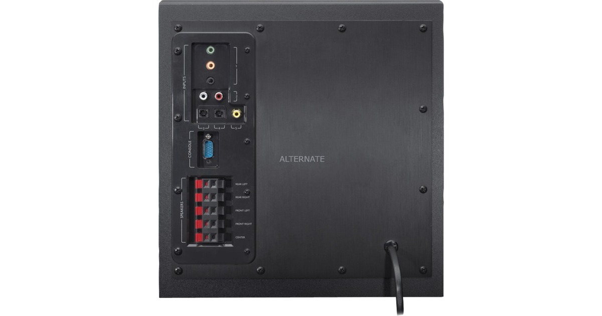 3x 3,5-mm-Klinkenbuchse, 1x Kabelklemmen (5x), 1x koaxialer Digitaleingang, 2x optischer Digitaleingang, 1x Stereo-Cinch-Eingang, 1x Stromanschluss |