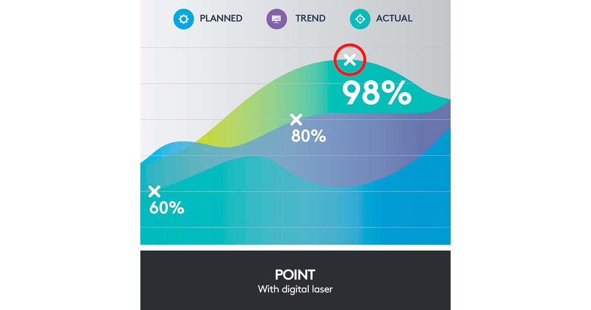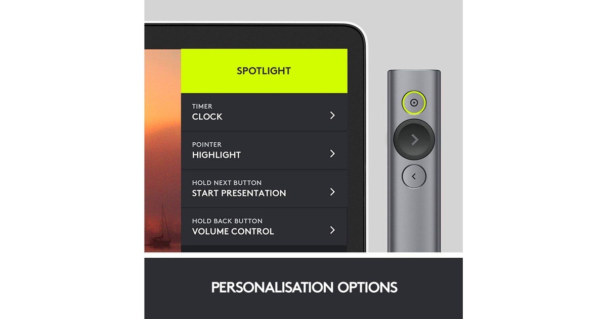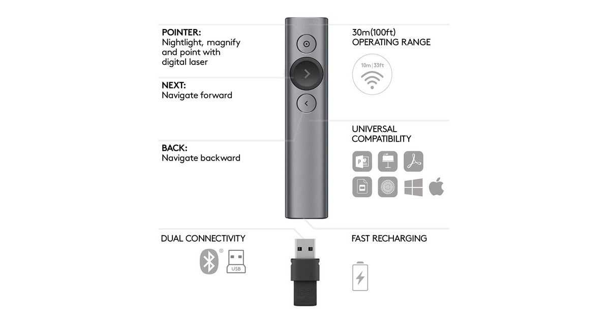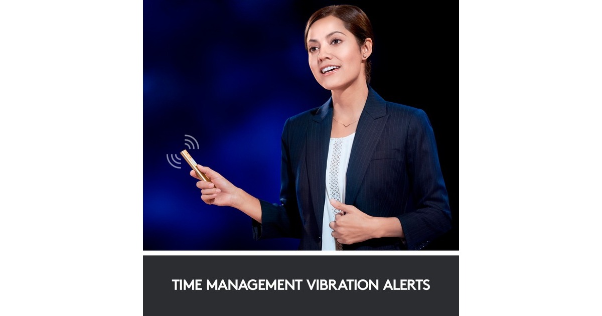 hervorheben und vergrößern auf dem Bildschirm; Videos abspielen und Links öffnen, während man eine Präsentation hält; die Zeit im Blick behalten und Vibrationsalarme festlegen; dank 30 m Reichweite kann man sich frei im Raum bewegen |