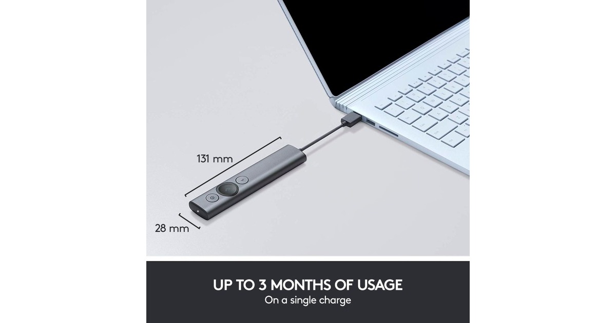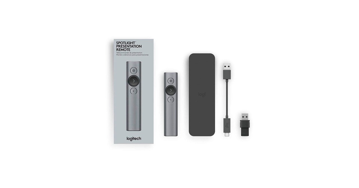 Die Spotlight von Logitech ist eine komfortable Präsentationsfernbedienung. Mit Spotlight kann man aus bis zu 30 Metern Entfernung durch Folien navigieren und mit den Inhalten auf dem Bildschirm interagieren. Der anpassbare Timer der Spotlight sendet Vibrationsalarme direkt an die Hand – und das fortschrittliche Pointer-System erlaubt es einem, wichtige Bereiche hochaufgelöst hervorzuheben oder zu vergrößern. Hinzu kommt das gestengesteuerte Scrollen, Schwenken sowie die Lautstärkeregelung. Eine Vollladung hält bis zu drei Monate und Spotlight ist mit den meisten Geräten und Plattformen mit Präsentationssoftware per Plug&Play einsetzbar.Art.-Nr.: 1473854