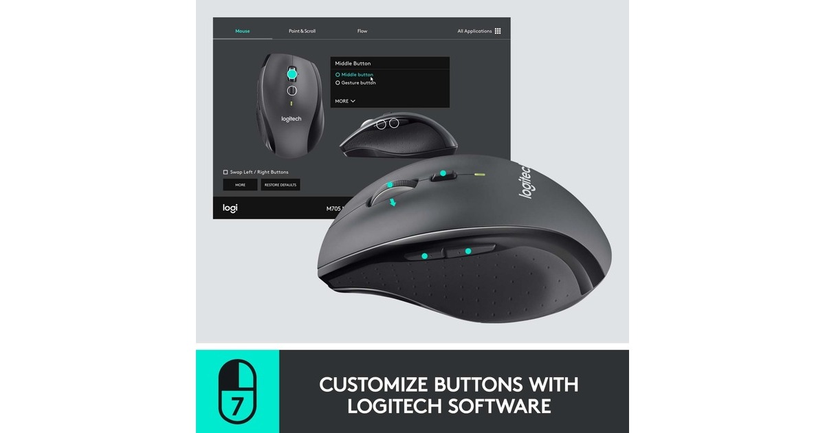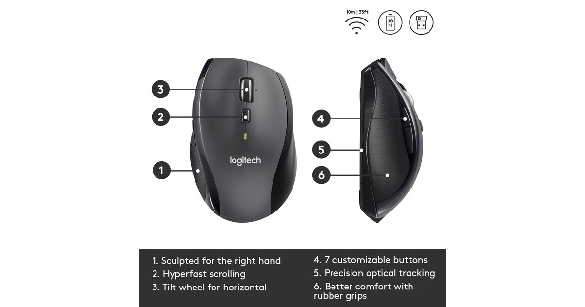 Die Logitech M705 Marathon ist eine kabellose Lasermaus mit einer Batterielebensdauer von bis zu drei Jahren und einem winzigen Empfänger, der immer im Notebook eingesteckt bleiben kann. Die Laserpräzision sorgt für flüssige Abtastung auf nahezu allen Oberflächen und das für Rechtshänder konzipierte Design ermöglicht ein besonders komfortables Arbeiten. Das hochwertige Scrollrad bietet einen superschnellen vertikalen Bildlauf und lässt sich nach links oder rechts kippen.Art.-Nr.: 1680948