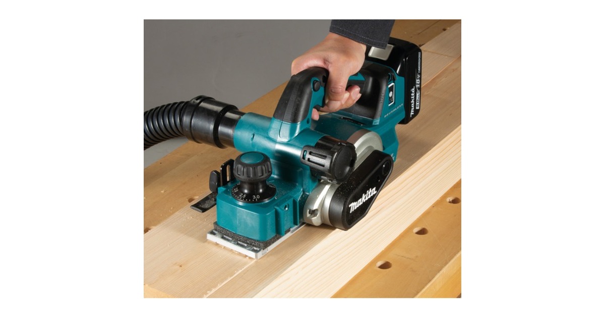 Der MAKITA Akku-Hobel DKP181ZU mit ADT Automatic torque Drive Technology reguliert während des Betriebs automatisch die Drehzahl, um je nach Anforderung eine optimale Leistung zu erzielen. Die leichte und sehr handliche Maschine hat eine große V-Nut für leichtes Anfasen. Der Hobel eignet sich z.B. zum Bearbeiten von Innentüren, Paneelen und Sockelleisten. Die hohe Hobelwellendrehzahl ermöglicht ein einwandfreies Finish der zu bearbeitenden Oberflächen. Der DKP181ZU ist mit HM-Wendemessern und einer Motorbremse ausgestattet. Die Spantiefe lässt sich mit dem leichtgängigen Drehrad mit Rastungen präzise einstellen. Das AWS Auto-Start Wireless System des DKP181ZU sorgt dafür, dass beim Starten der Maschine dank Bluetooth-Verbindung zeitgleich der (separat erhältliche) Staubsauger DVC864LZ mit anläuft und bei Stillstand der Maschine nach einer Nachlaufzeit wieder ausgeht.Art.-Nr.: 1659374