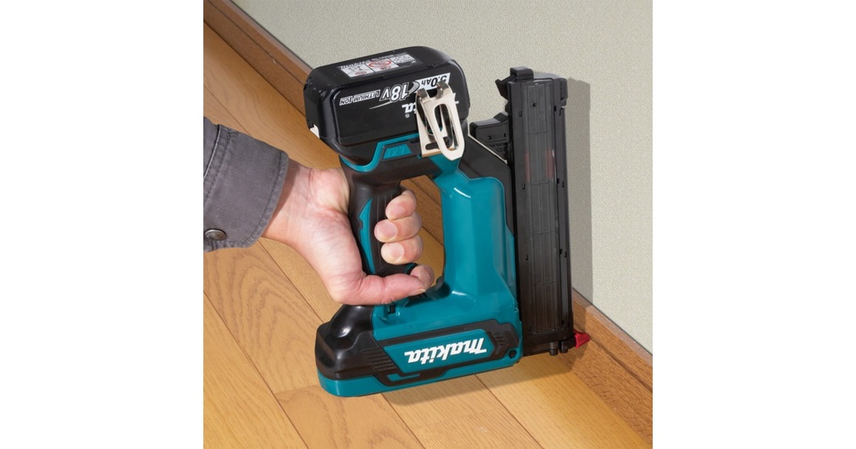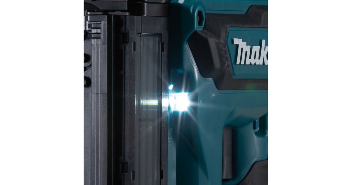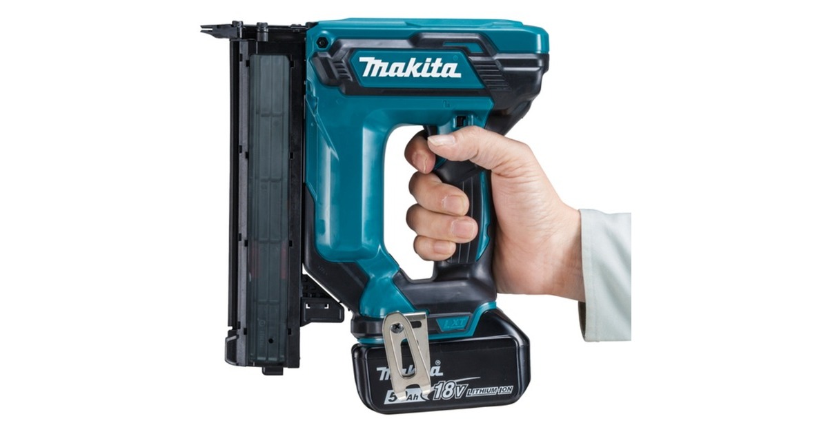 Der Akku-Stauchkopfnagler DFN350Z von Makita ist ein handlicher Nagler, mit dem man unabhängig von der Steckdose oder von Kompressor und Schlauch arbeiten kann. Er eignet sich zum schnellen einfachen Befestigen von Deko-Leisten, Fußleisten, Textilien und ähnlichen Materialien. Ein 5Ah-Akku z.B. reicht für ca. 4.000 Nägel. Es sind unterschiedliche Nagellängen GA18 einsetzbar, von 15 bis 35mm. Darüber hinaus ist der Tiefeneinschlag werkzeuglos einstellbar. Im Bereich Sicherheit überzeugt er mit einer Einschaltsperre und einem Sichtfenster zur Kontrolle des Nagelvorrats. Auch dunklere Arbeitsbereiche sind kein Problem, denn die leuchtstarke LED bringt Licht in die dunkelsten Ecken. XPT (Extreme Protection Technology) schützt das Gehäuse der Maschine gegen Staub und Spritzwasser, auch unter harten Baustellenbedingungen. Art.-Nr.: 1583763