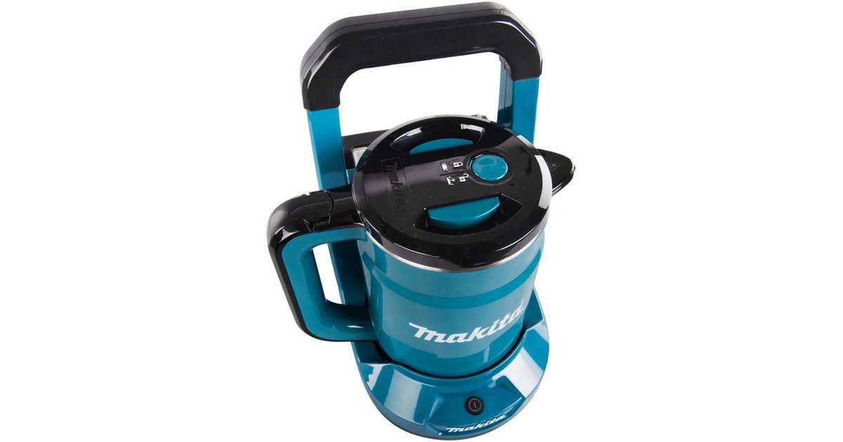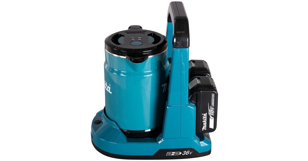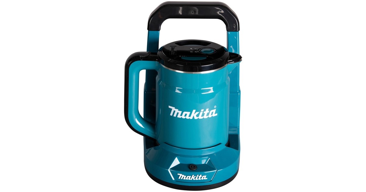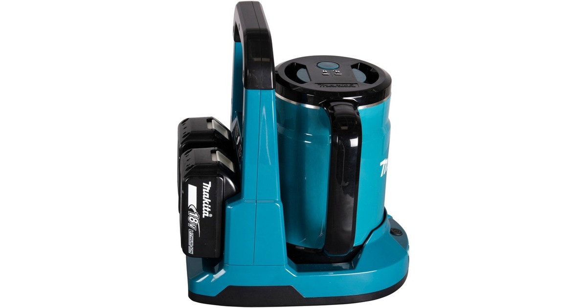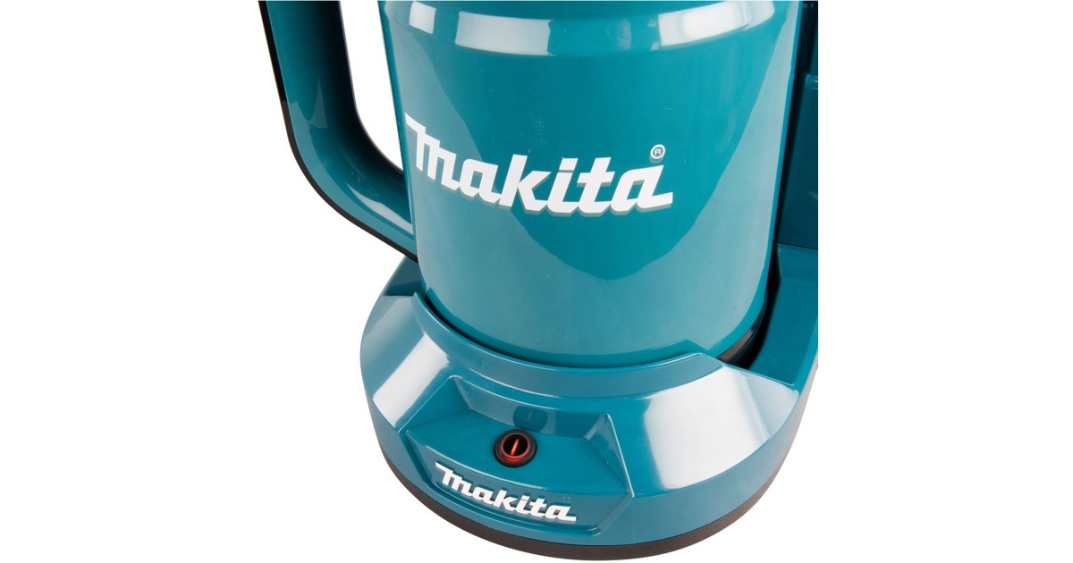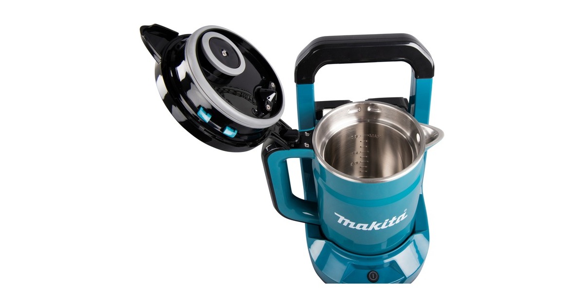 Der mobile Akku-Wasserkocher von Makita sorgt mit 2 x 18 V, für bis zu 800 ml kochendes Wasser in 8-9 Minuten. So eignet er sich ideal für Baustellen oder fürs Camping. Der doppelwandig isolierte Akku-Wasserkocher ist mit einem stabilen, stoßfesten Kunststoffgehäuse sowie Kochstoppautomatik und Trockenlaufschutz ausgestattet. Dazu verfügt der DKT360Z über einen Tragegriff und Überlaufschutz, so wird ein ungewolltes Auslaufen beim Transport verhindert. Art.-Nr.: 1819272