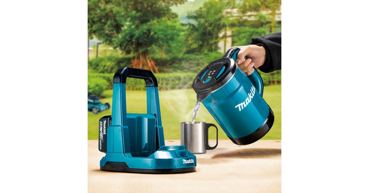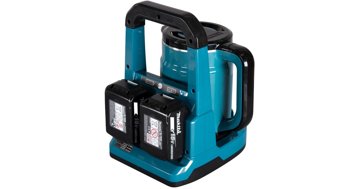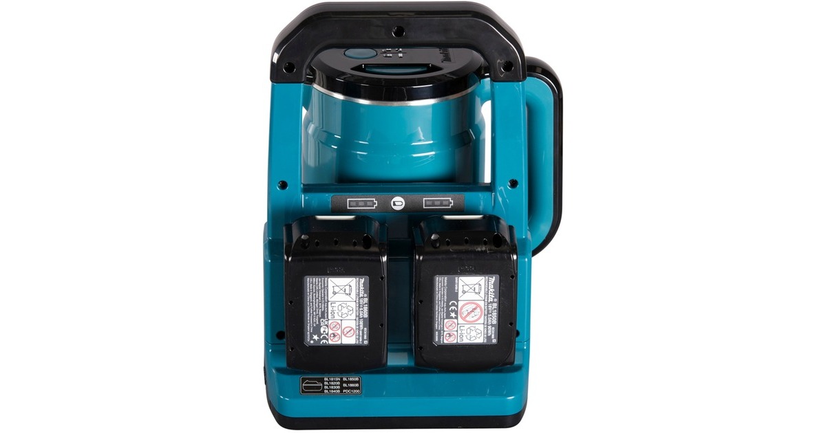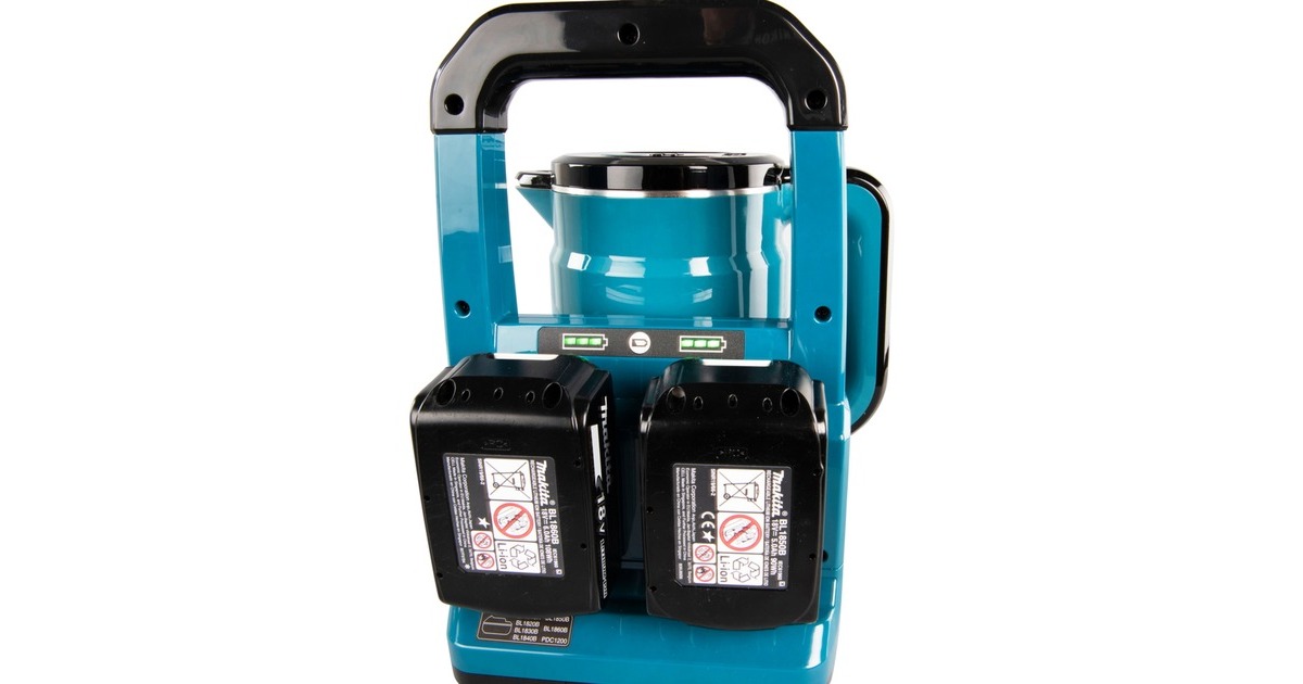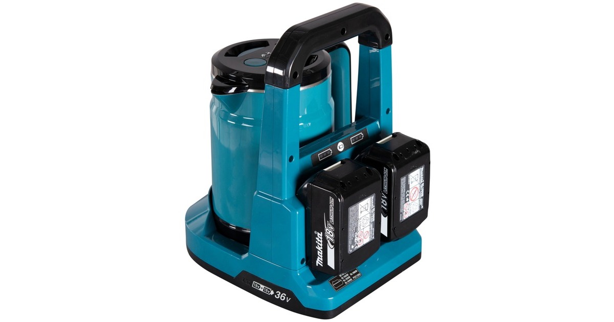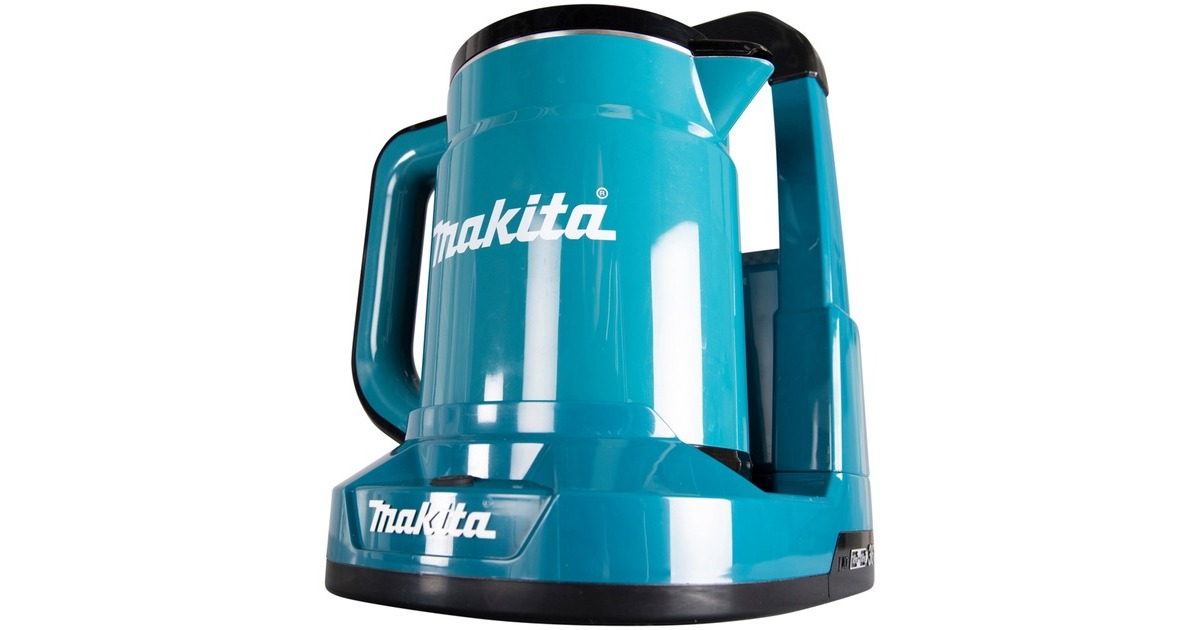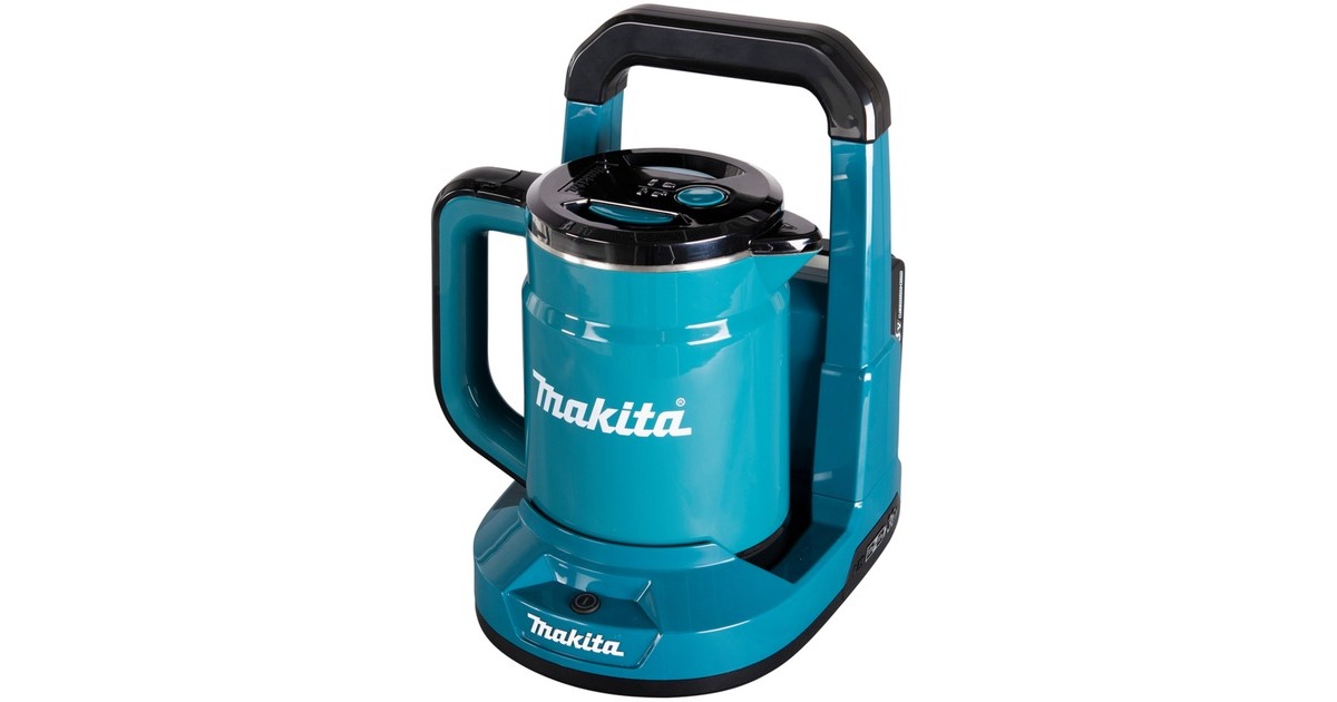 Der mobile Akku-Wasserkocher von Makita sorgt mit 2 x 18 V, für bis zu 800 ml kochendes Wasser in 8-9 Minuten. So eignet er sich ideal für Baustellen oder fürs Camping. Der doppelwandig isolierte Akku-Wasserkocher ist mit einem stabilen, stoßfesten Kunststoffgehäuse sowie Kochstoppautomatik und Trockenlaufschutz ausgestattet. Dazu verfügt der DKT360Z über einen Tragegriff und Überlaufschutz, so wird ein ungewolltes Auslaufen beim Transport verhindert. Art.-Nr.: 1819272