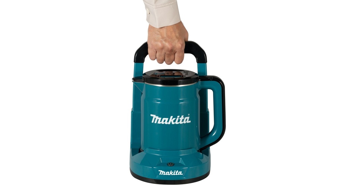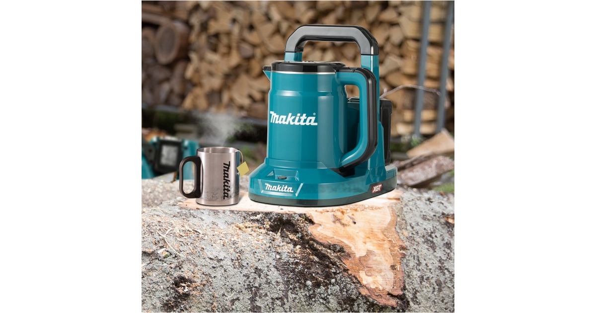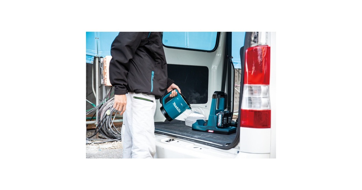 Der mobile Akku-Wasserkocher von Makita sorgt mit max. 40V, für bis zu 800 ml kochendes Wasser auf Baustellen oder beim Camping ganz ohne Stromanschluss und Feuer. Ein zweiter Akku-Steckplatz sorgt für die doppelte Menge an kochendem Wasser. Der doppelwandig isolierte Akku-Wasserkocher ist mit einem stabilen, stoßfesten Kunststoffgehäuse sowie Trockenlaufschutz und Akkuladestandanzeige ausgestattet. Dazu verfügt der KT001GZ über eine automatische Abschaltung nach dem Kochen mit Warnsummer, einen Tragegriff und Überlaufschutz, der beim Transport ein ungewolltes Auslaufen beim Transport verhindert.