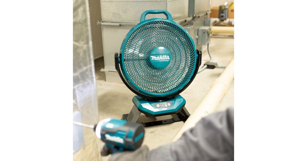 Der CF002GZ Akku-Lüfter von Makita steht stabil auf einem breiten Standfuß und beschleunigt das Trocknen von Farbe oder Spachtelmasse. Zusätzlich bietet der Ventilator Komfort bei heißem Wetter. Durch eine innovative Gehäusekonstruktion ist er besonders geräuscharm. Der CF002GZ lässt sich um 90° nach oben und um 45° nach untern neigen. Zusätzlich ist auch ein automatisches Schwenken um 180° zuschaltbar. Der Ventilator kann mit dem beiliegenden Steckernetzteil oder einem 40 Volt Akku des XGT-Systems betrieben werden.Art.-Nr.: 1781464